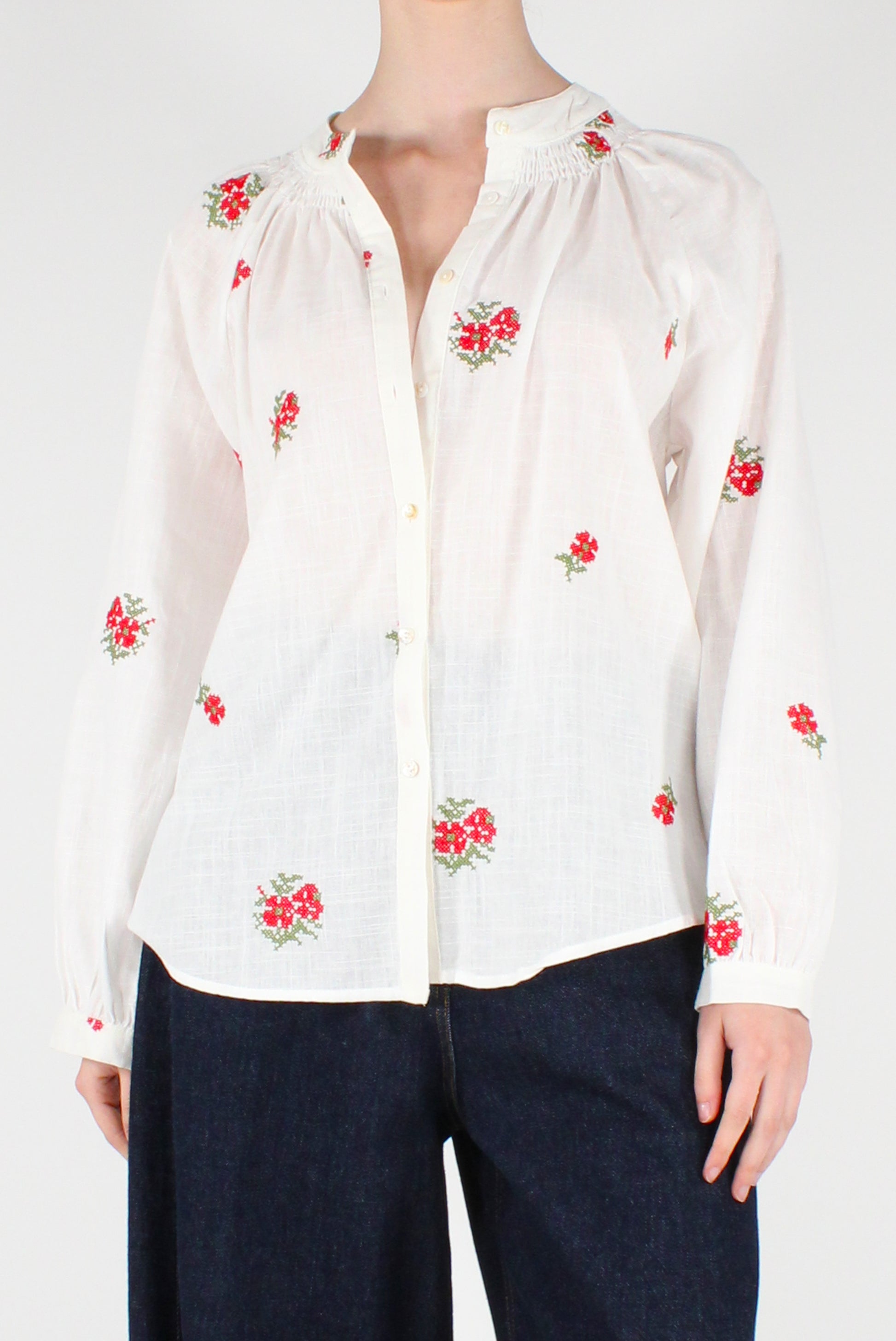 Camicia da donna in cotone con ricamo floreale a punto croce. Modello con colletto alla coreana, dettaglio elastico sul collo e chiusura con bottoni. Maniche lunghe e fondo leggermente stondato, per una linea femminile e contemporanea.