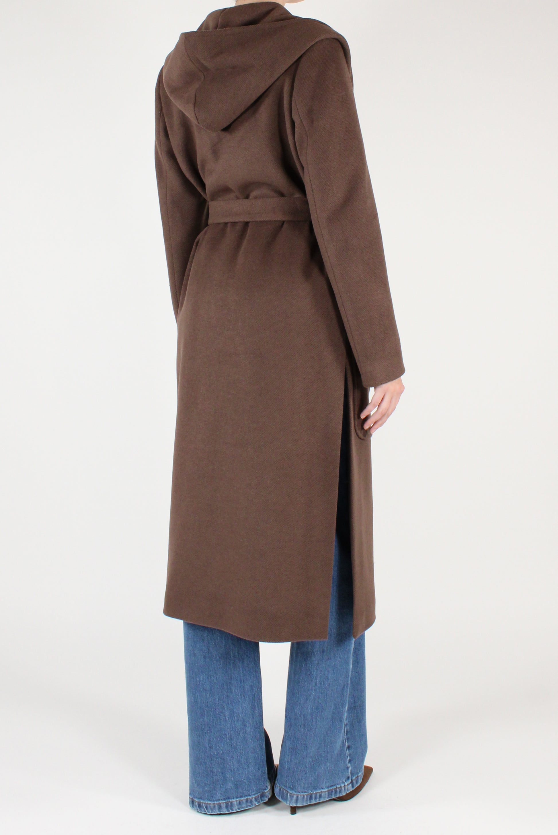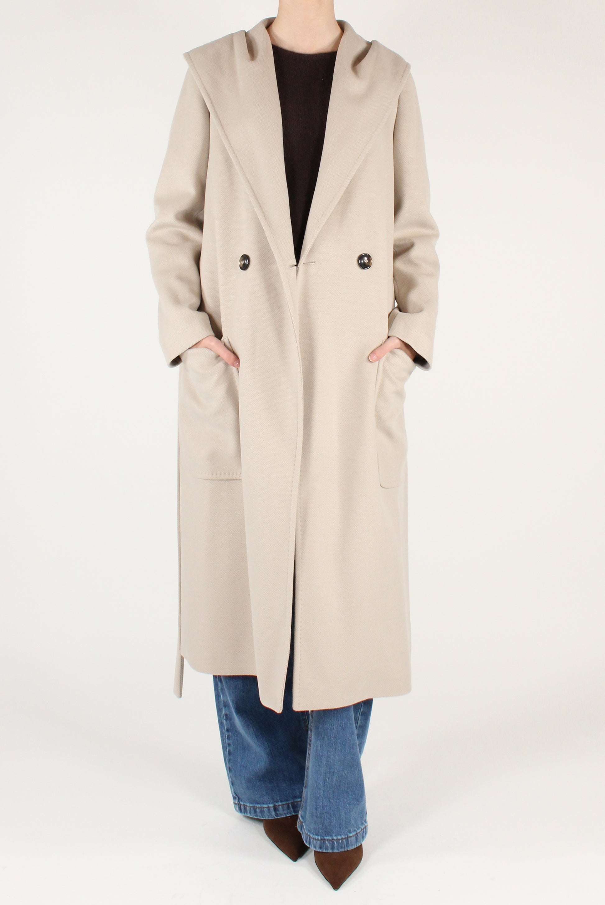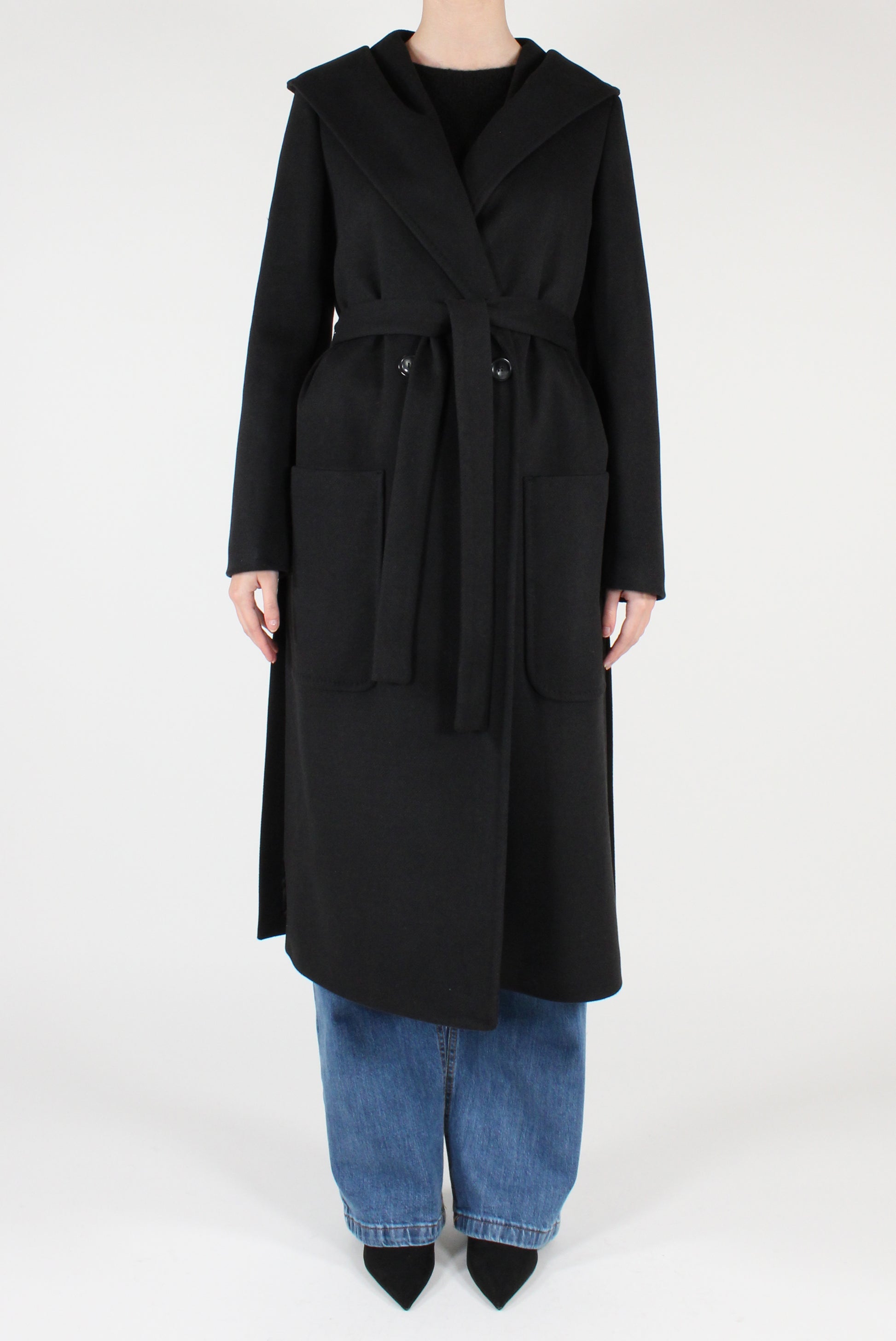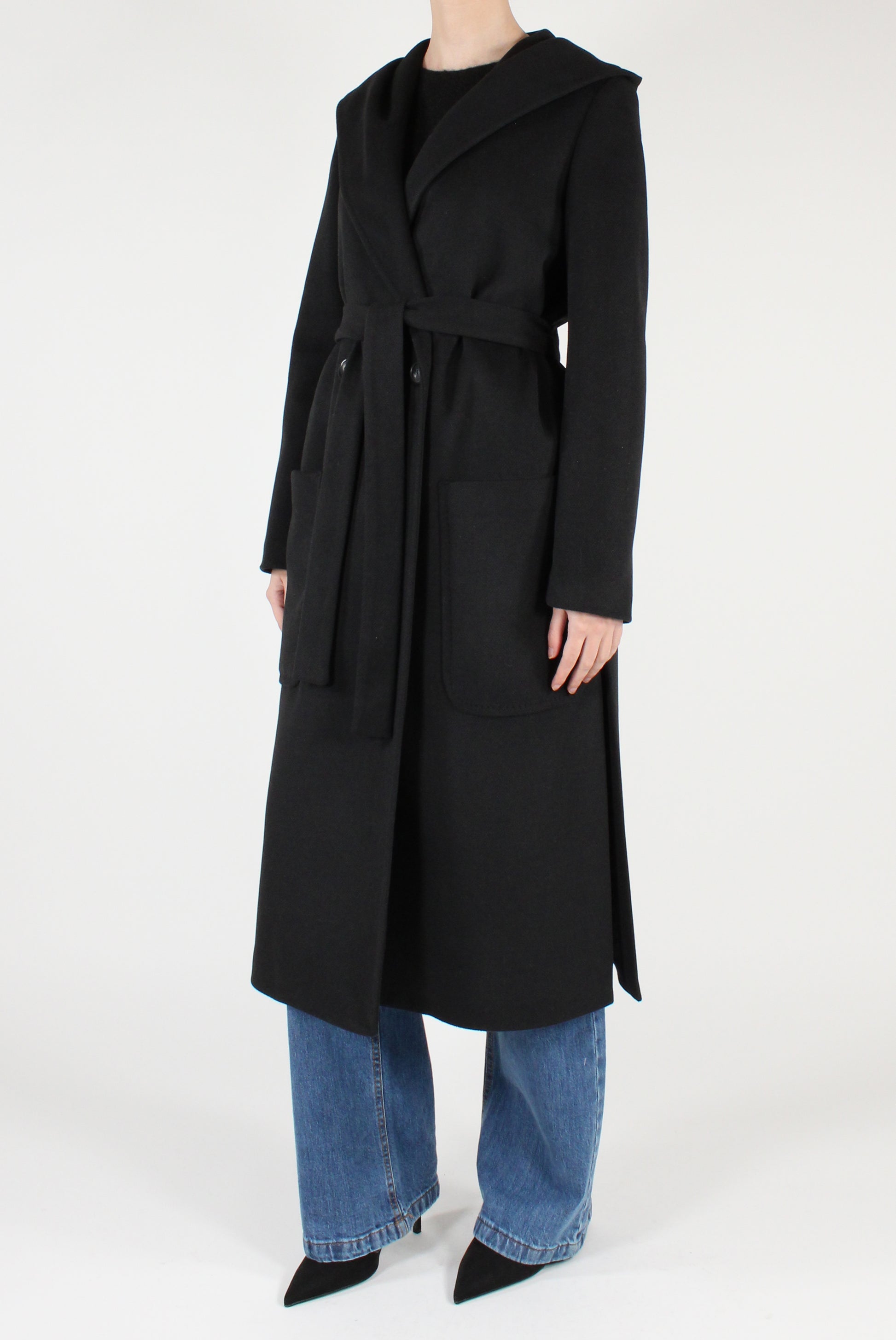 Cappotto doppiopetto con cappuccio. Allacciatura a bottoni, con cintura inclusa removibile e ampia tasche applicate. Dettaglio spacchi laterali, completamente foderato.