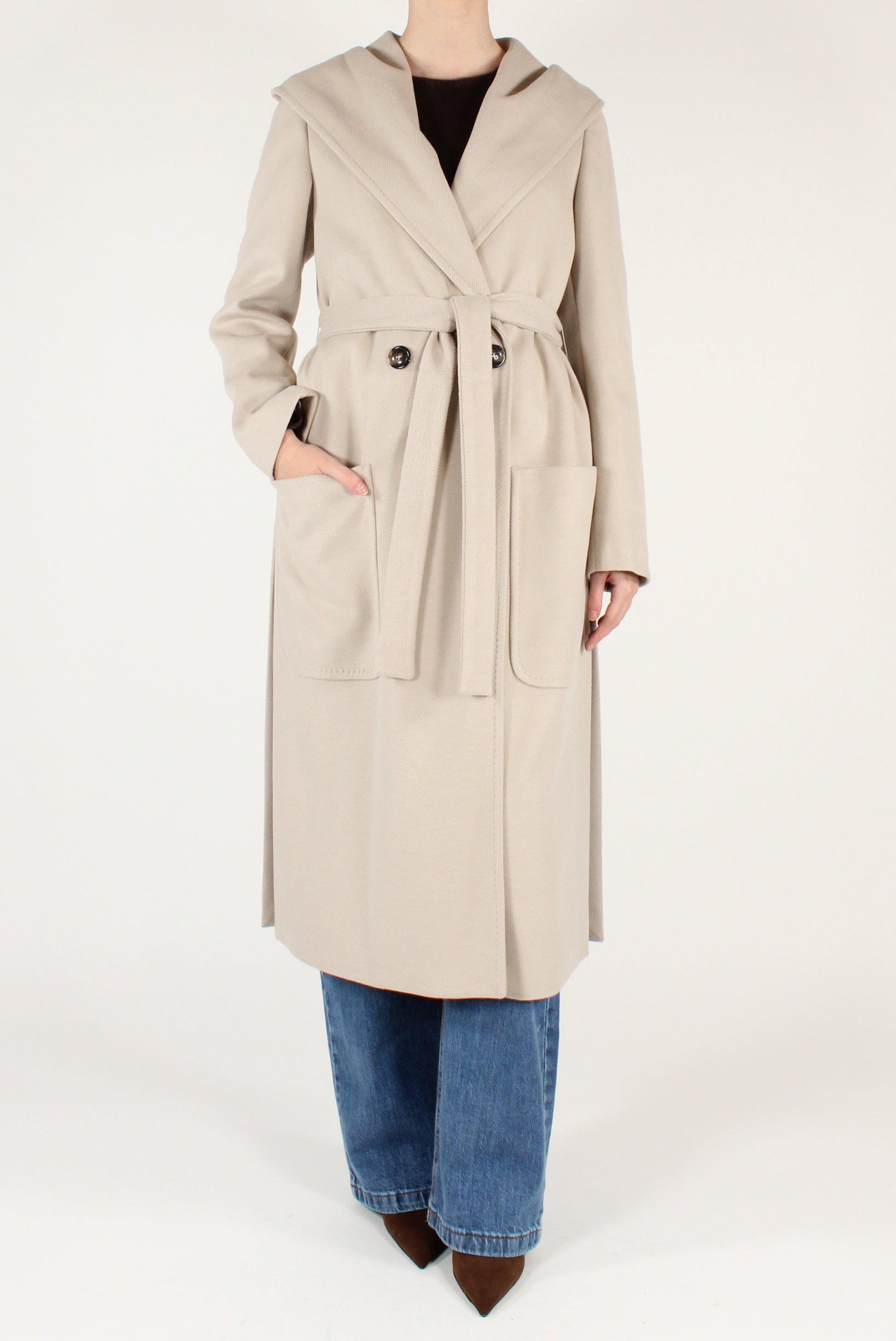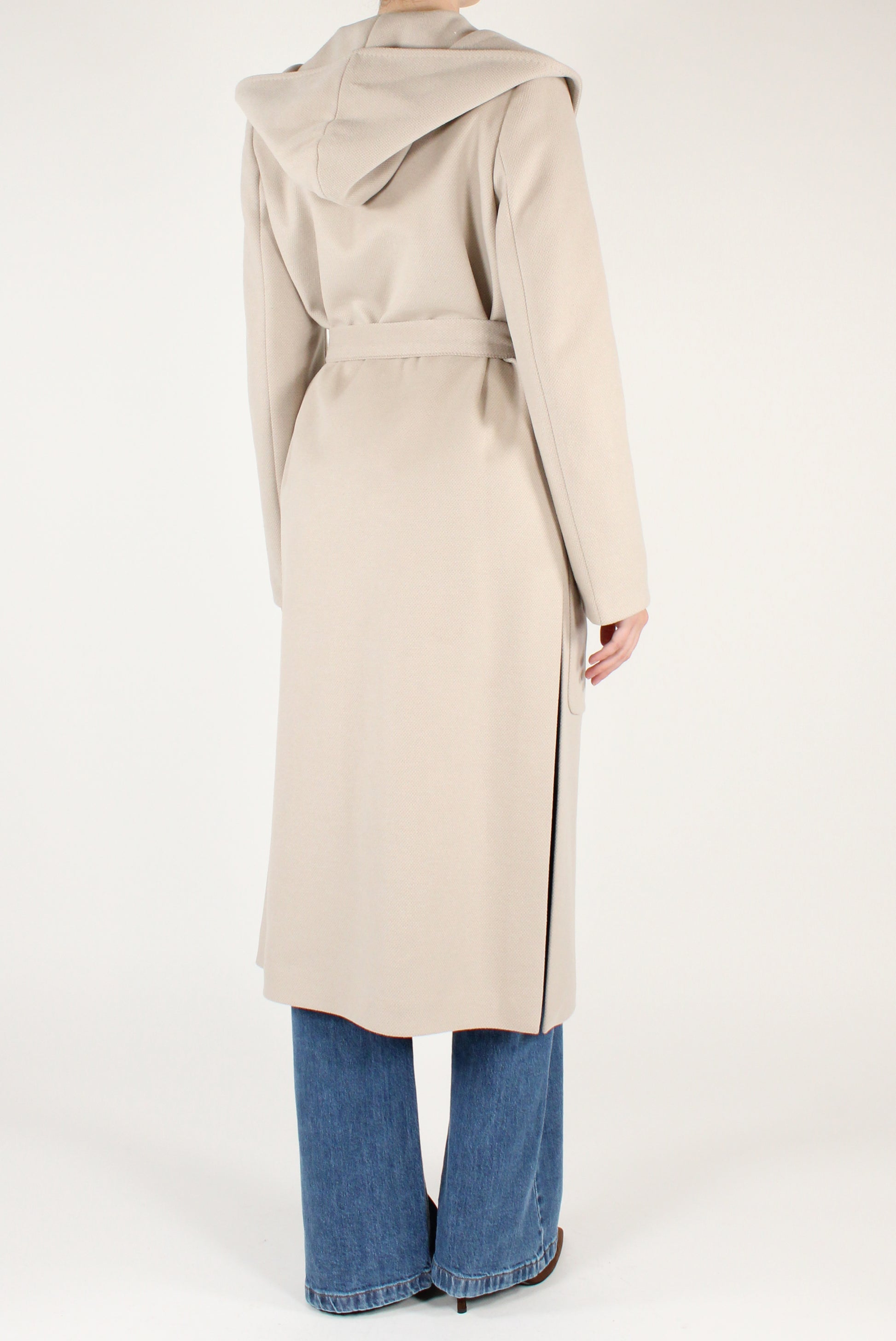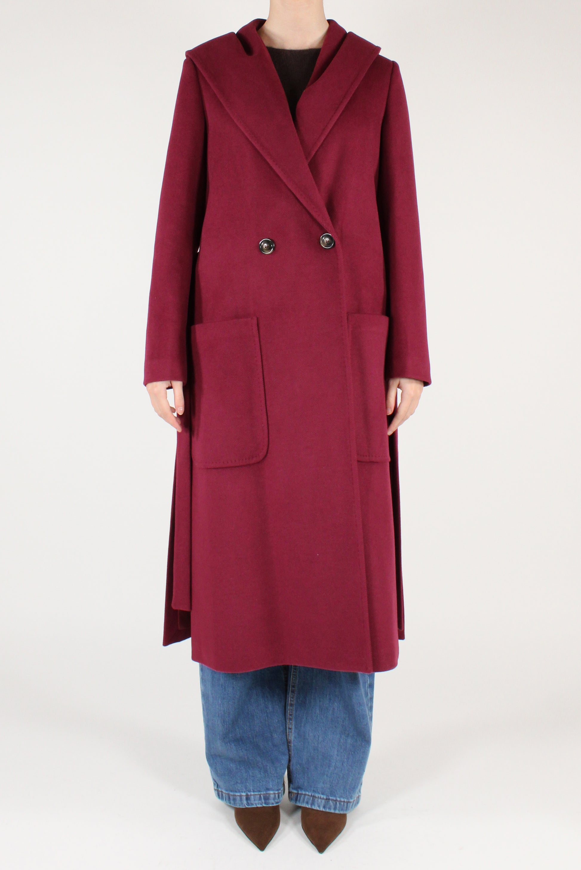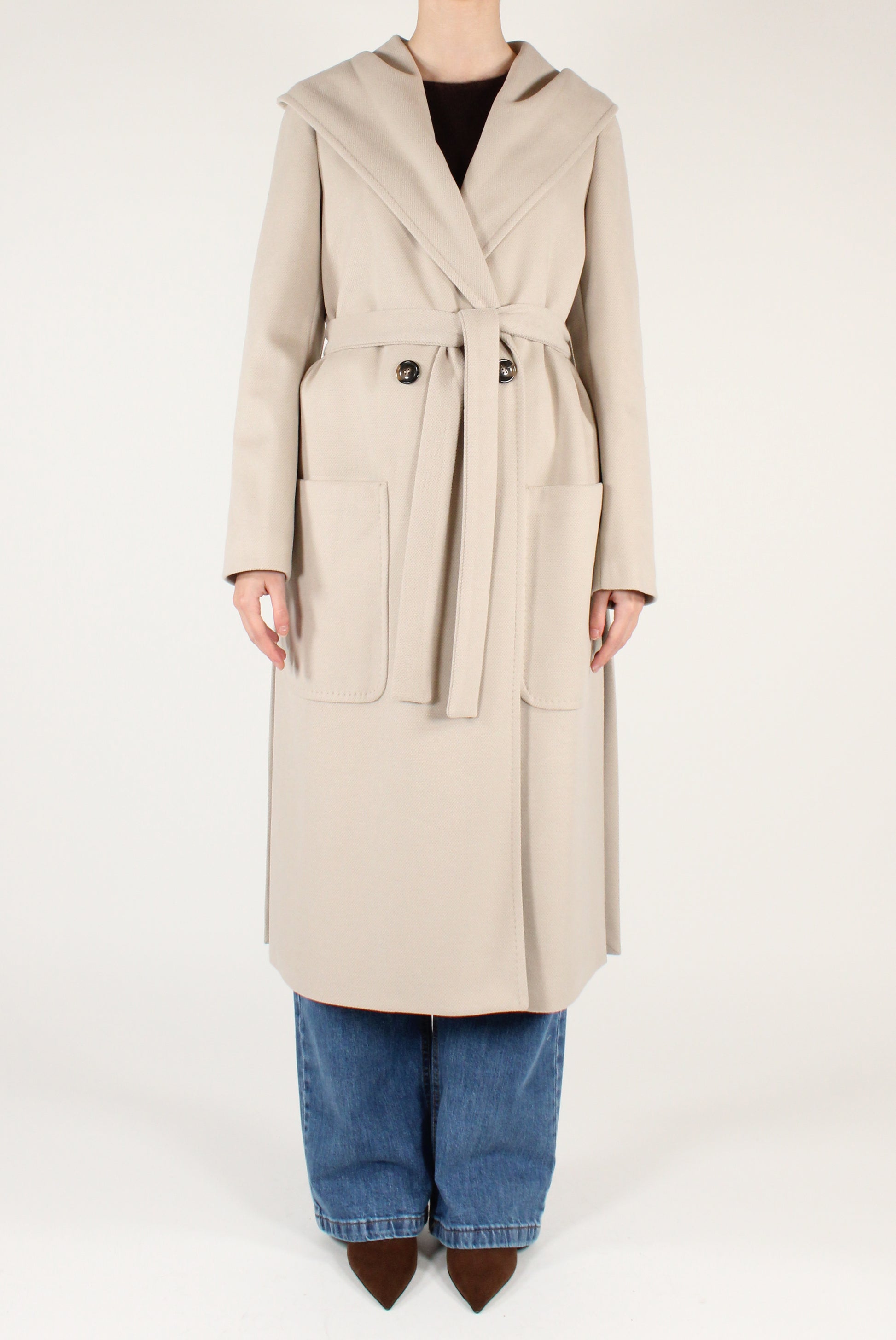 Cappotto doppiopetto con cappuccio. Allacciatura a bottoni, con cintura inclusa removibile e ampia tasche applicate. Dettaglio spacchi laterali, completamente foderato.