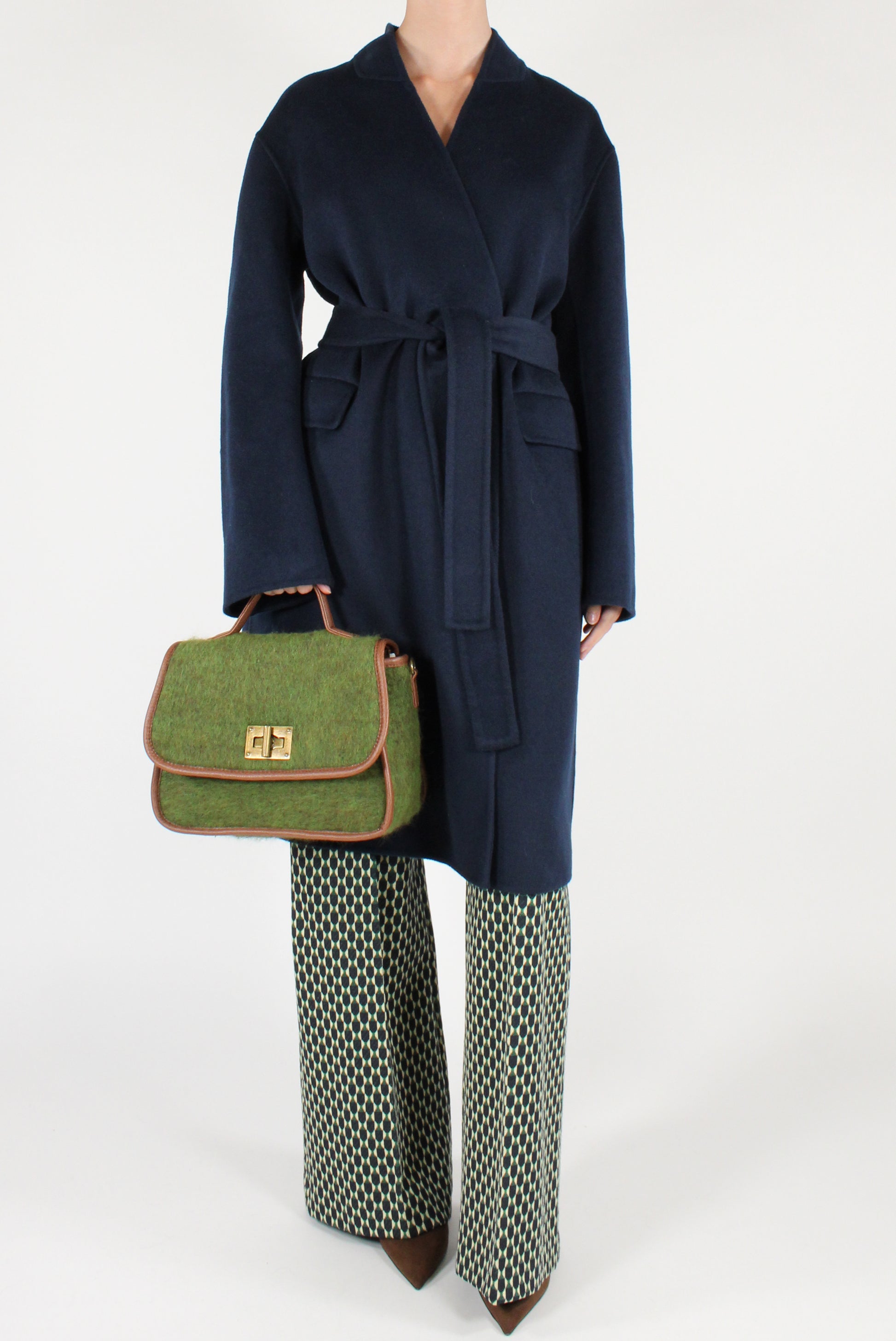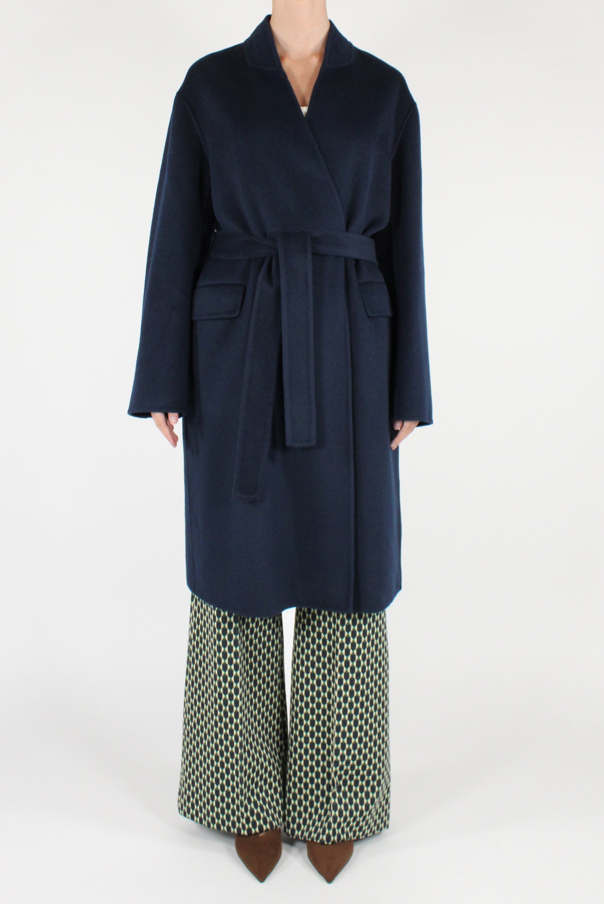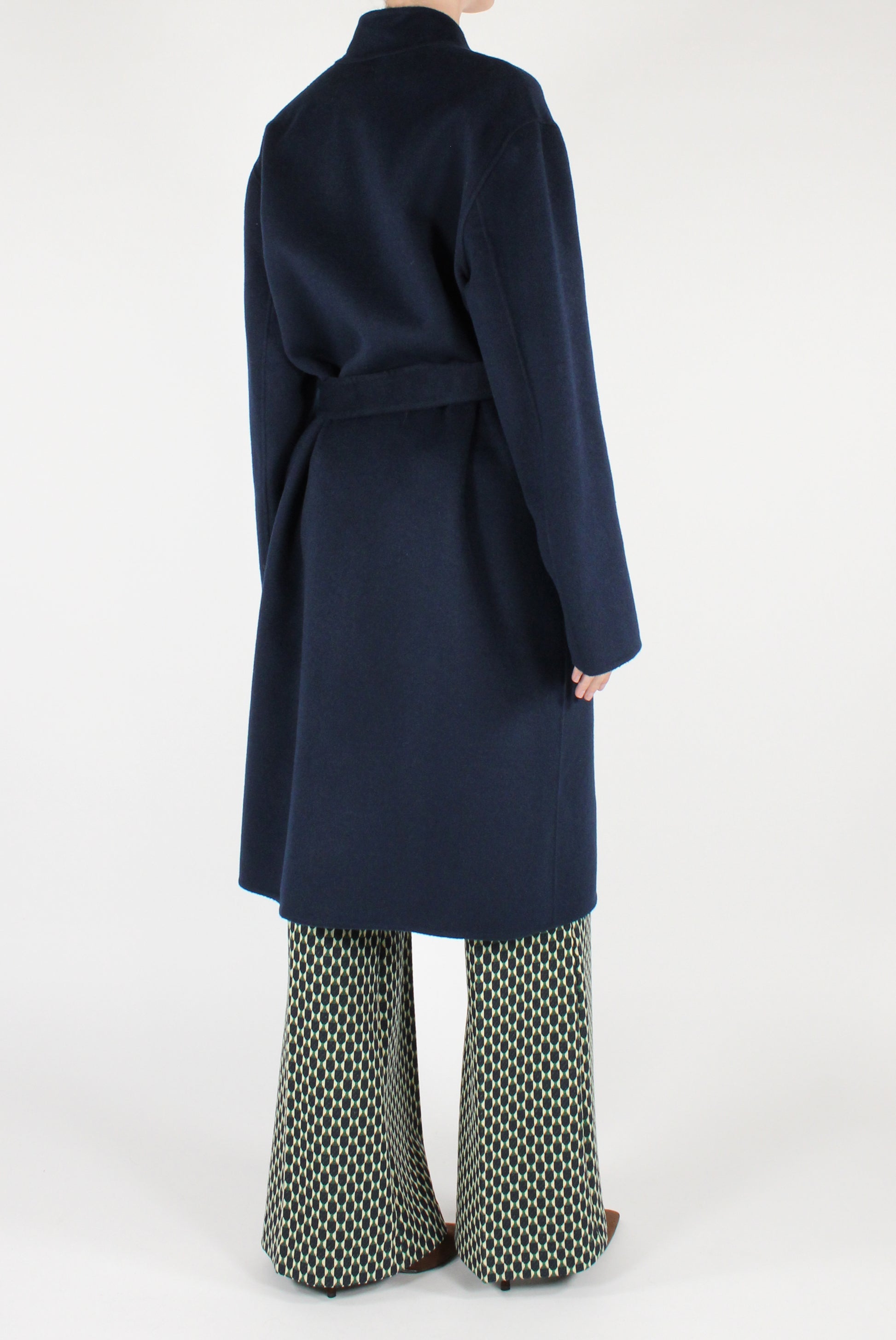 Cappotto in misto lana con cintura inclusa removibile. A maniche lunghe, revers a scialle ed allacciatura doppiopetto con bottoni a pressione. A spalle scese, con tasche a patta laterali, con passanti. Sfoderato.