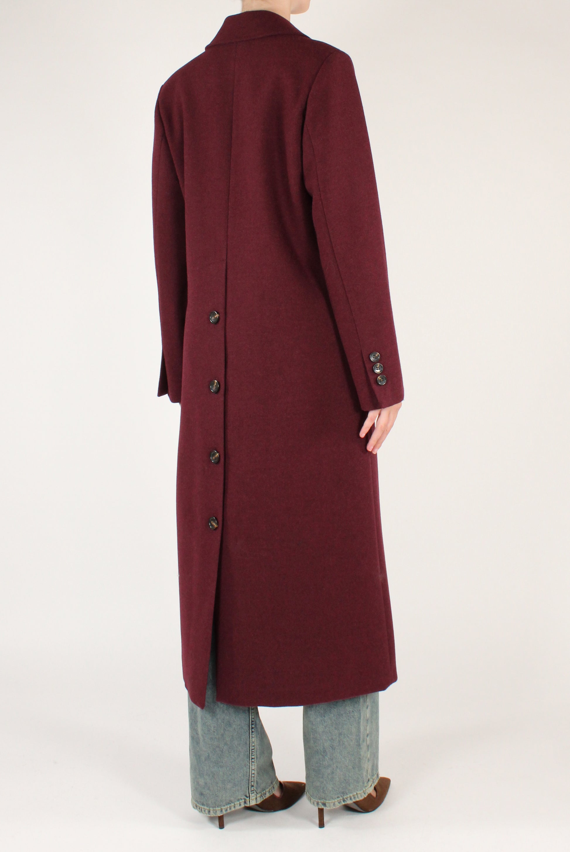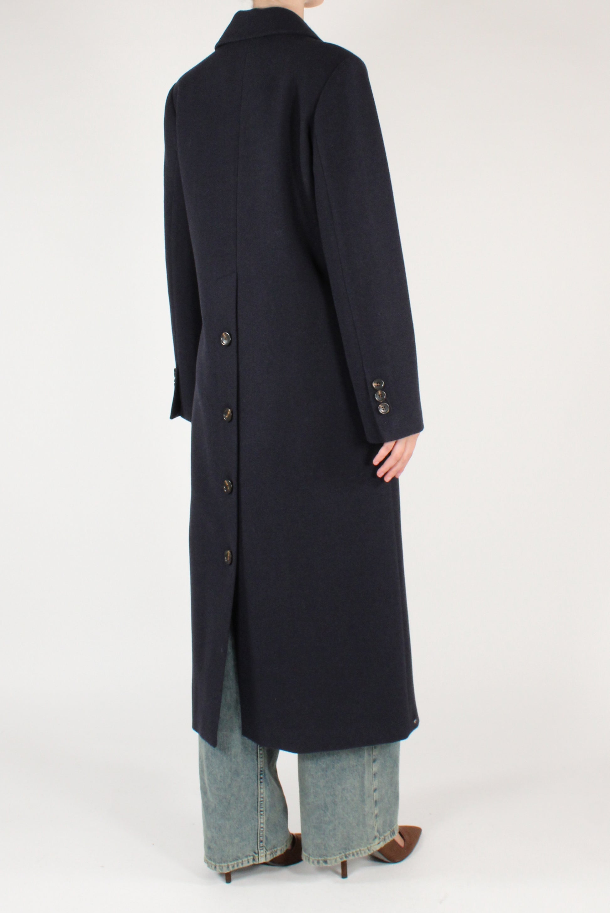 Cappotto lungo doppiopetto. Con revers a lancia, allacciatura a bottoni e tasche a patta. Spacco sul retro con dettaglio bottoni. Completamente foderato.