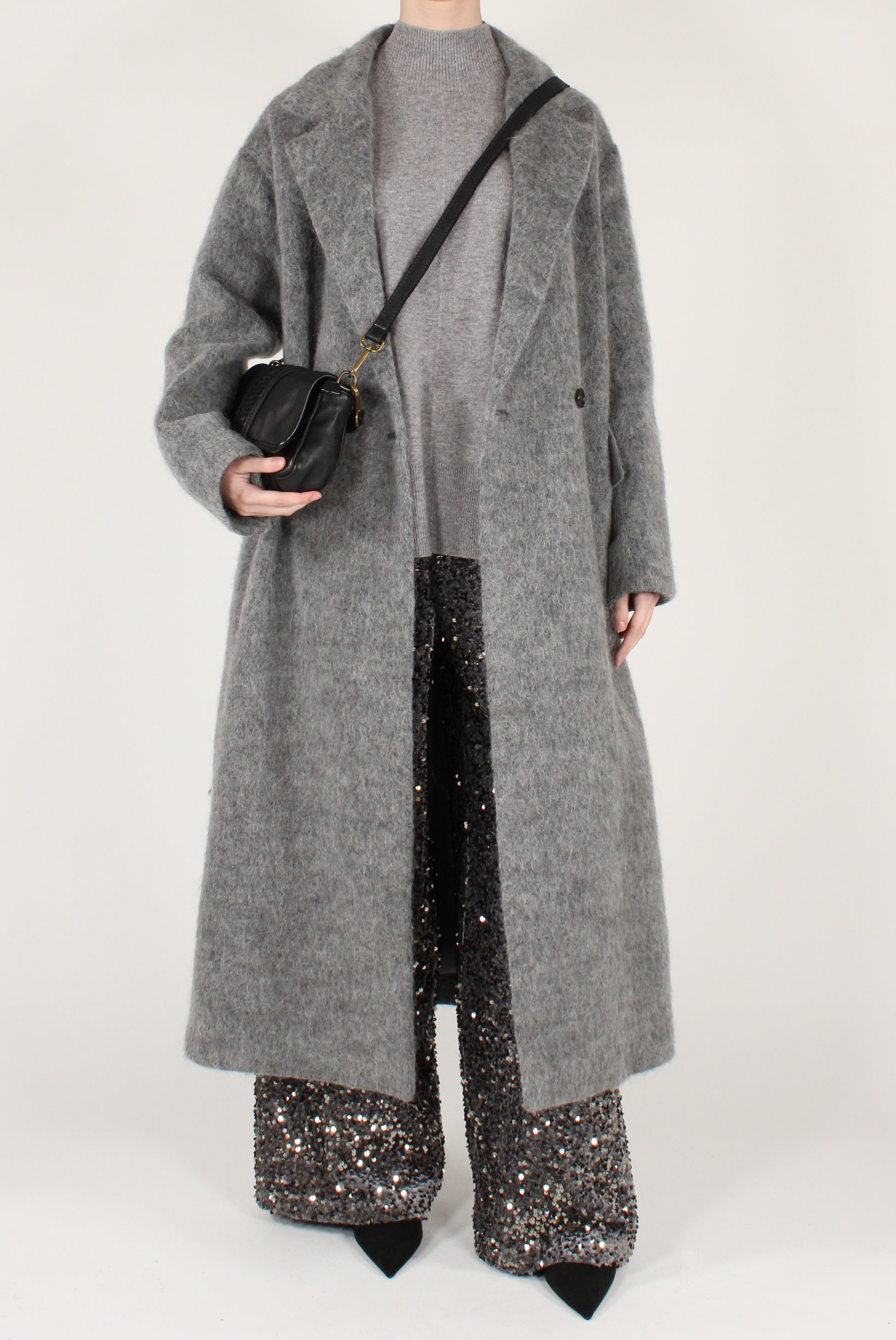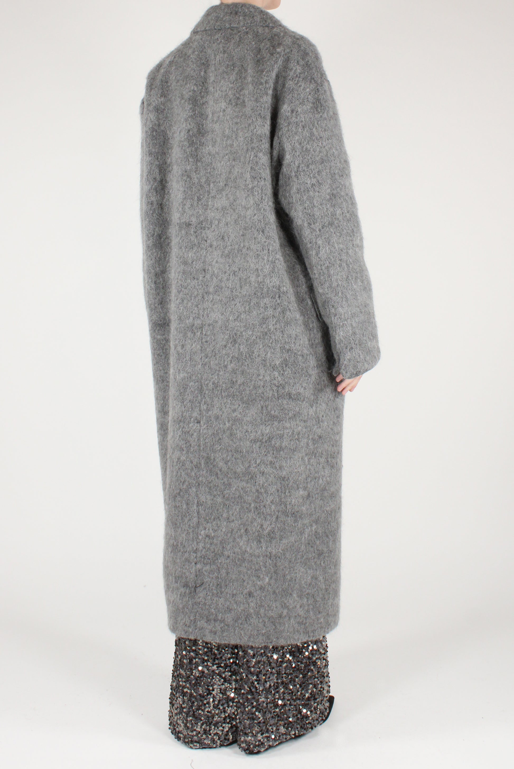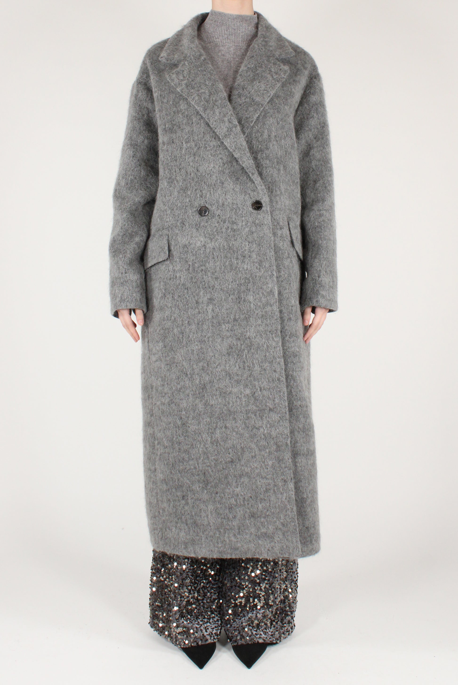 Cappotto lungo doppiopetto in misto lana con alpaca. Revers classici, allacciatura a doppio bottone. Con tasche laterali e dettaglio finte tasche a patta davanti. Completamente foderato.