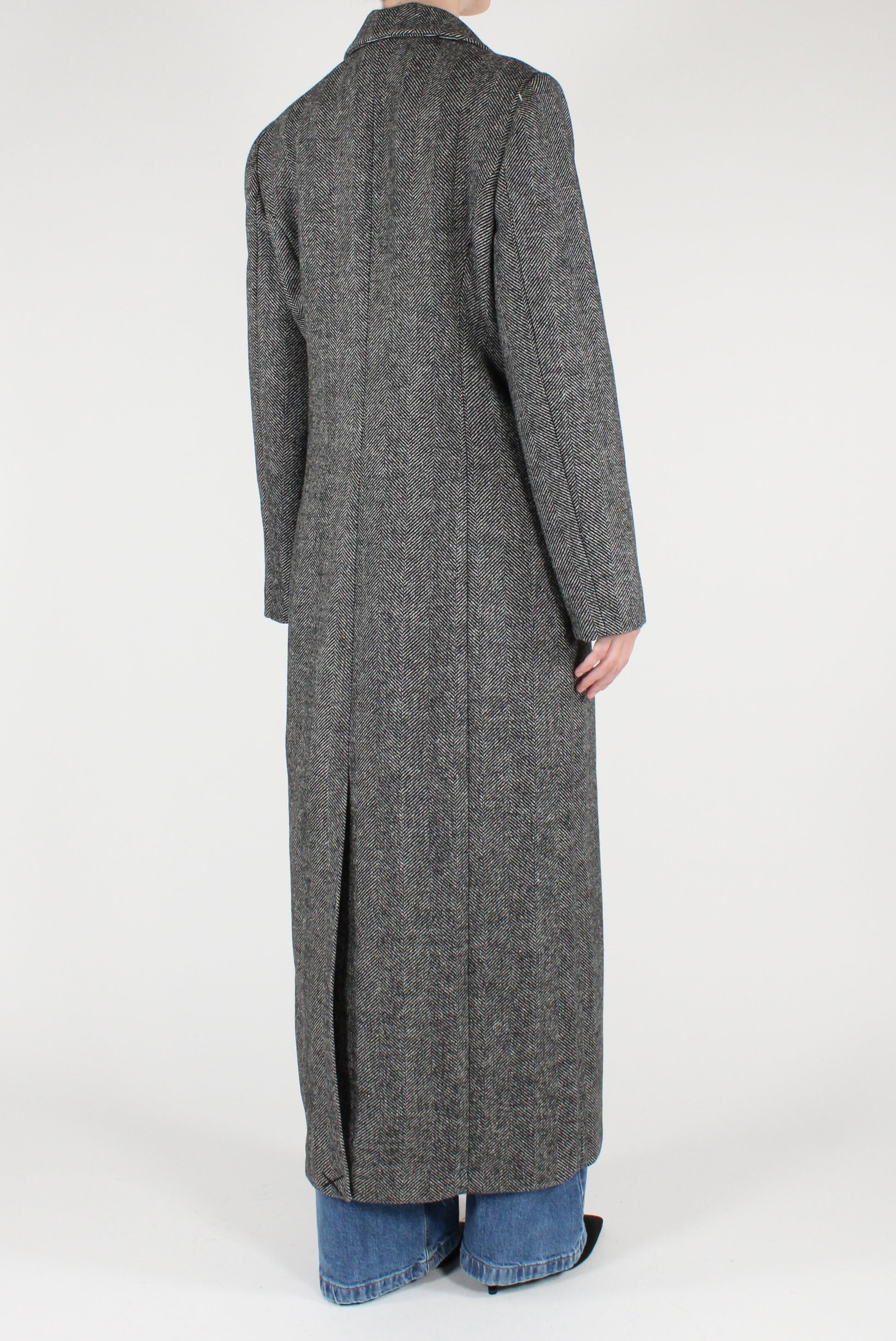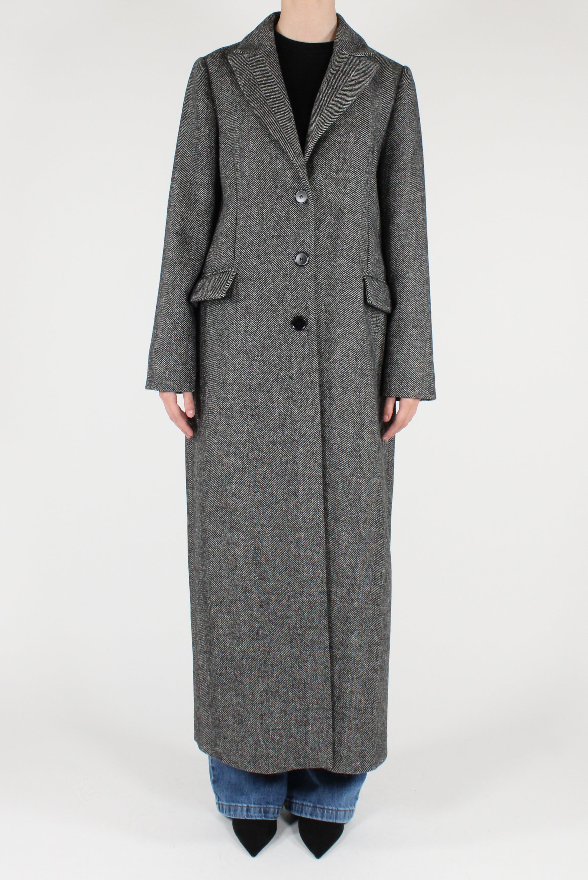 Cappotto lungo monopetto spigato in misto lana. Ampi revers a lancia, a maniche lunghe con allacciatura a bottoni e tasche a patta. Completamente foderato, dettaglio spacco sul retro.