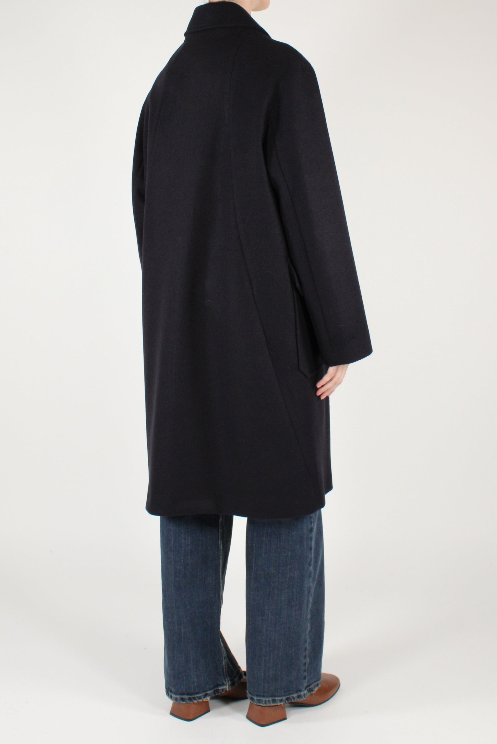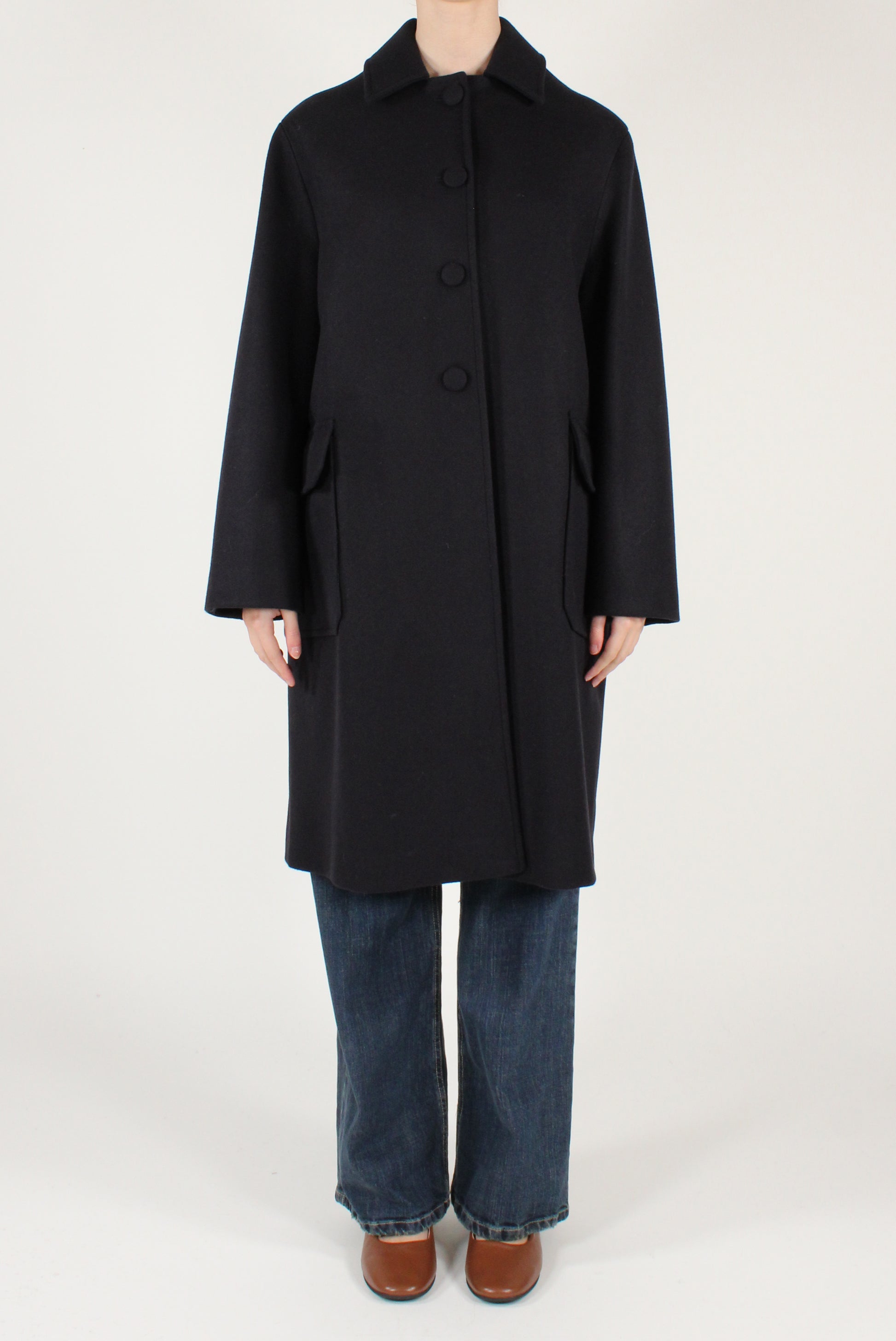 Cappotto monopetto tasche a patta applicate. Colletto classico, allacciatura a bottoni foderati in tessuto. Lunghezza midi, completamente foderato.