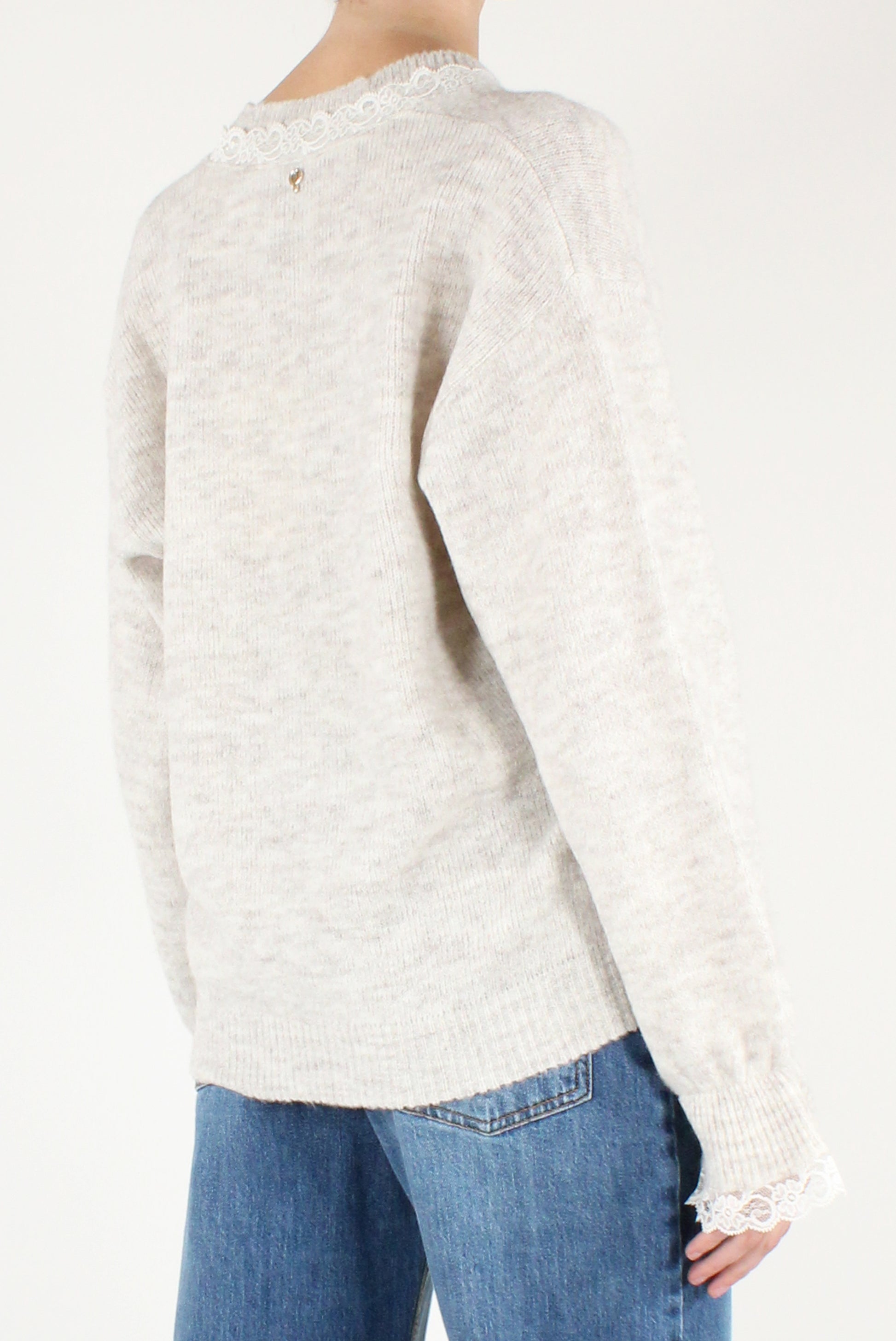 Cardigan con profili in pizzo applicato in misto lana. Scollo a V, a maniche lunghe con elastico ai polsi. Allacciatura a bottoni, con tasche applicate.