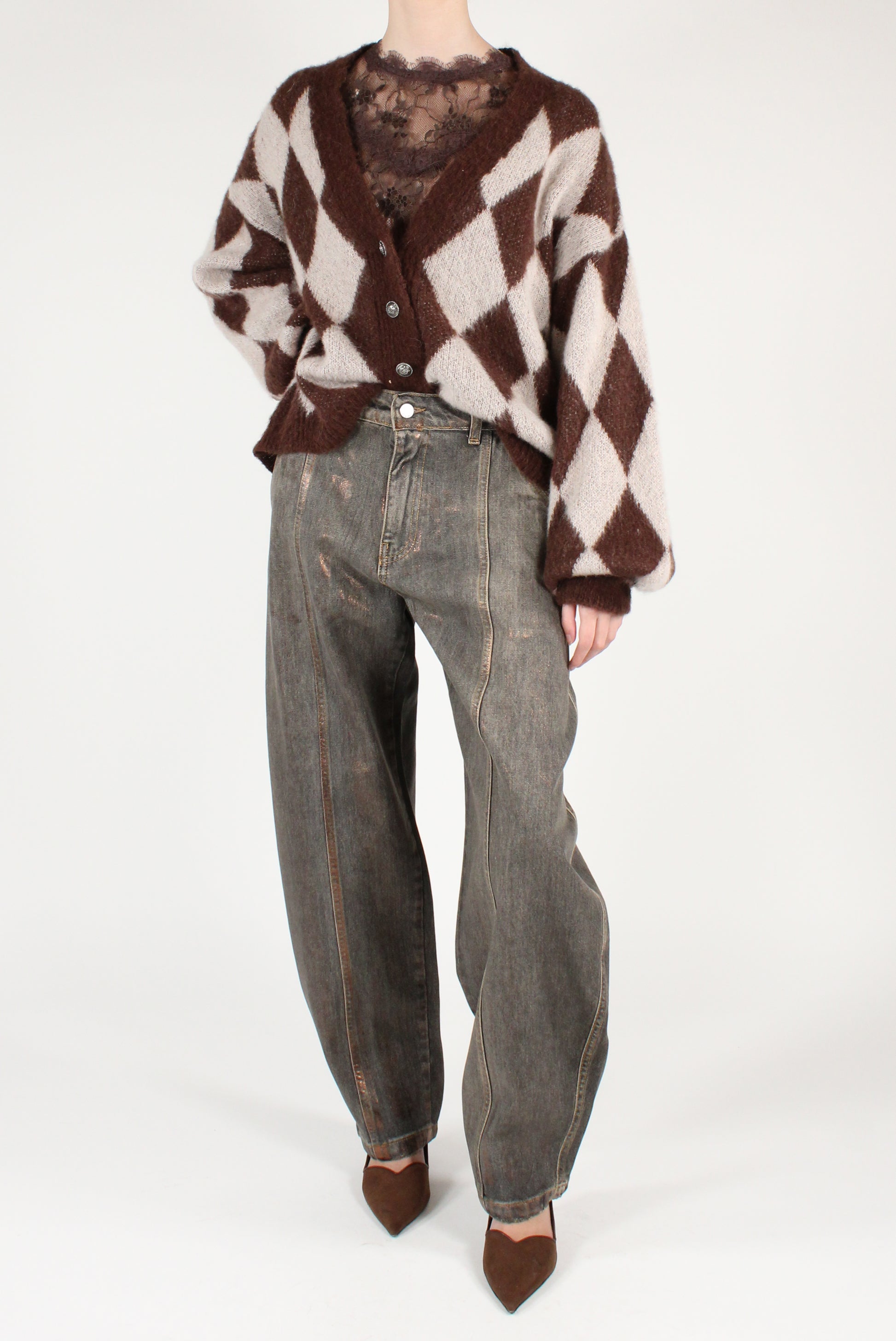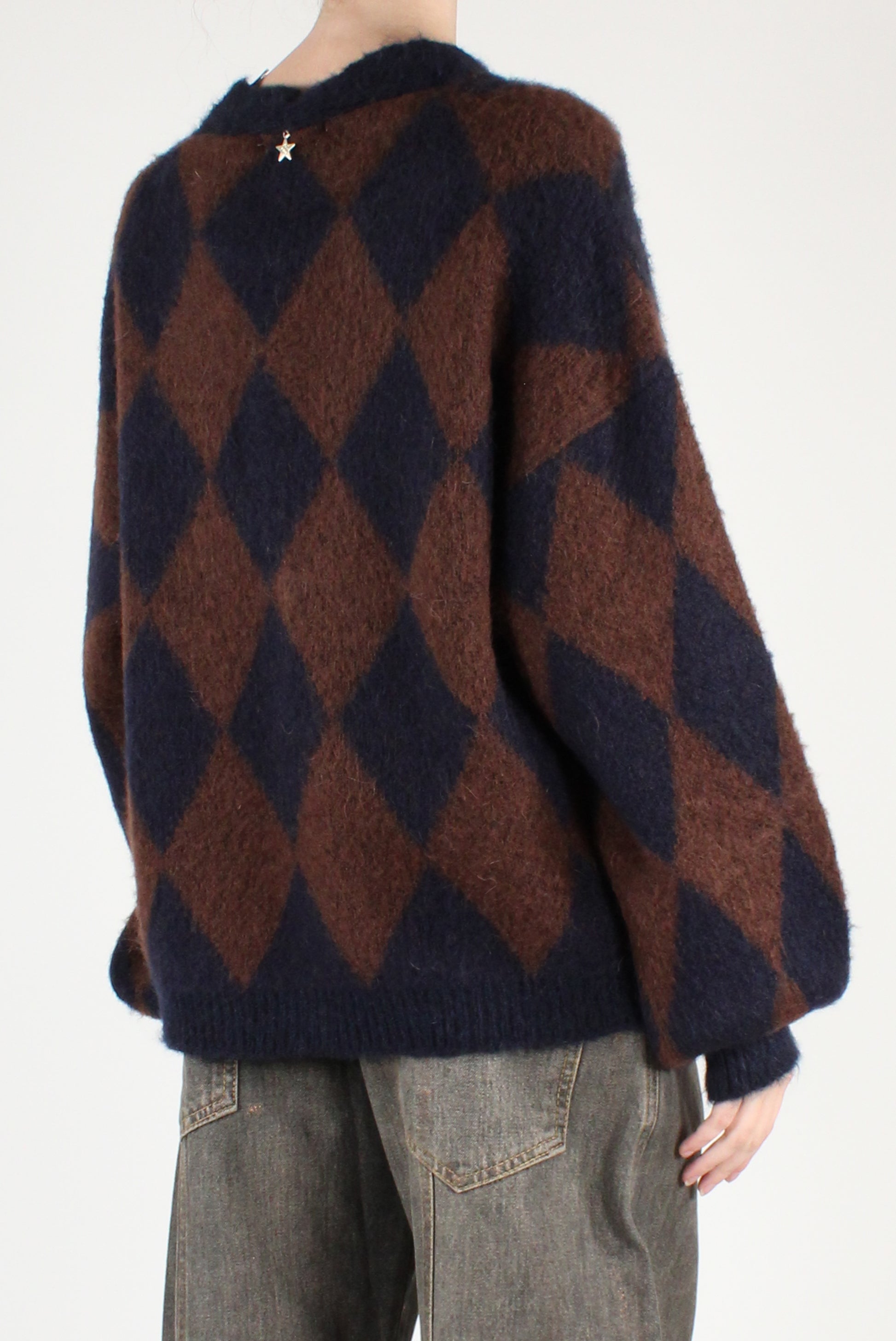 Cardigan over fantasia rombi bicolore. Scollo a V, allacciatura a bottoni con stemma.