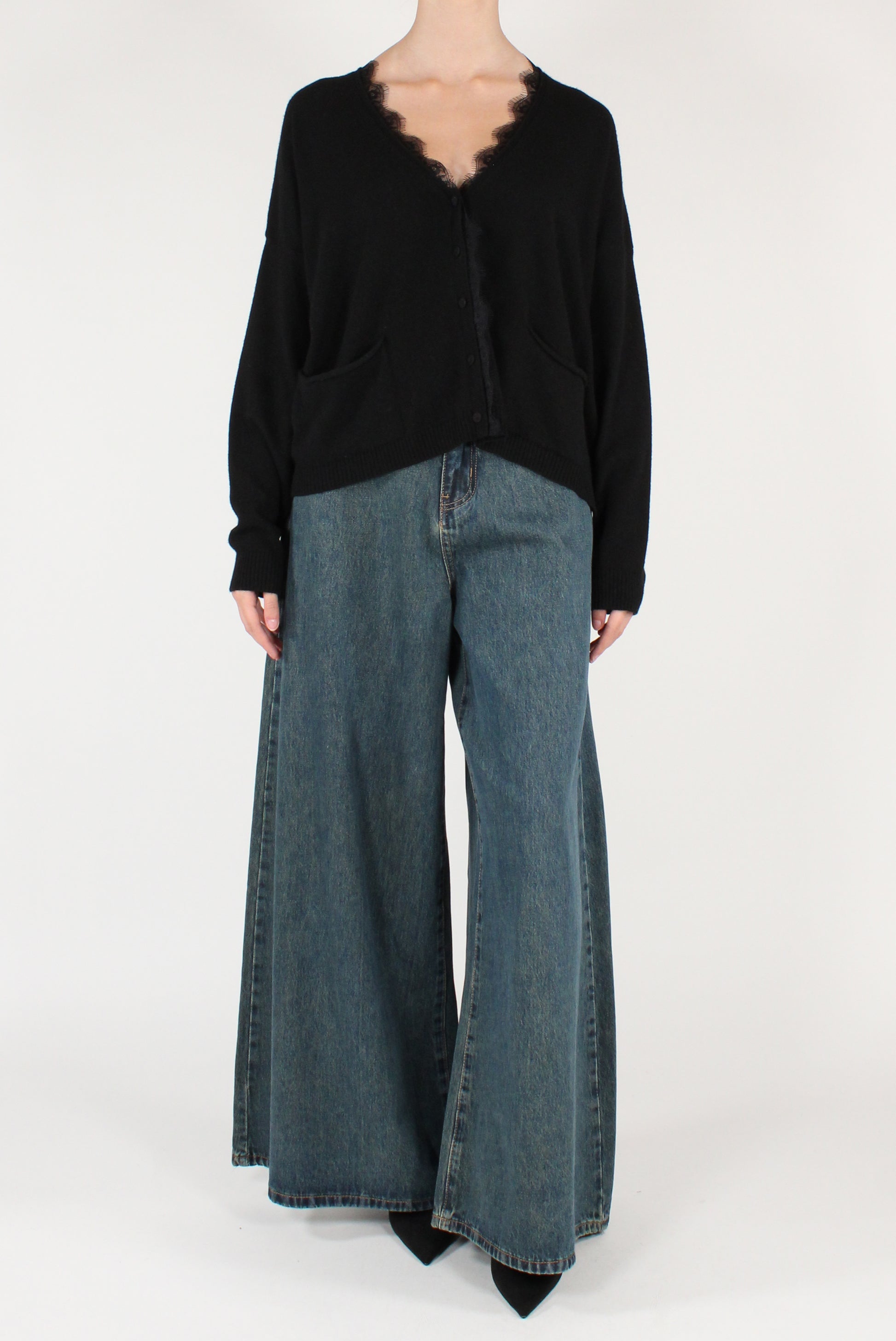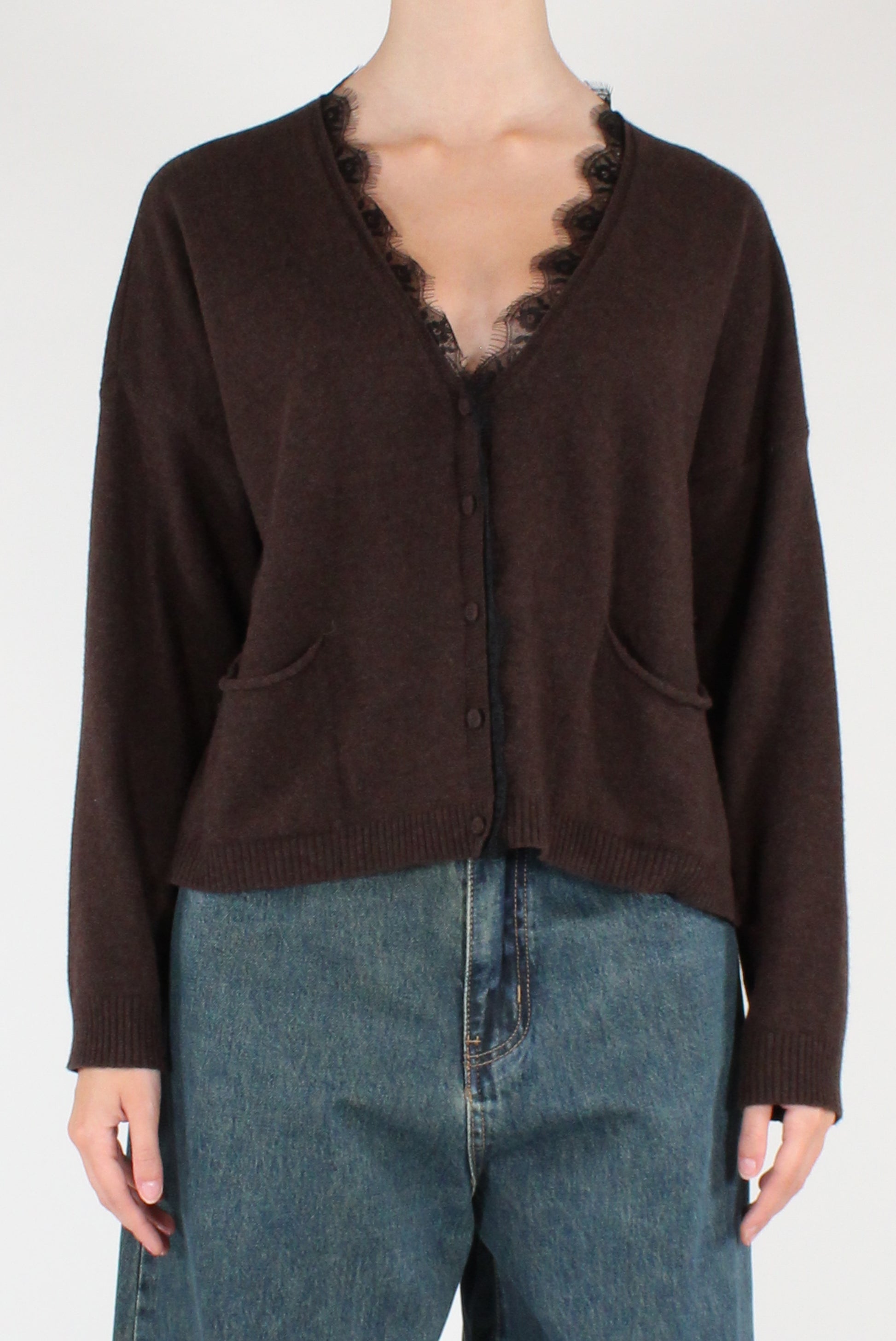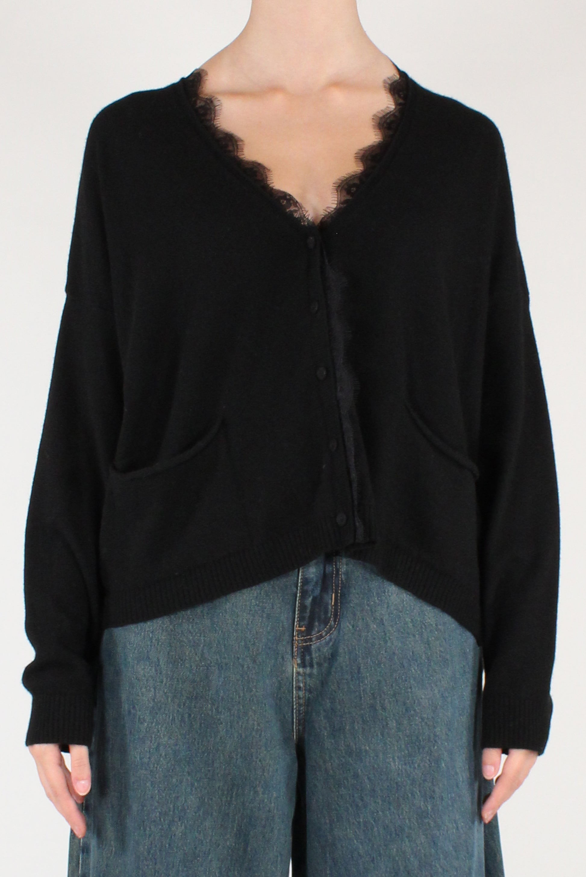 Cardigan scollo a V con pizzo applicato, in misto lana. A maniche lunghe, taglio a scatola con allacciatura a bottoni foderati in maglia. Con tasche applicate.