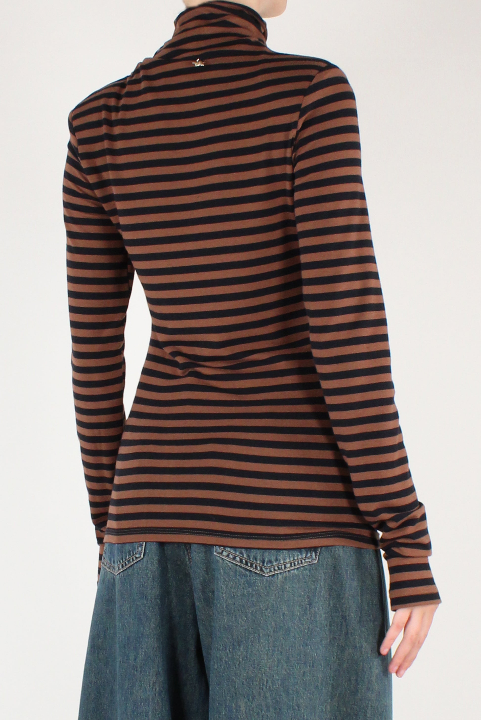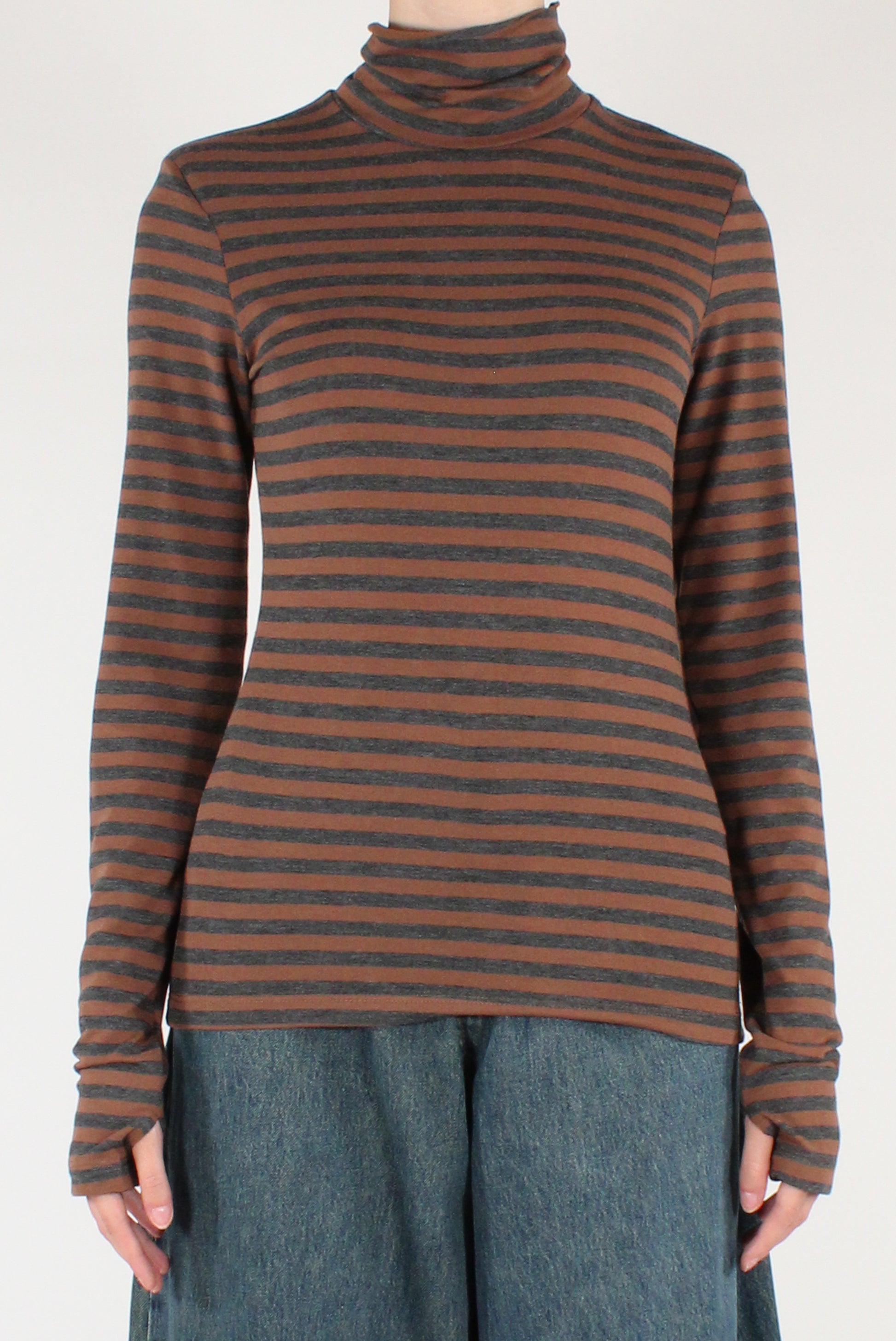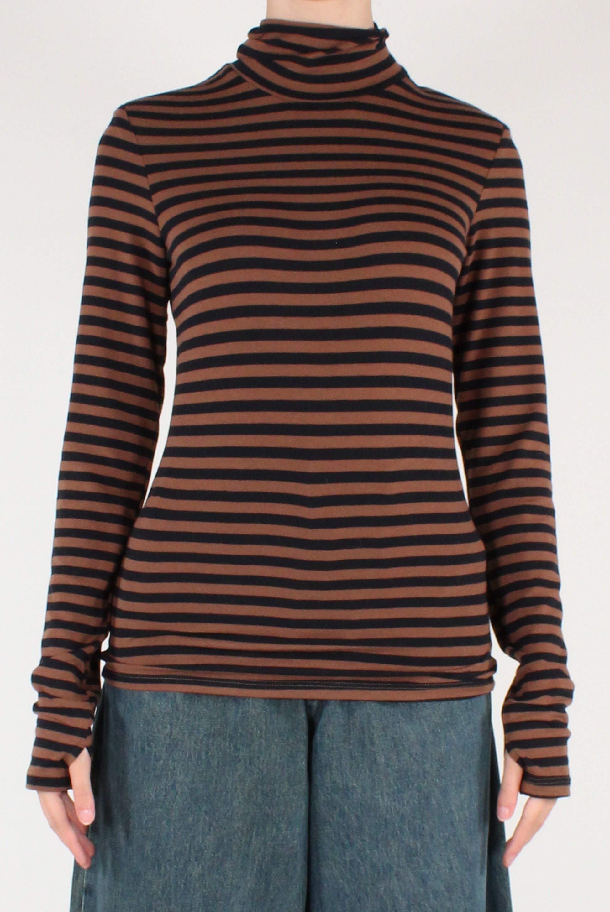 Dolcevita a righe con spalline strutturate. A maniche lunghe, vestibilità aderente. Dettaglio asole per i pollici.