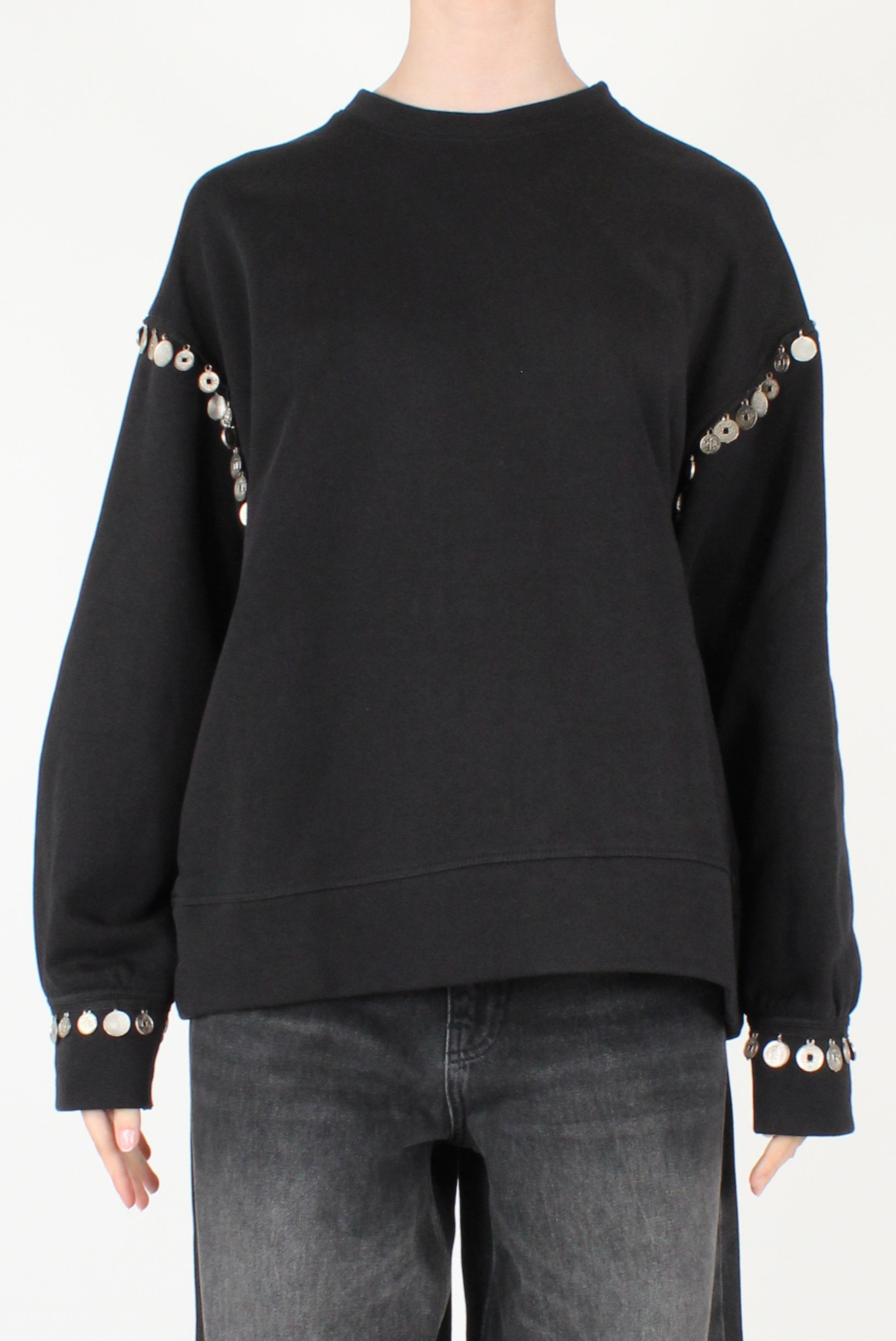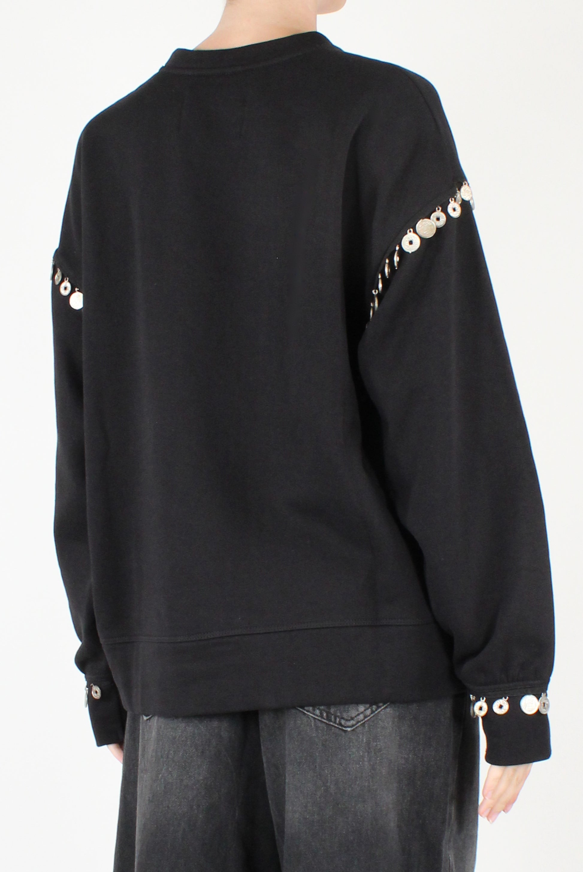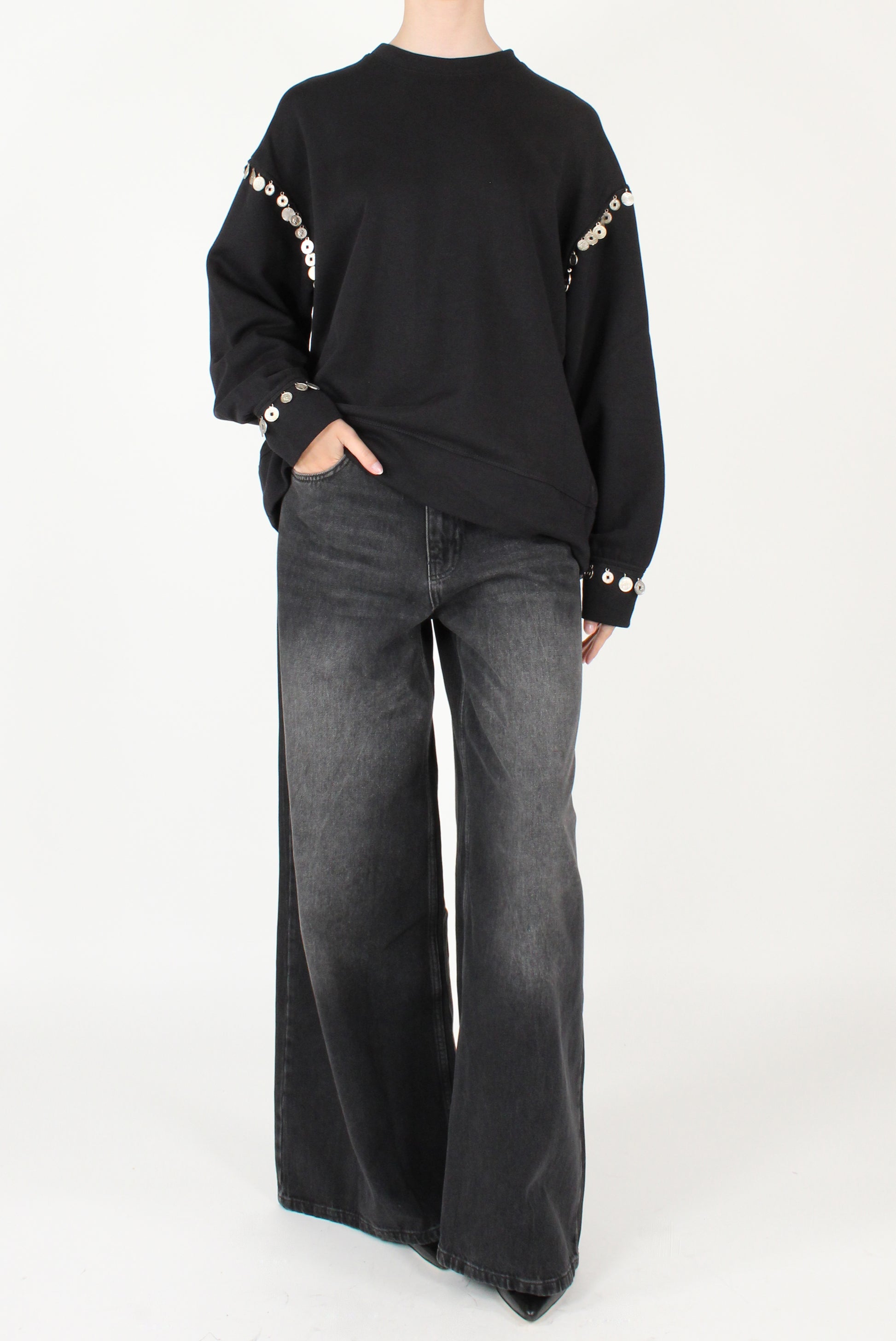 Felpa over con monetine applicate. Girocollo a maniche lunghe, dettaglio monetine sulle spalle e ai polsi.