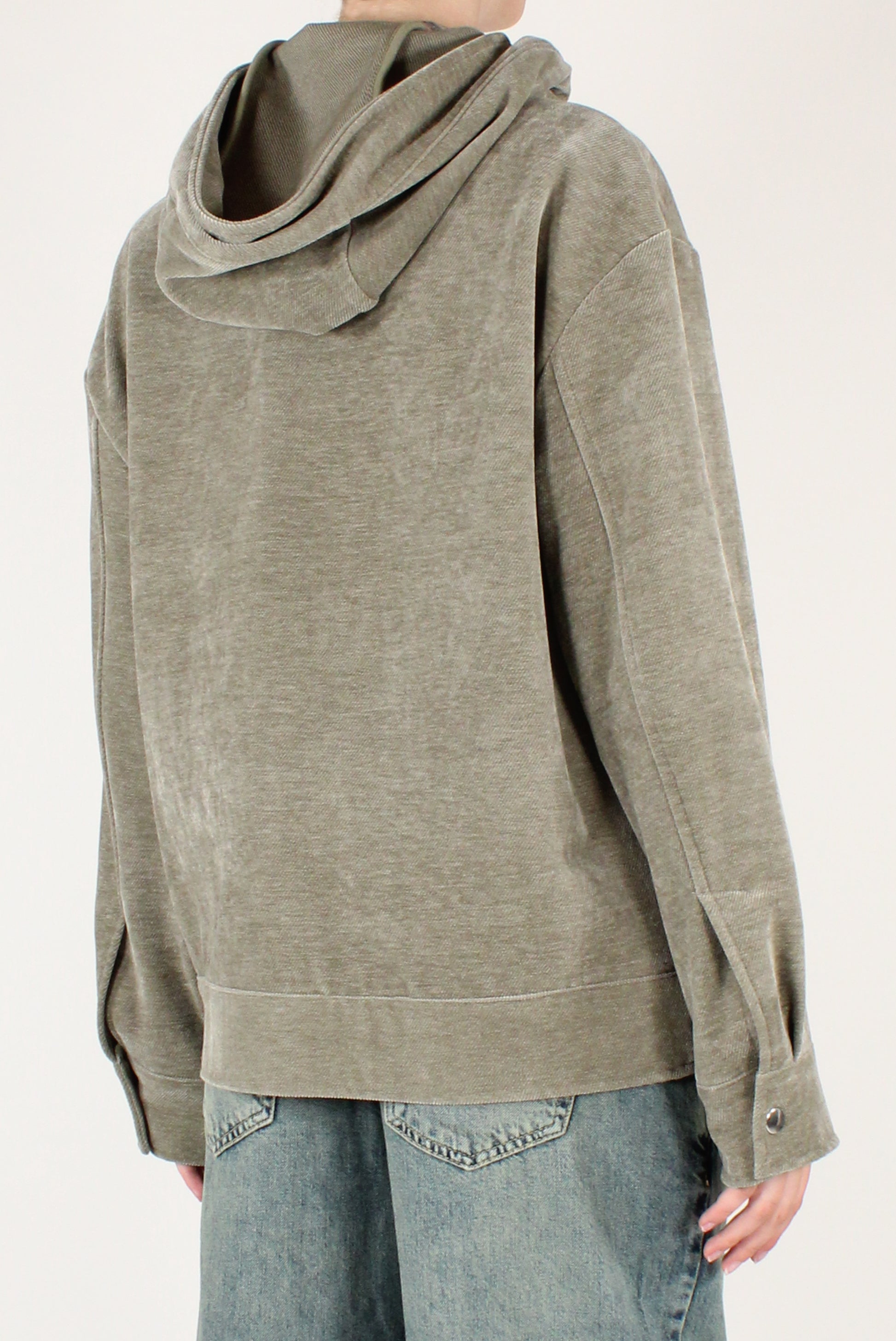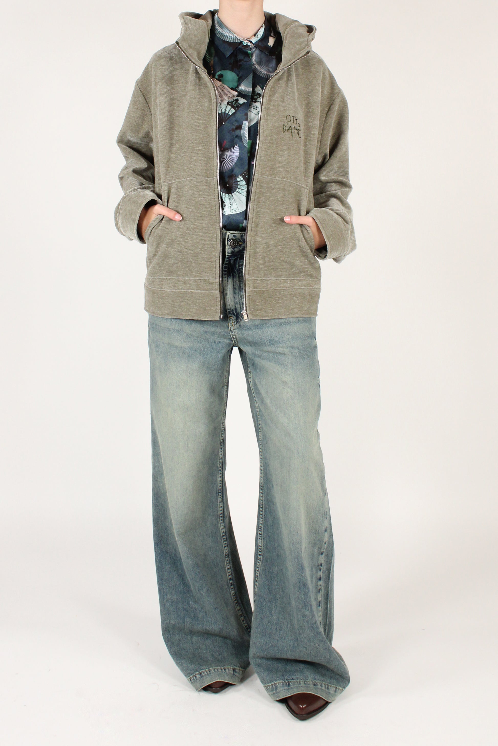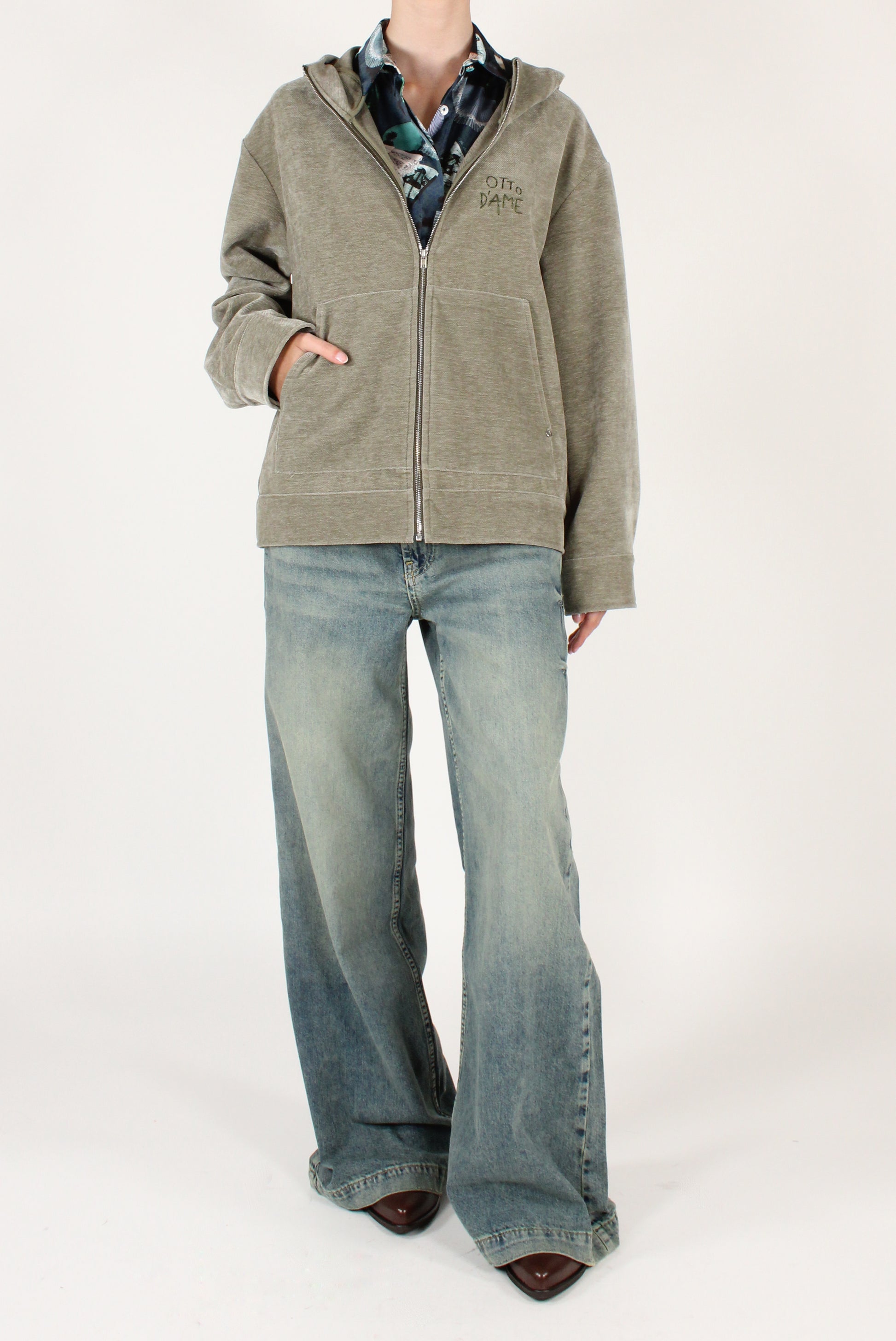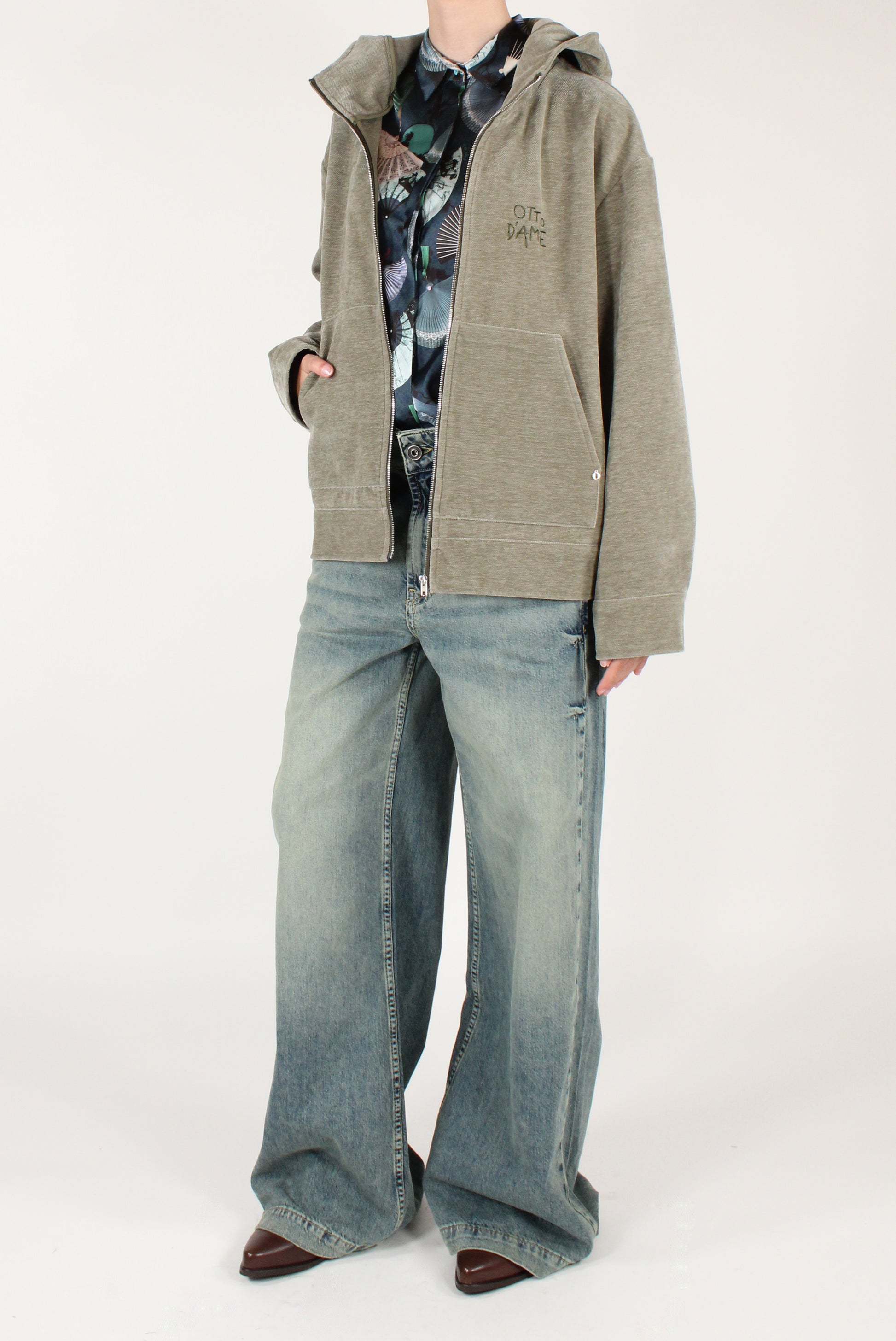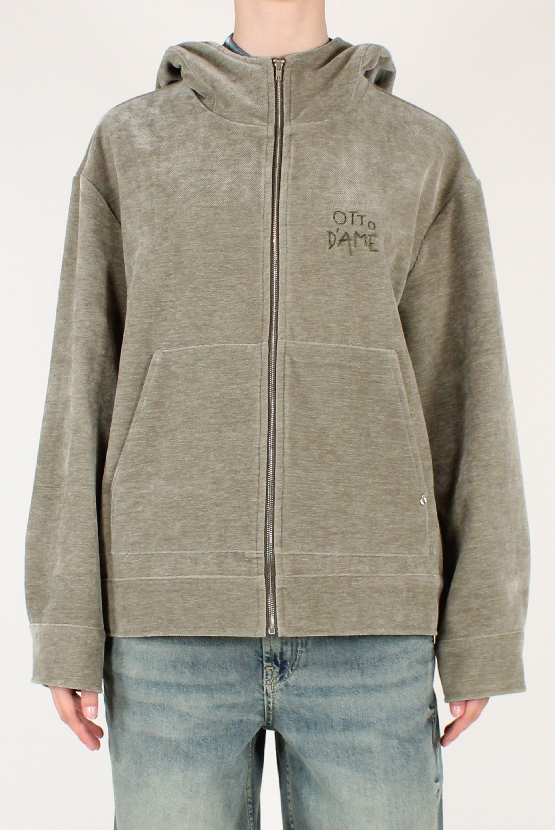 Felpa over effetto vellutato a trama diagonale, leggermente elasticizzata. A maniche lunghe, con cappuccio, allacciatura a zip. Con tasche laterali e logo Ottod'ame ricamato.