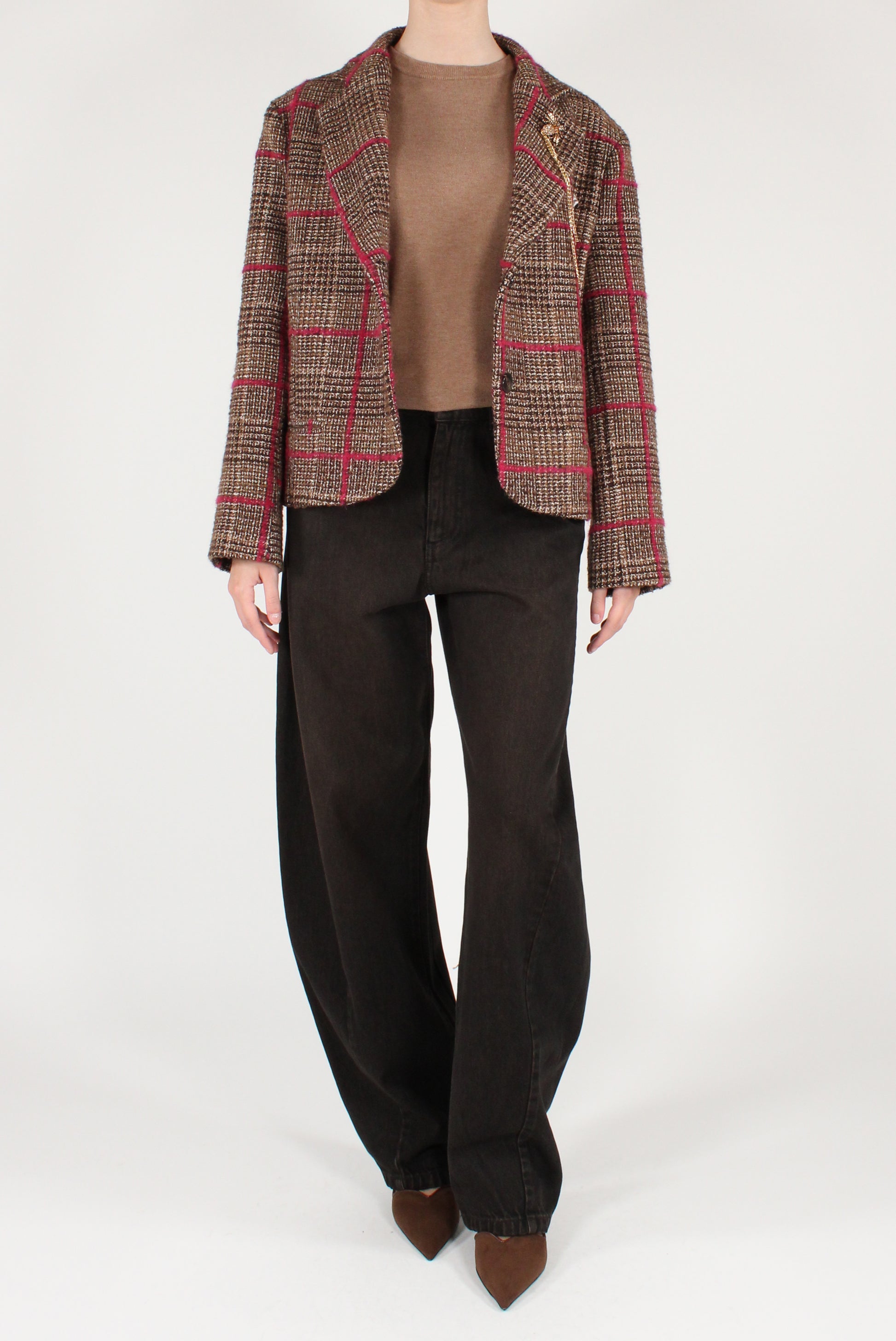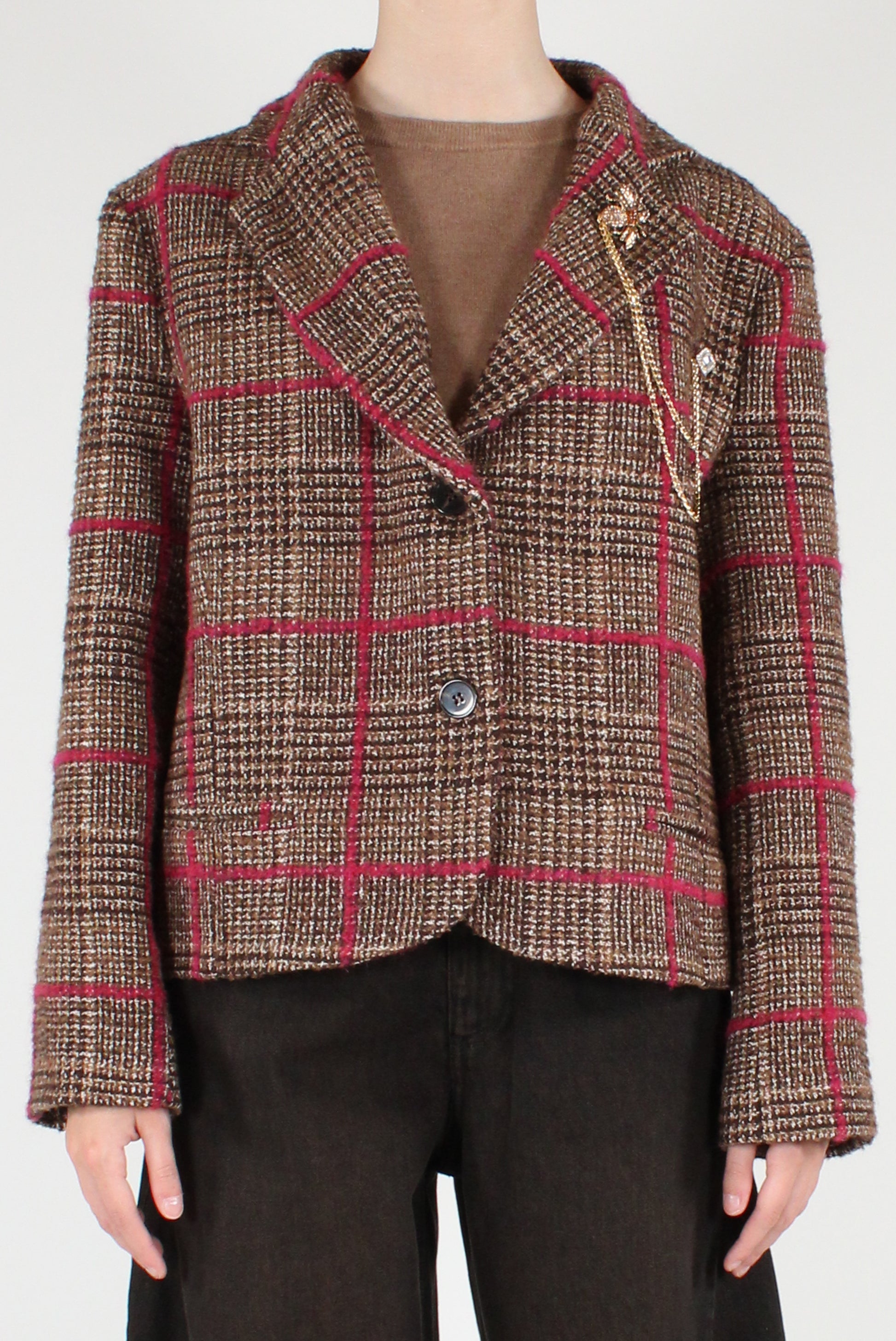 Giacca corta in tartan con cuciture a contrasto e spille applicate variabili e removibili. In misto lana, monopetto, con classici revers ed allacciatura a bottoni. Con finte taschine a filetto e spacco sul retro, completamente foderata.