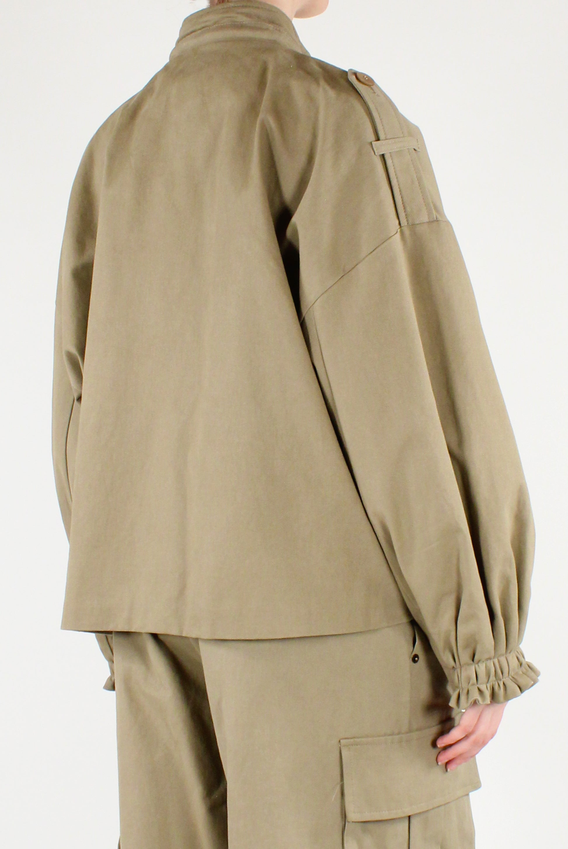 Giacca desert con tasche a patta, chiusura a zip e bottoni automatici a pressione. Rouches ai polsi, coulisse al collo e fascette con bottoni alle spalle. Completamente foderata. Pantaloni coordinati disponibili.