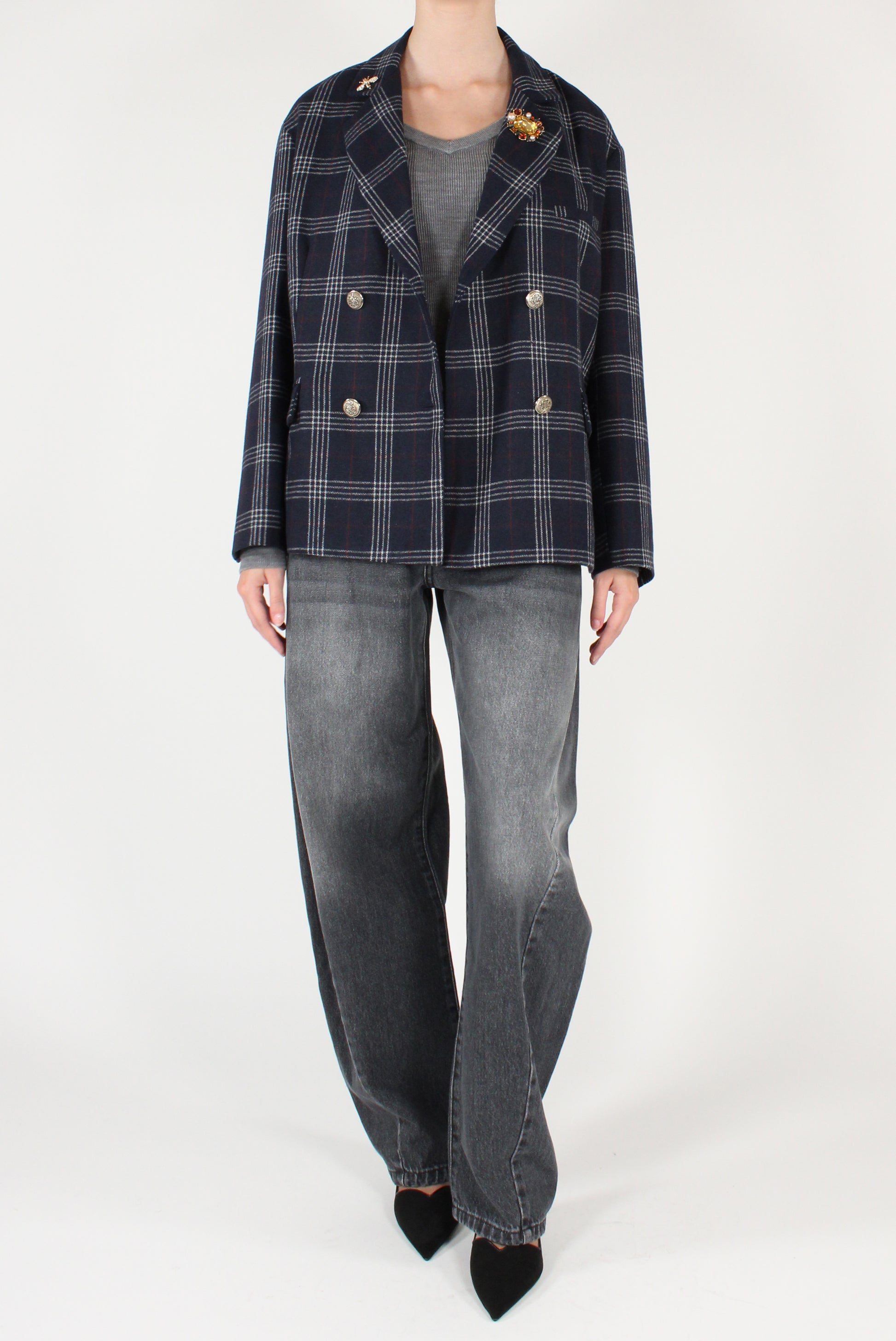 Giacca doppiopetto in tartan blu con spille incluse variabili e removibili. A spalle scese, con allacciatura a bottoni, tasche a patta e finta tasca a filetto in alto a sinistra. Vestibilità over, completamente foderata.