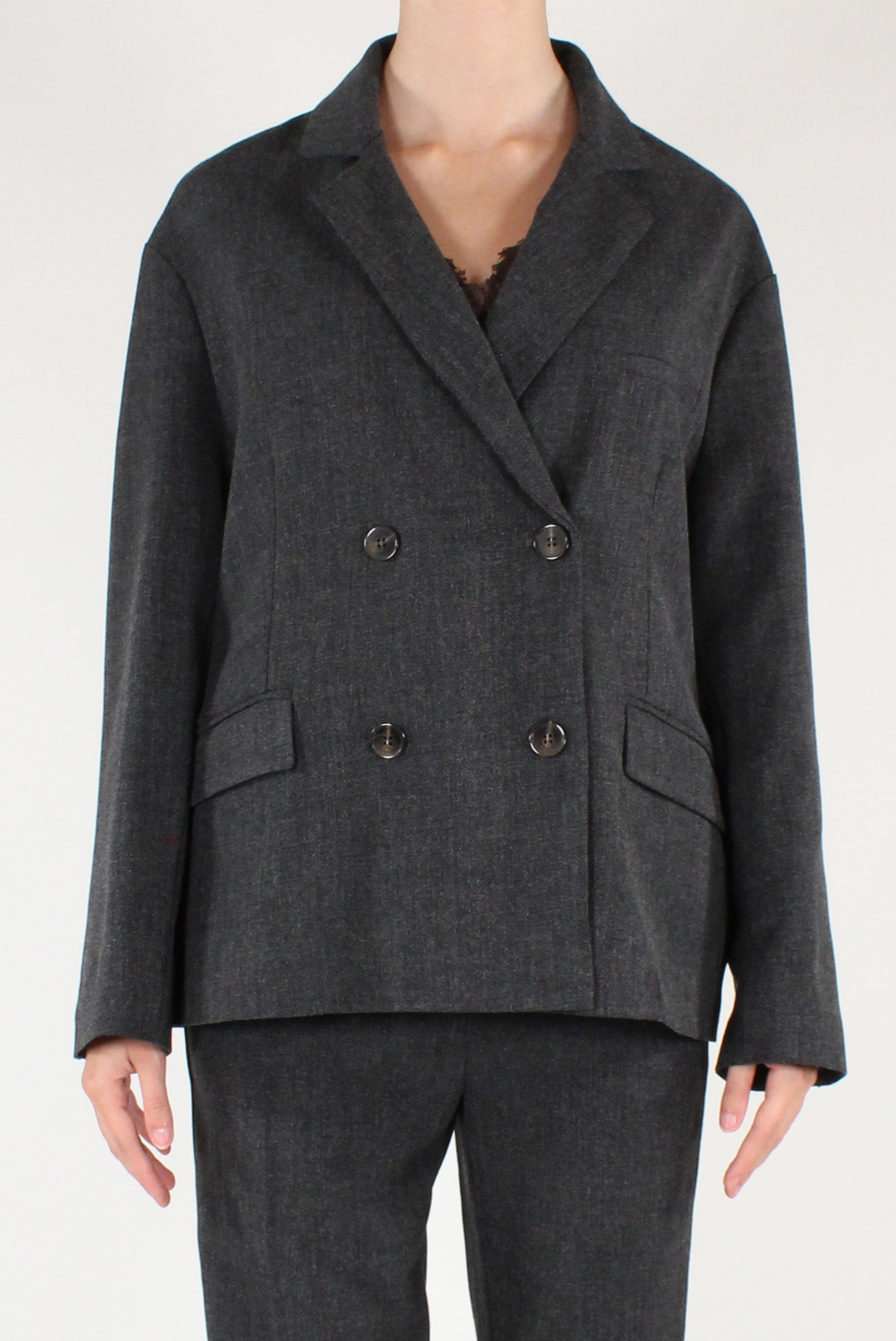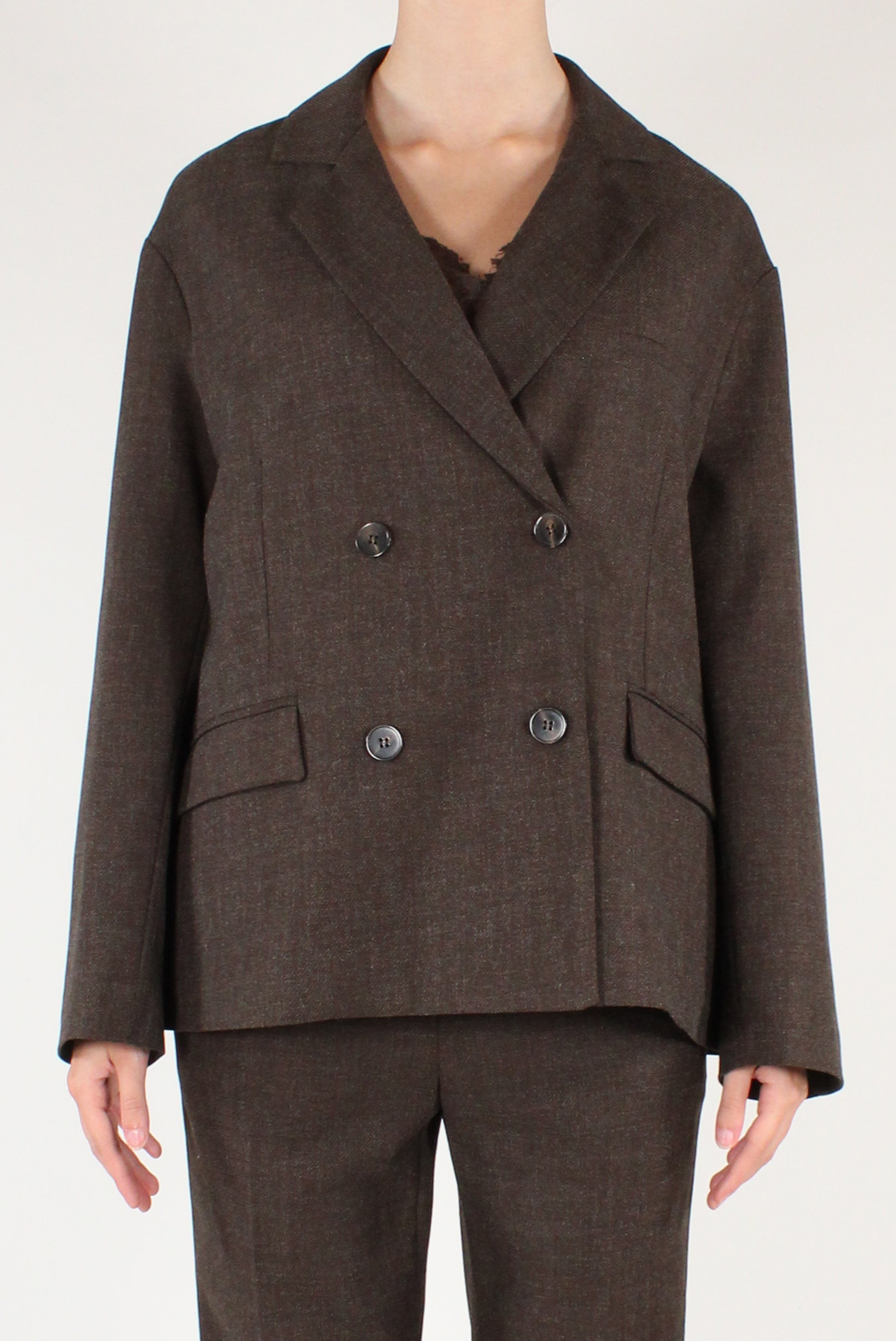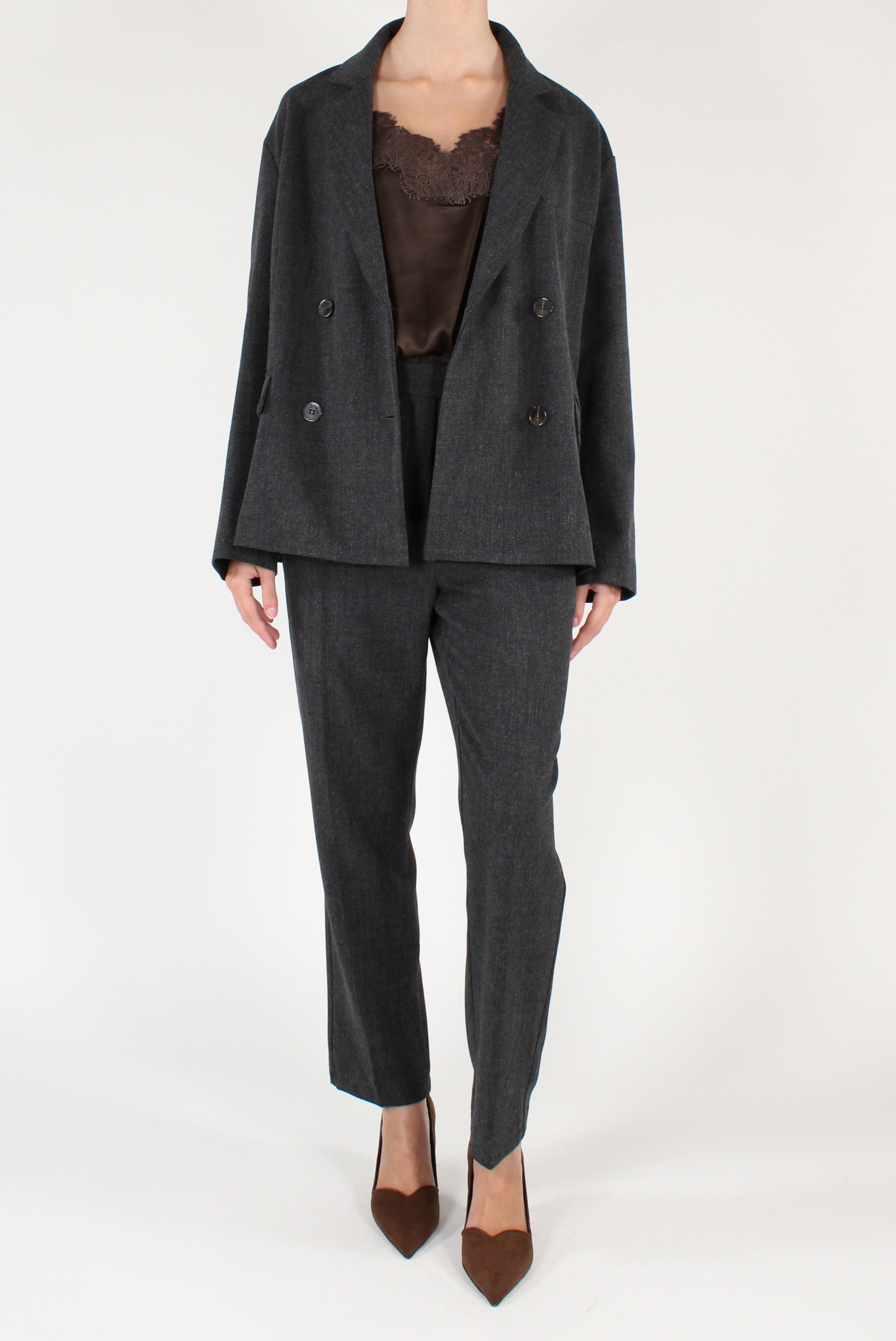 Giacca doppiopetto mélange. Modello a scatola a spalle scese, con revers classici, tasche a patta e finta tasca a filetto davanti a sinistra. Completamente foderata, pantaloni a sigaretta coordinati disponibili.