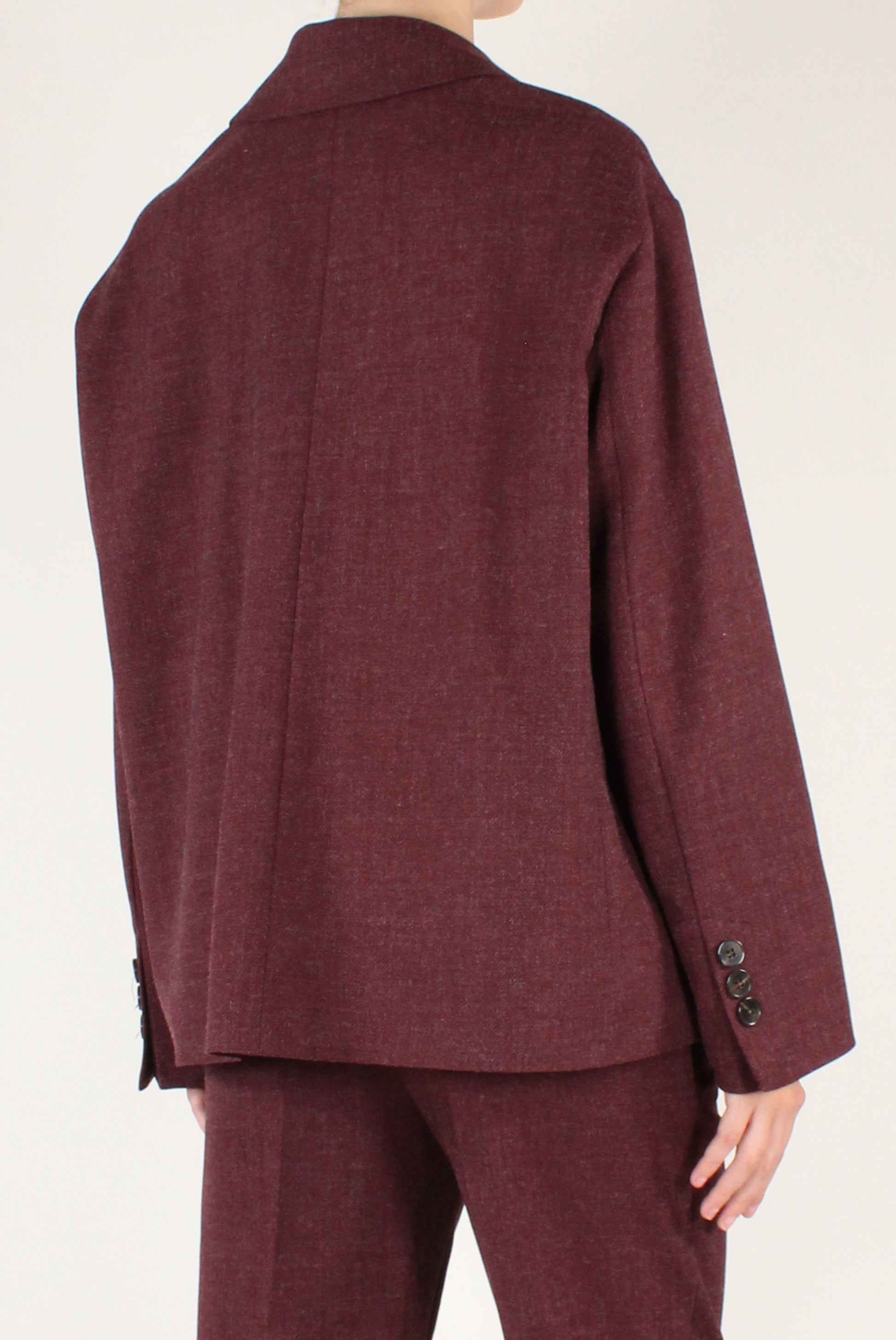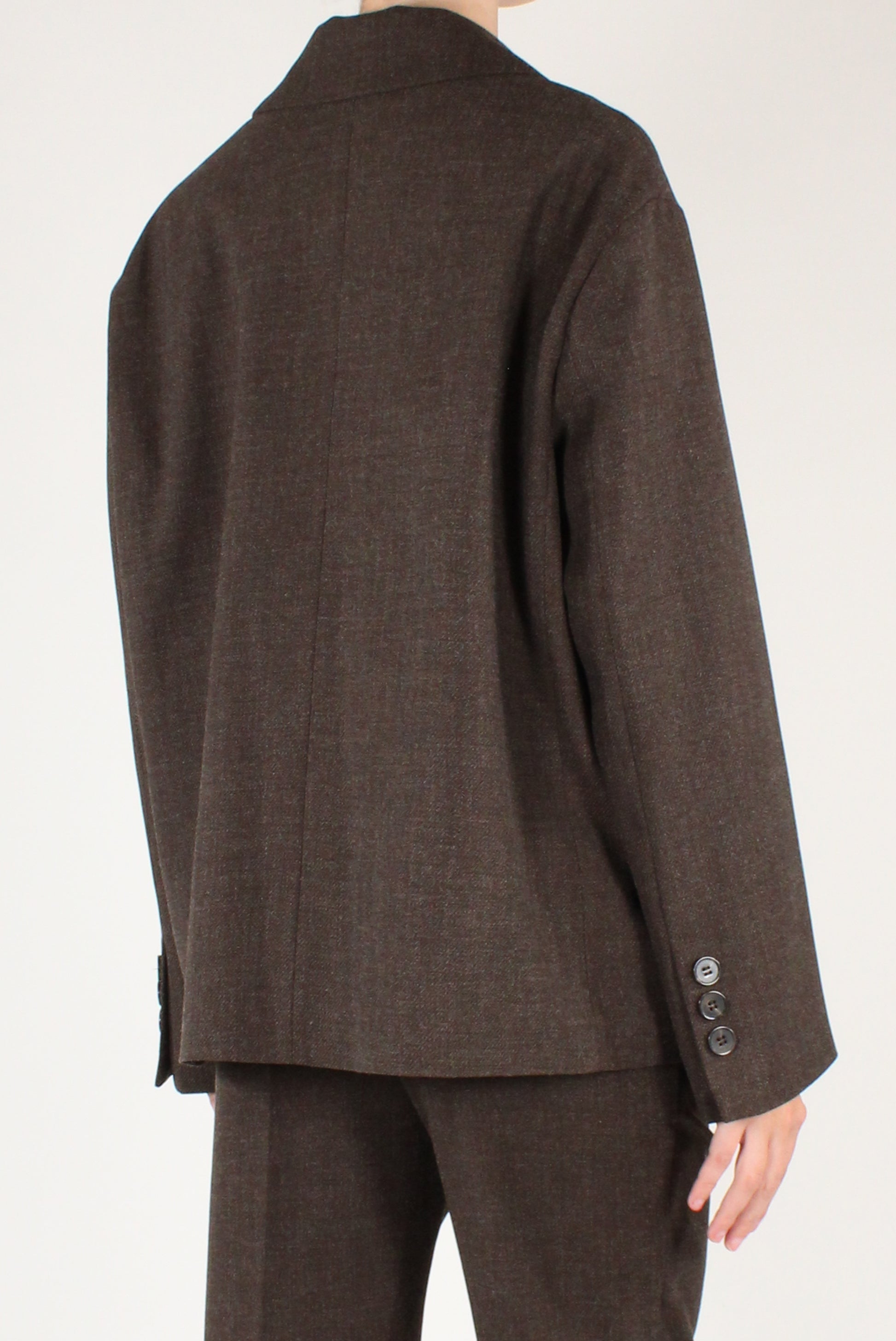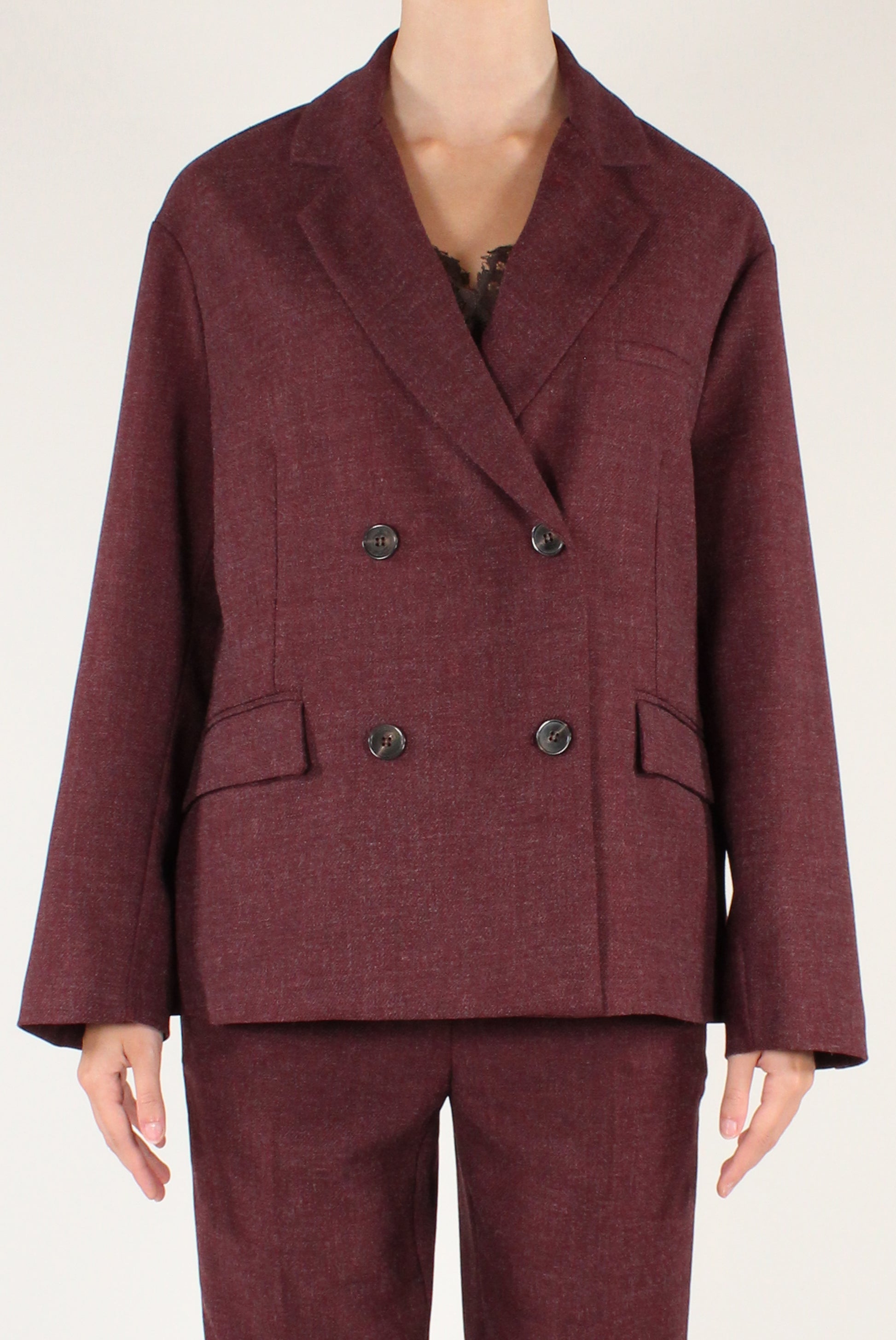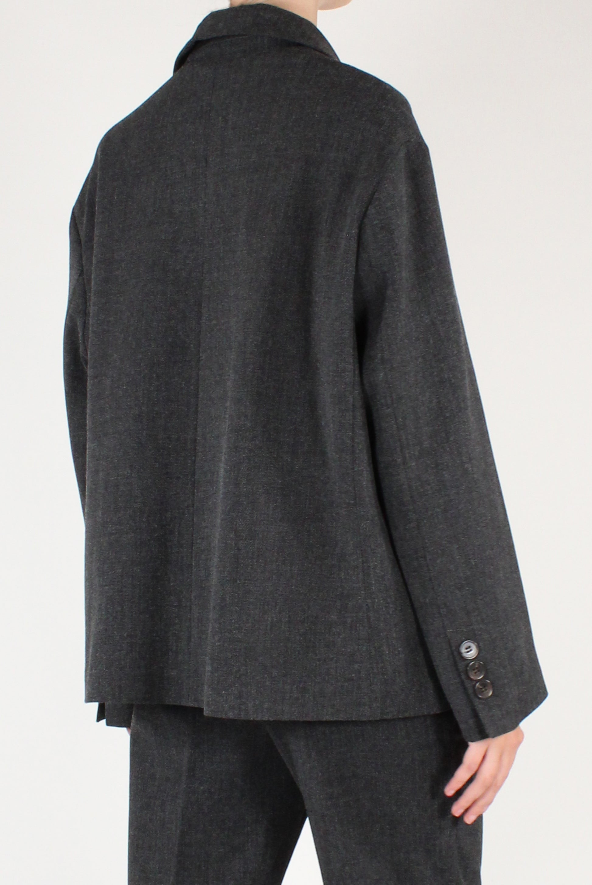 Giacca doppiopetto mélange. Modello a scatola a spalle scese, con revers classici, tasche a patta e finta tasca a filetto davanti a sinistra. Completamente foderata, pantaloni a sigaretta coordinati disponibili.