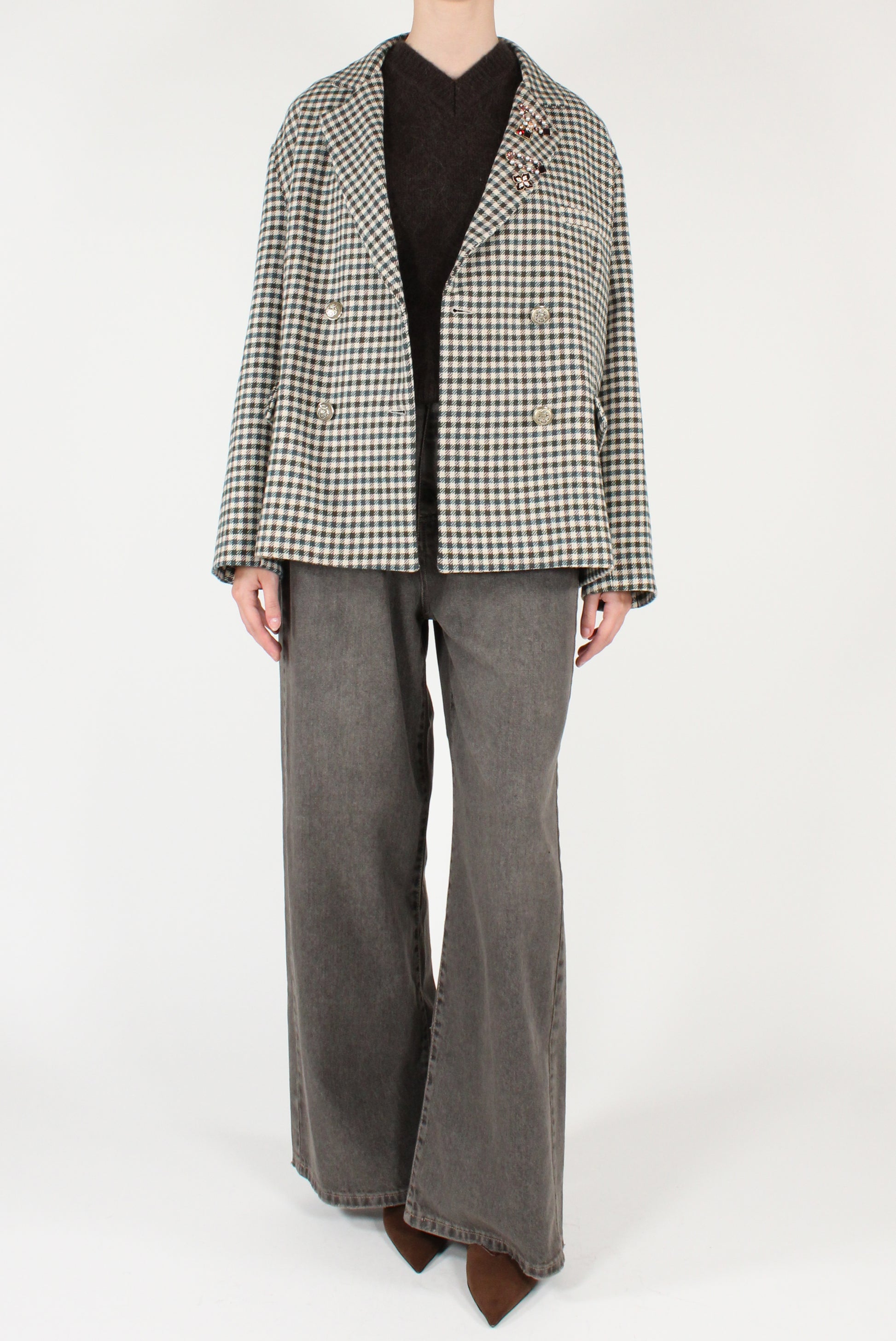 Giacca doppiopetto over a quadretti con spille incluse variabili e removibili. Revers classici, allacciatura a bottoni con stemma, con tasche a patta, dettaglio finta tasca a filetto davanti a sinistra e bottoni applicati ai polsi. In misto lana, completamente foderata.