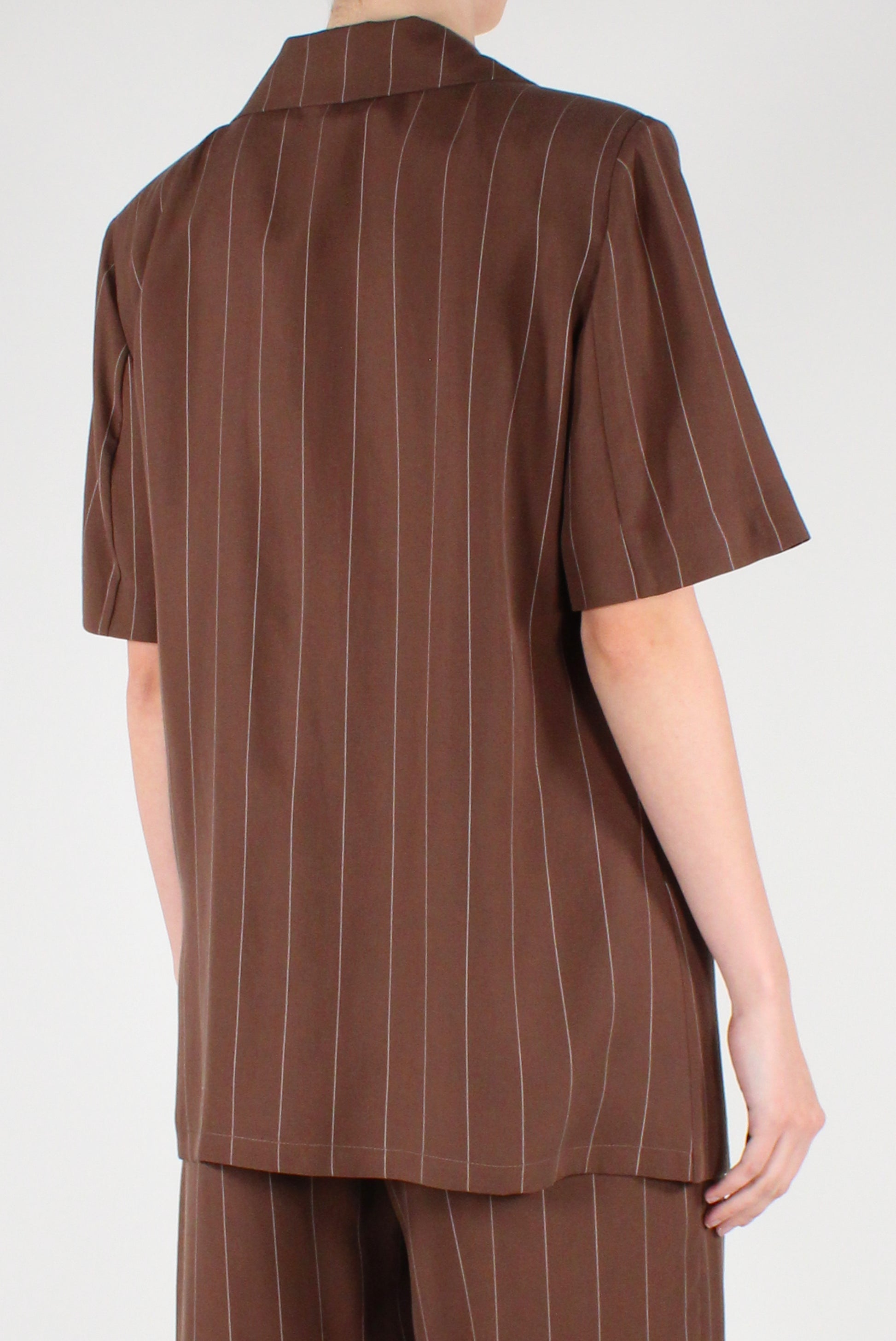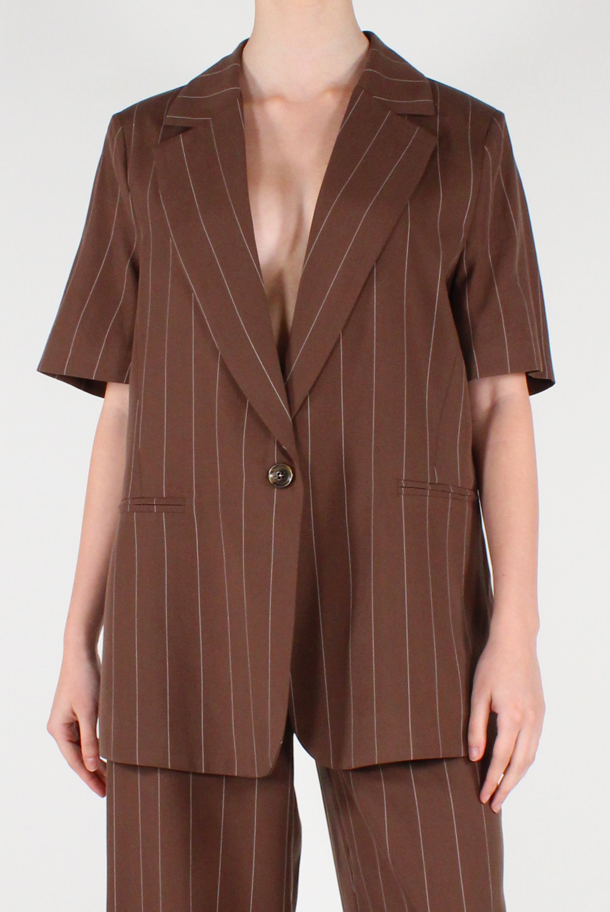 Giacca gessata in lyocell, modello monopetto a maniche corte. Caratterizzata da revers classici, chiusura a un bottone e finte tasche a filetto. Sfoderata, dalla linea leggera e contemporanea, perfetta anche con pantaloni coordinati.