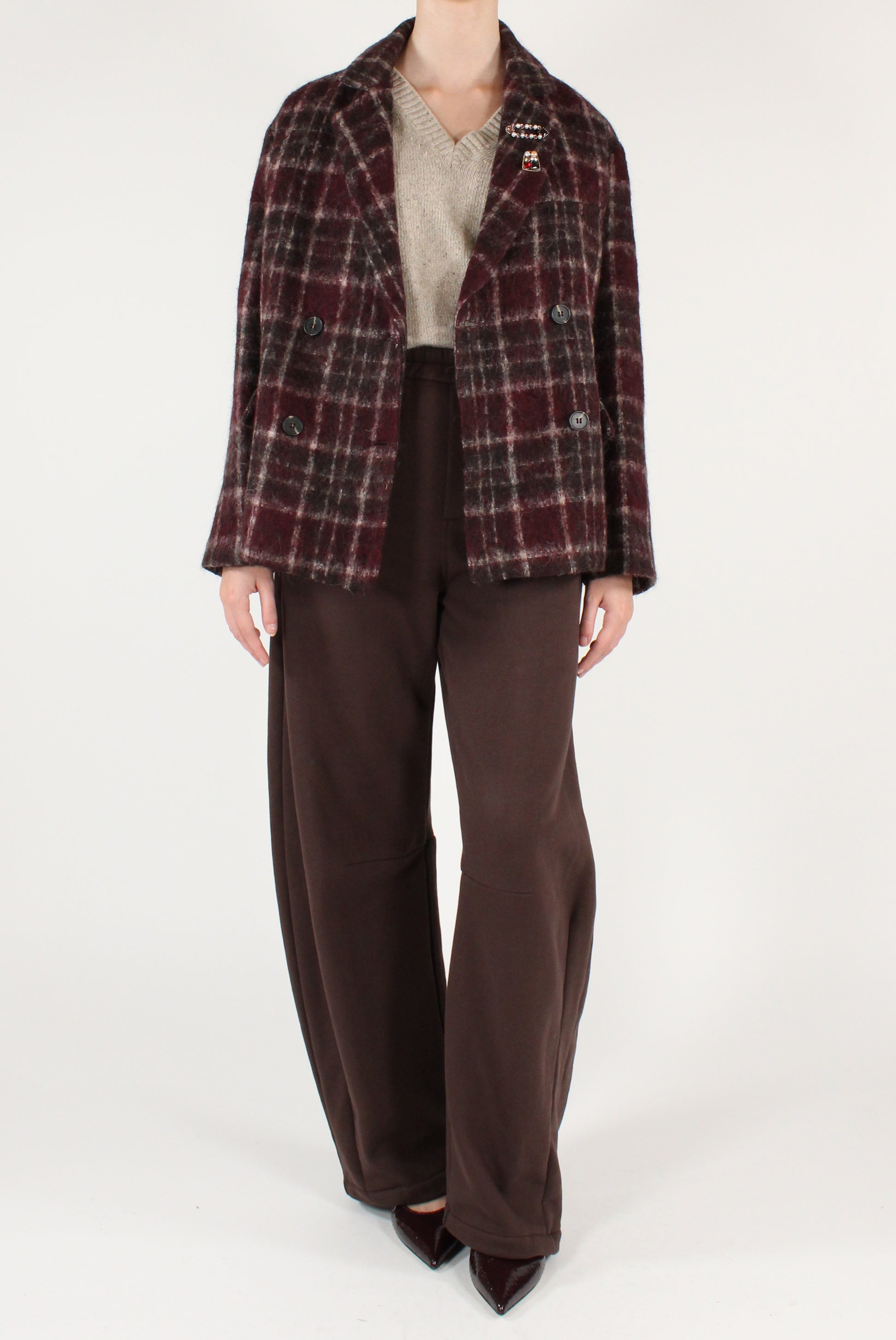 Giacca in tartan misto lana con spille incluse variabili e removibili. Doppiopetto, con tasche a patta laterali e dettaglio finto taschino davanti. A spalle scese, completamente foderata.
