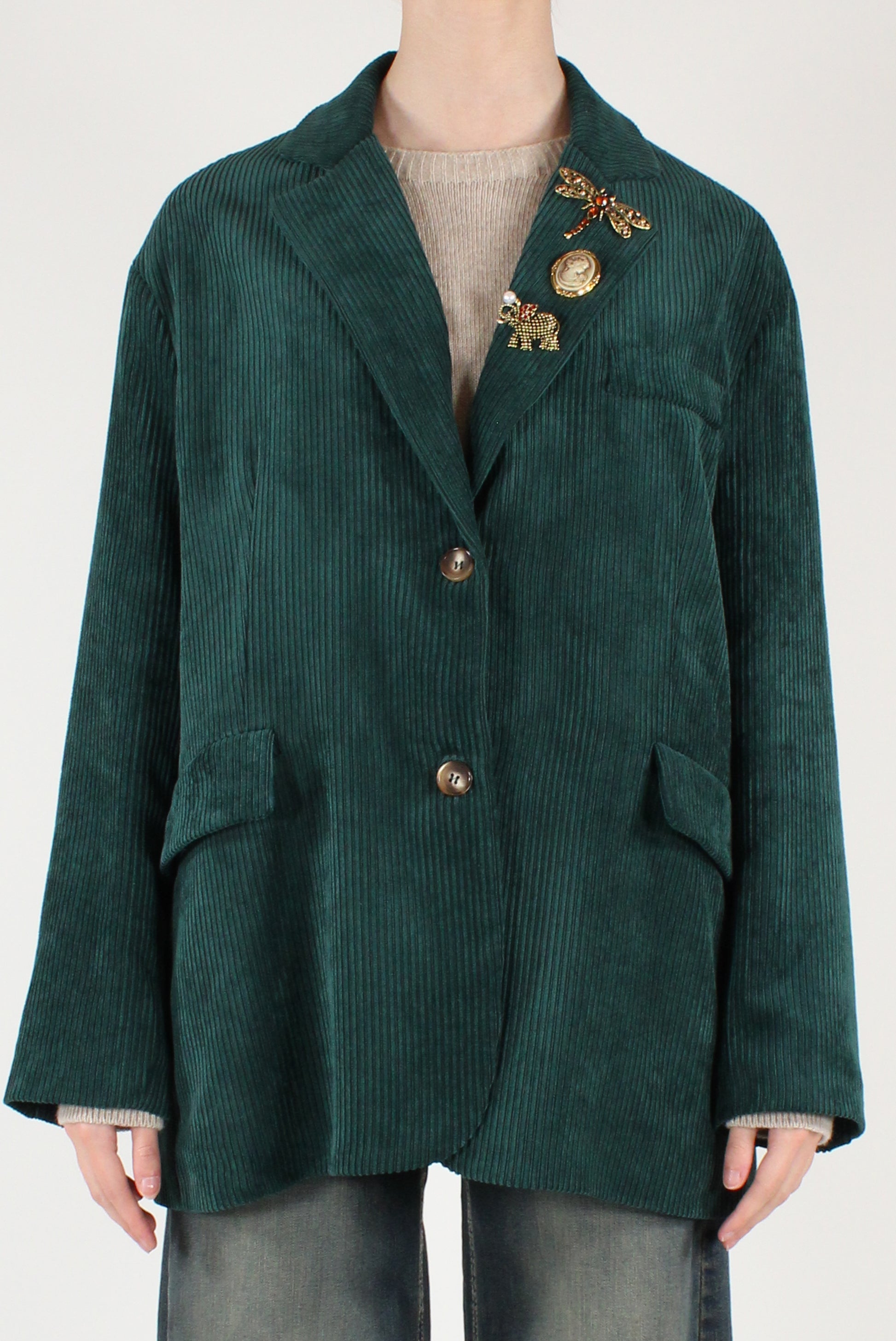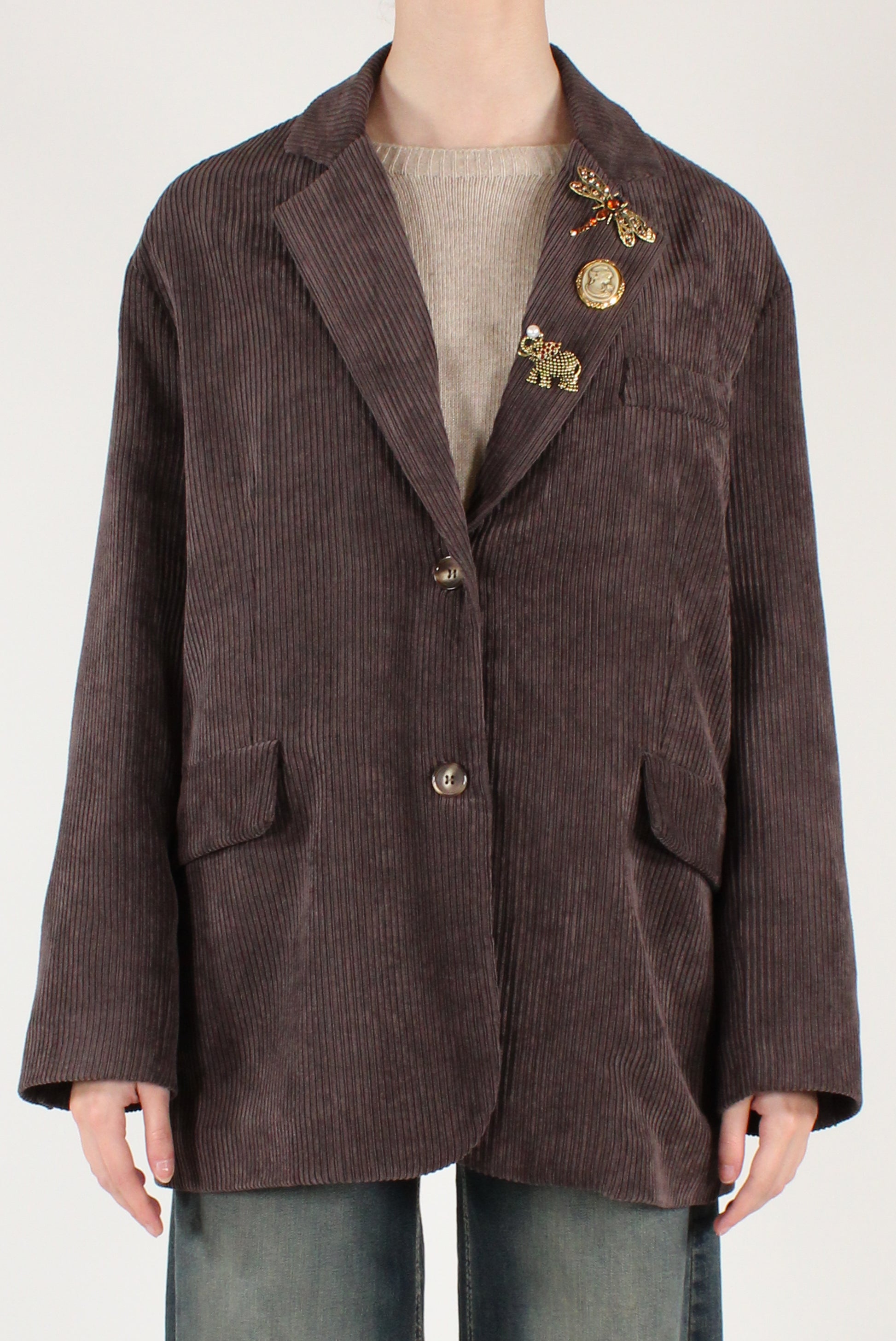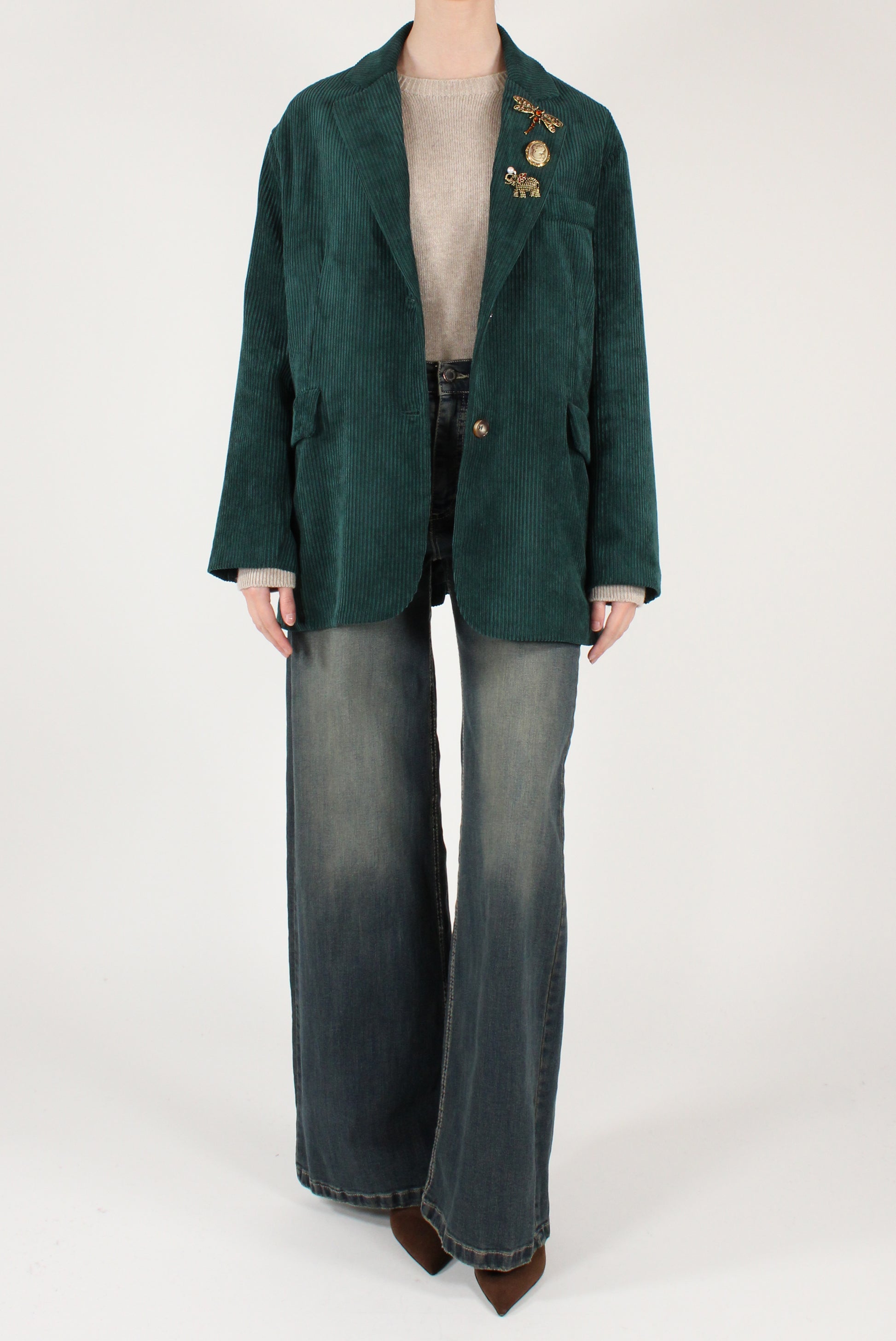 Giacca in velluto a coste con spille incluse variabili e removibili. Monopetto, taglio over con revers classici ed allacciatura a due bottoni. Con tasche a patta e dettaglio finto taschino davanti. Completamente foderata, con spacchi laterali.
