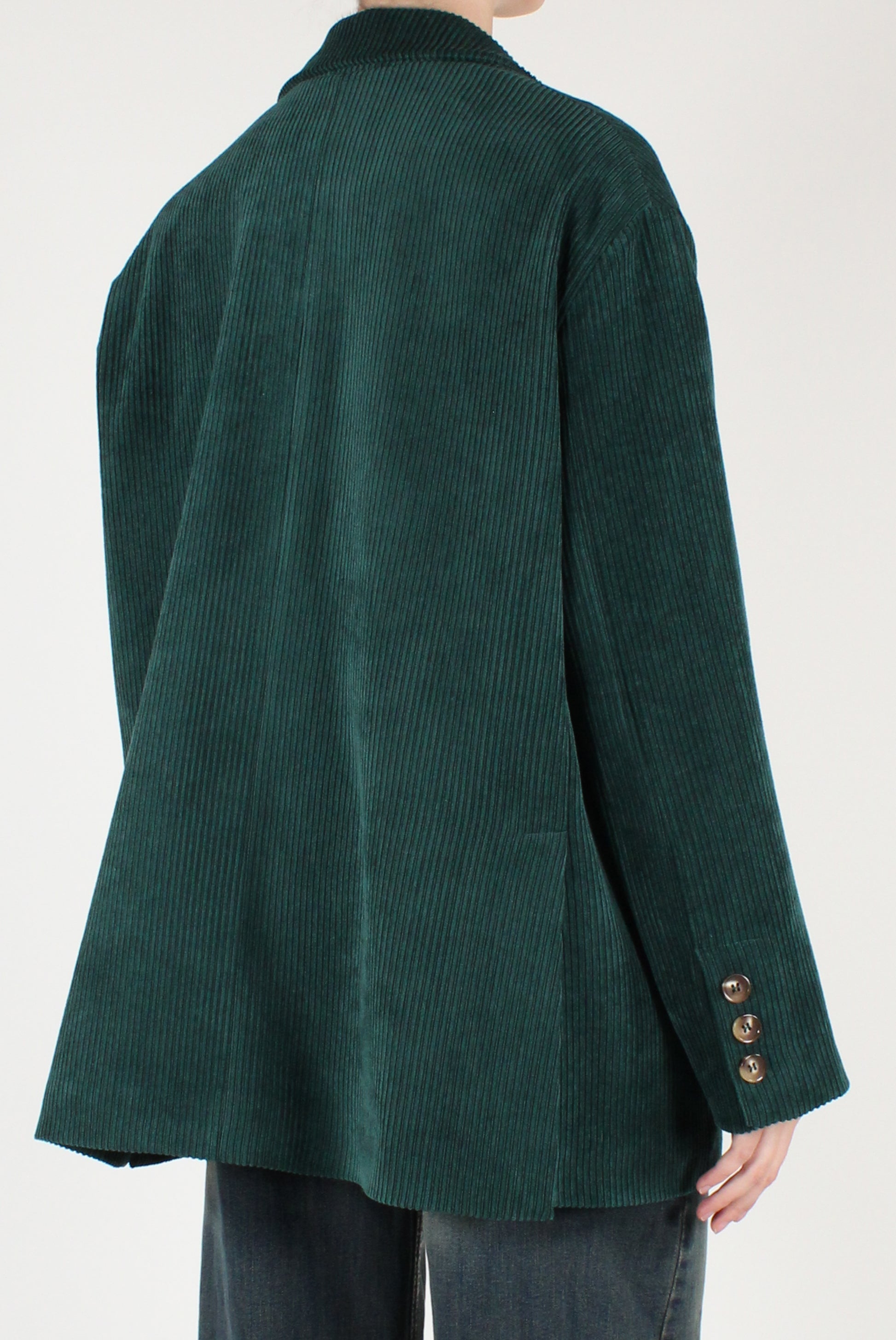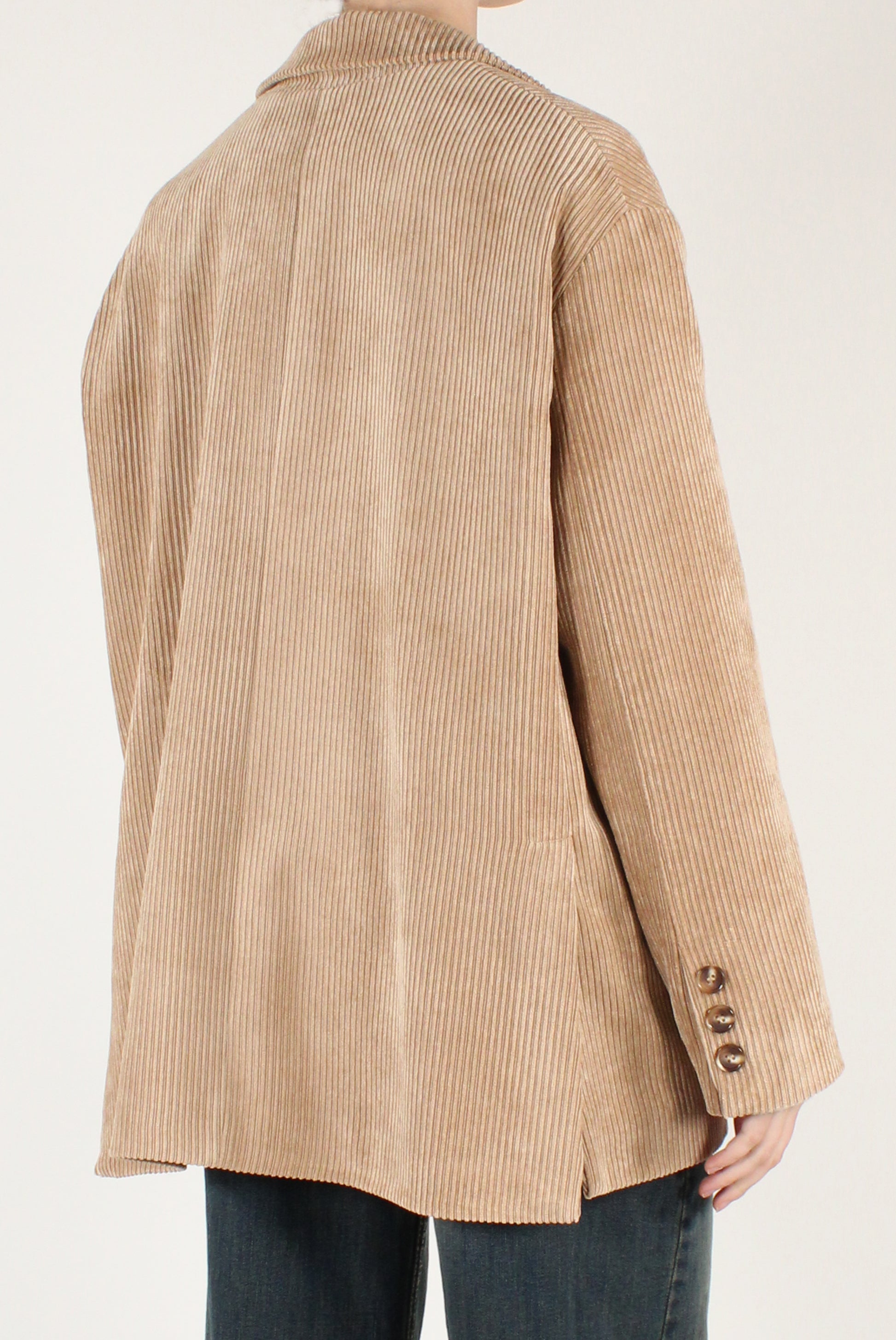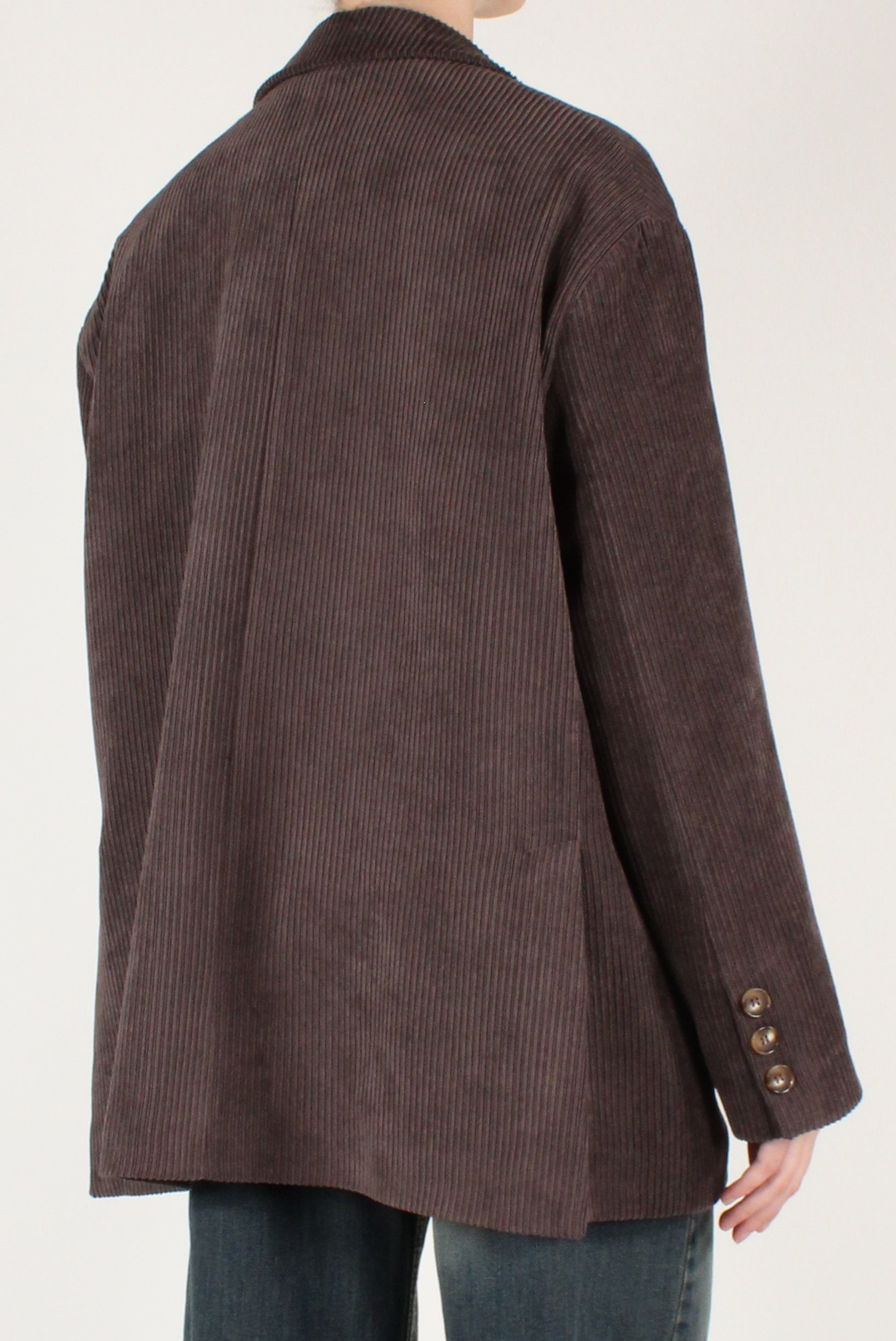 Giacca in velluto a coste con spille incluse variabili e removibili. Monopetto, taglio over con revers classici ed allacciatura a due bottoni. Con tasche a patta e dettaglio finto taschino davanti. Completamente foderata, con spacchi laterali.