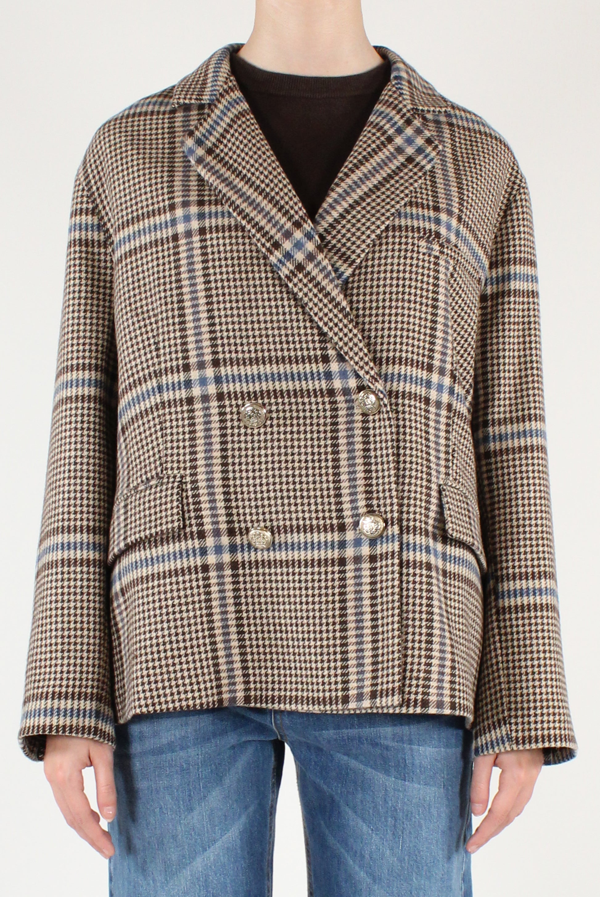 Giacca doppiopetto fantasia pied de poule con allacciatura a bottoni con stemma. Con Tasche laterali a patta e dettaglio finto taschino a filetto. Vestibilità over, a spalle scese, completamente foderata.