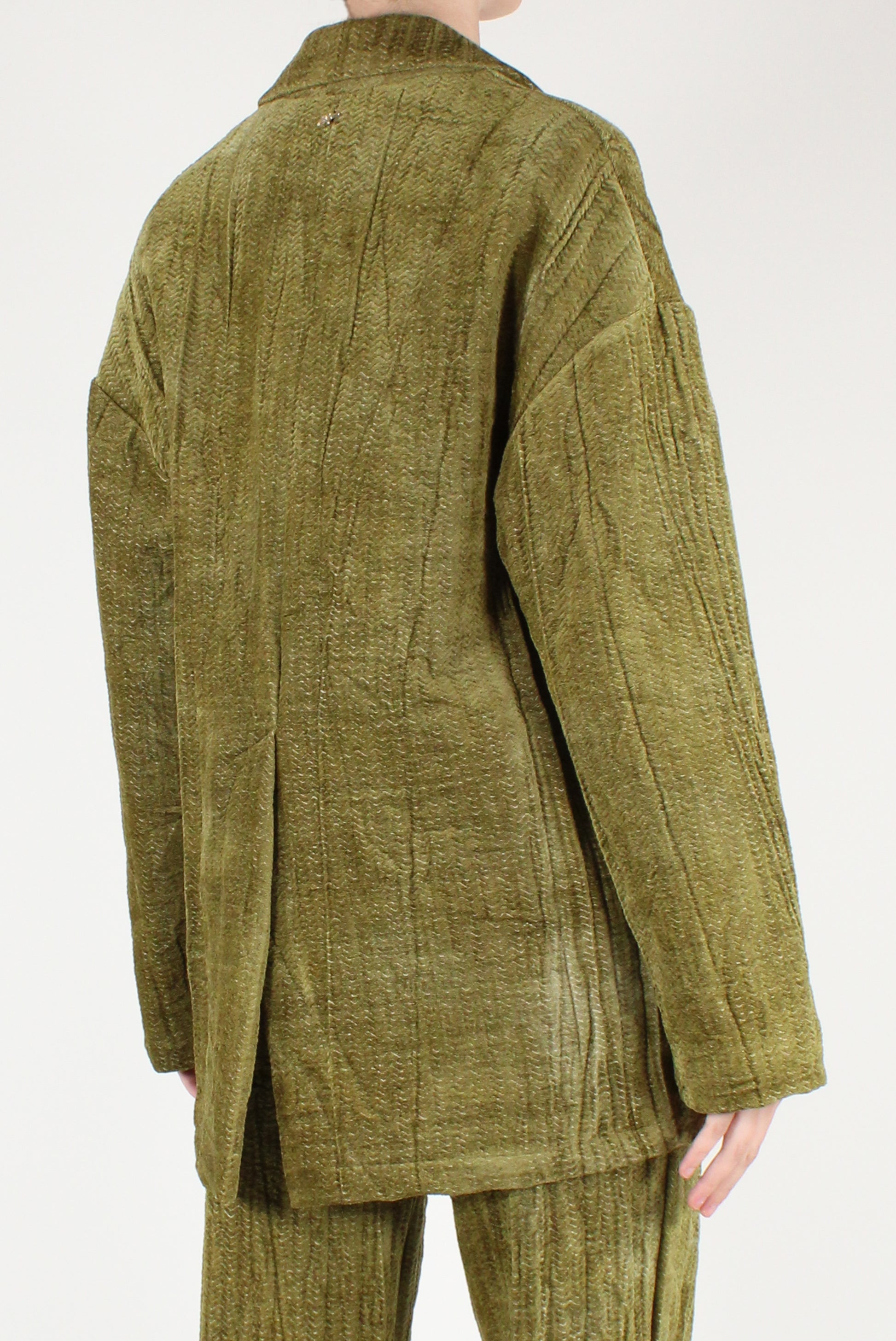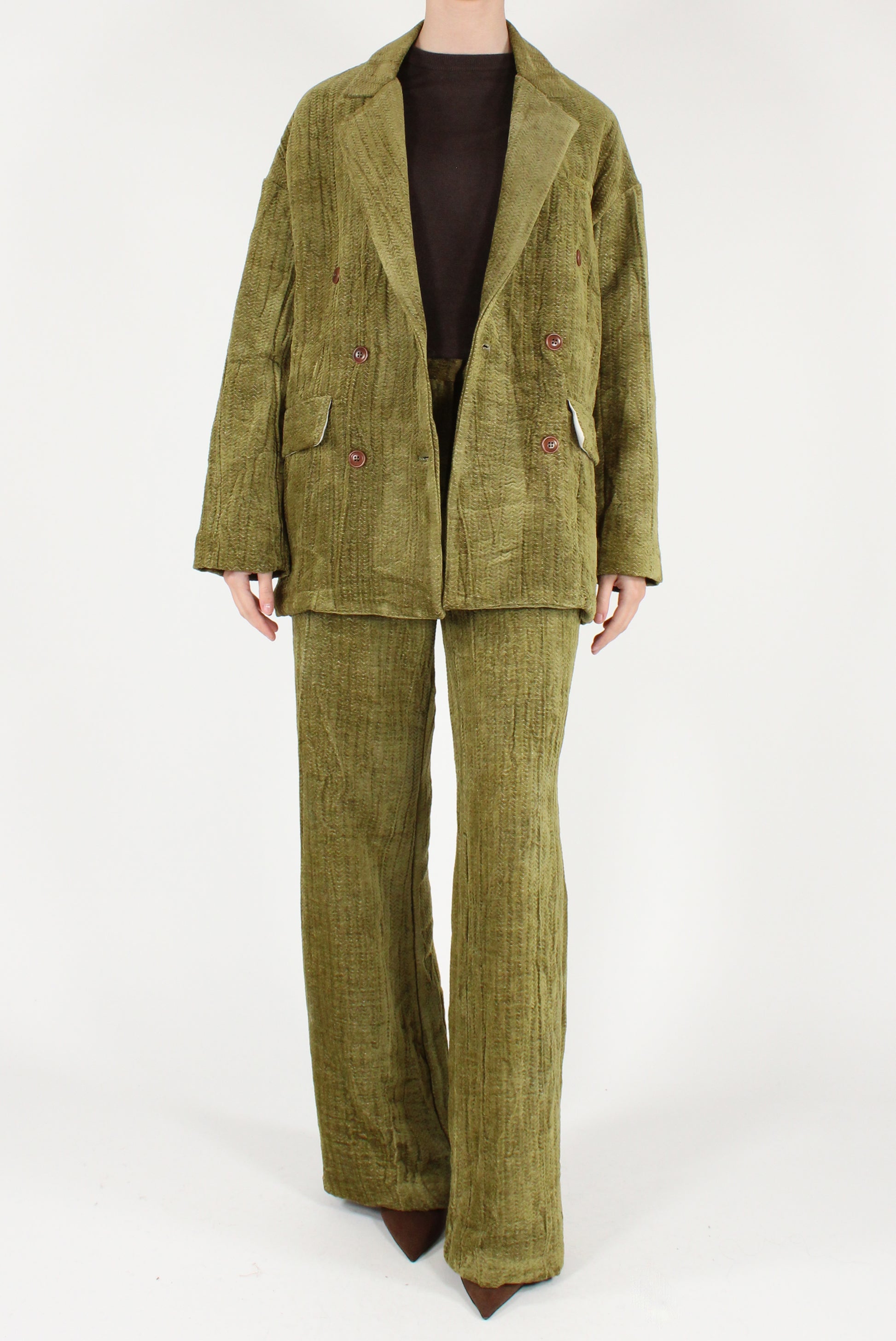 Giacca over doppiopetto in velluto spigato a effetto stropicciato. Con revers classici, allacciatura a bottoni, due tasche a patta laterali e un taschino a filetto in alto a sinistra. Semi foderata, dettaglio spacco sul retro. Pantaloni a palazzo coordinati disponibili.