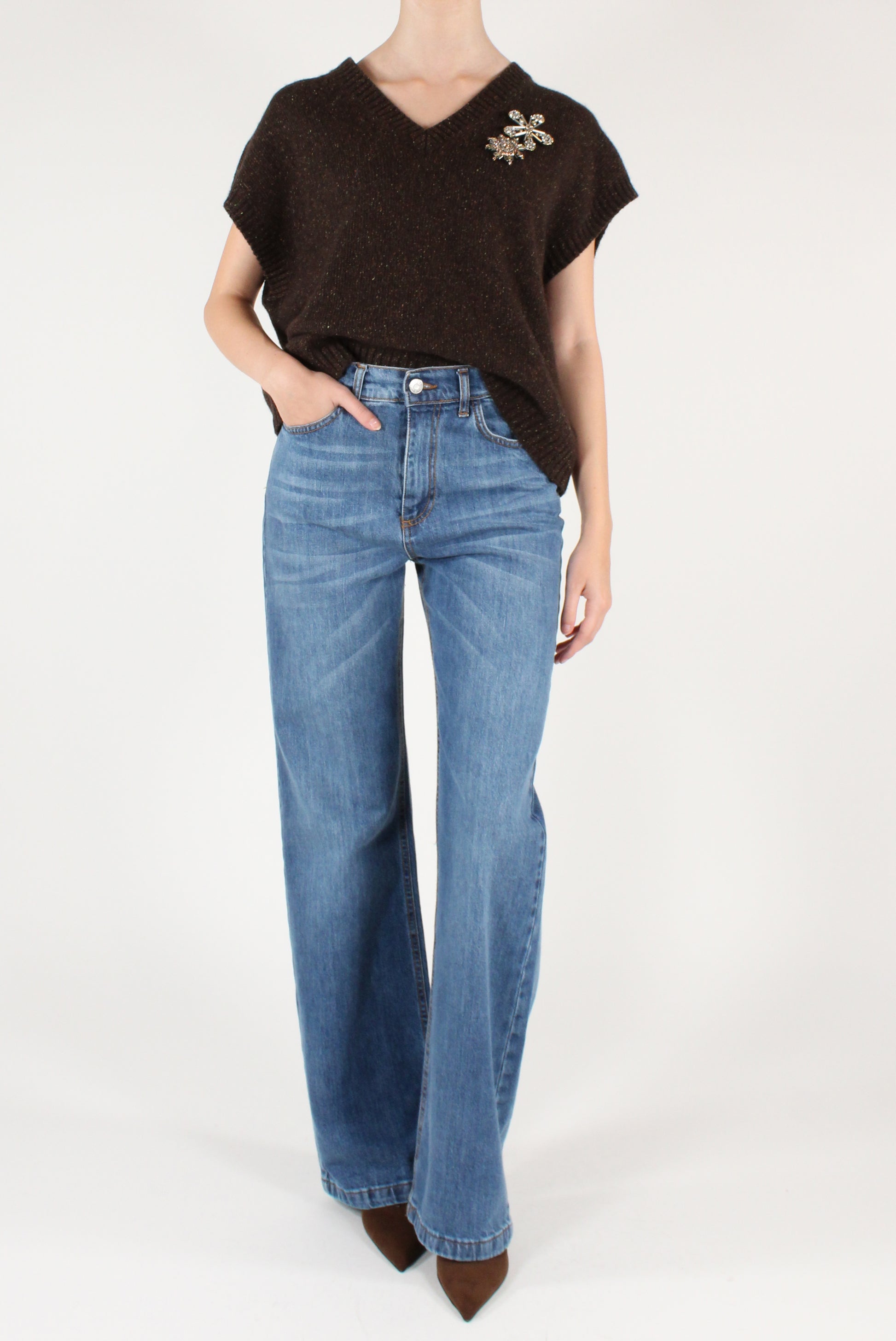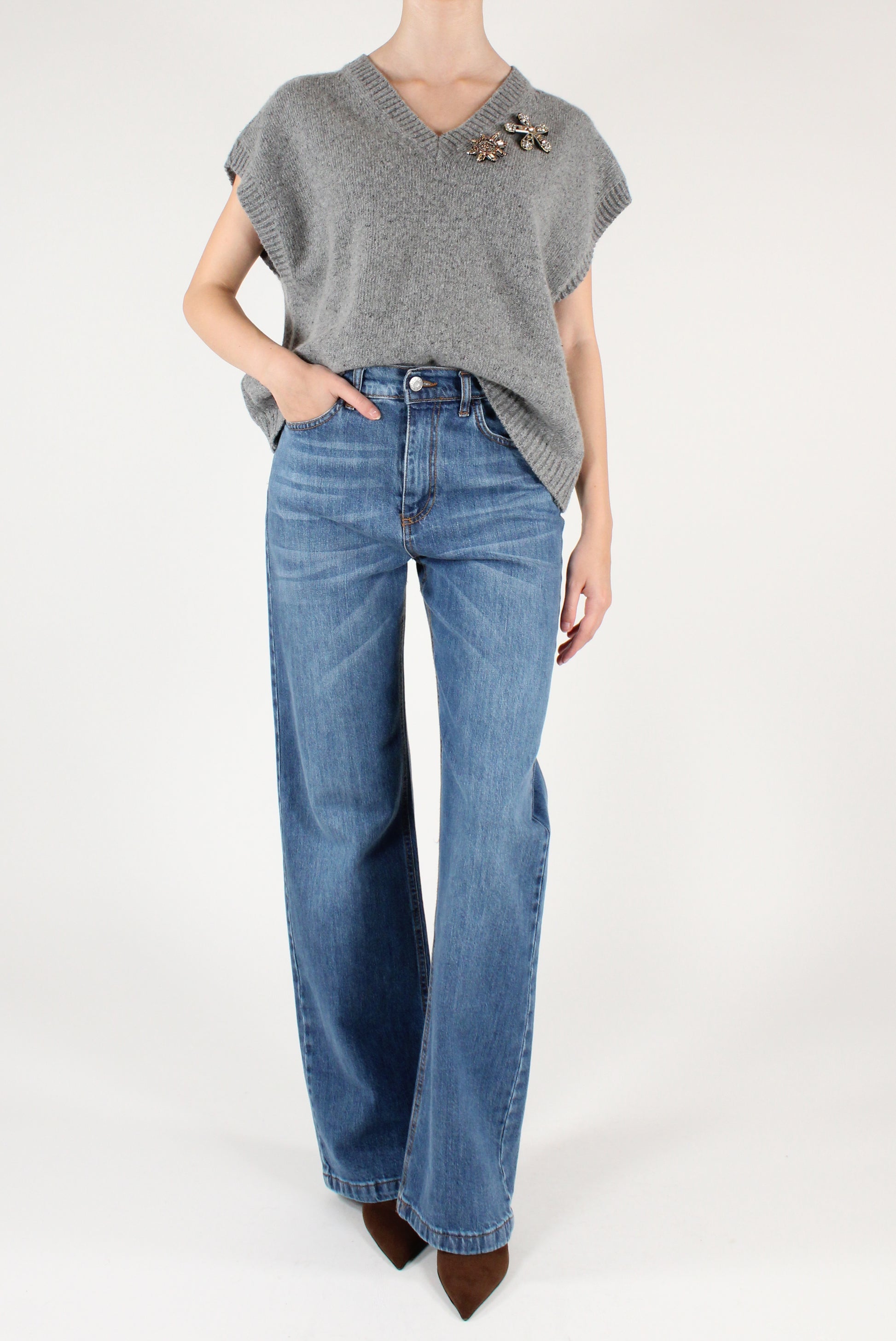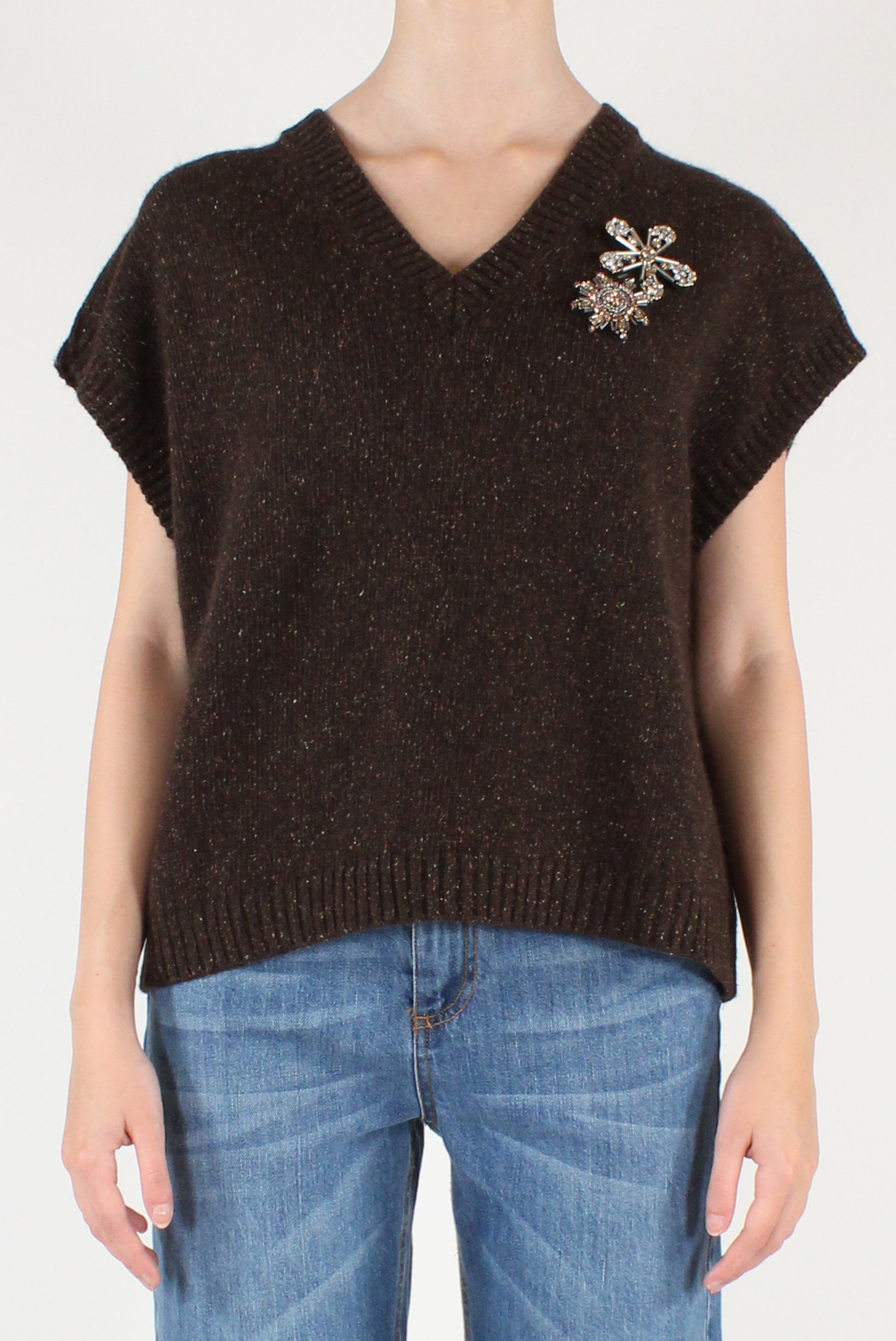 Gilet in misto lana con spille applicate variabili e removibili. Scollo a V, taglio over a scatola, con dettaglio profili a costine.