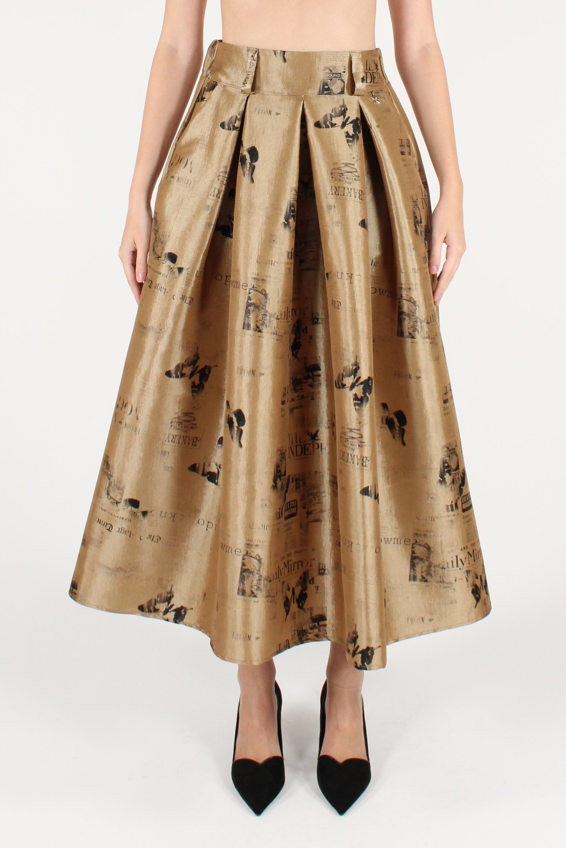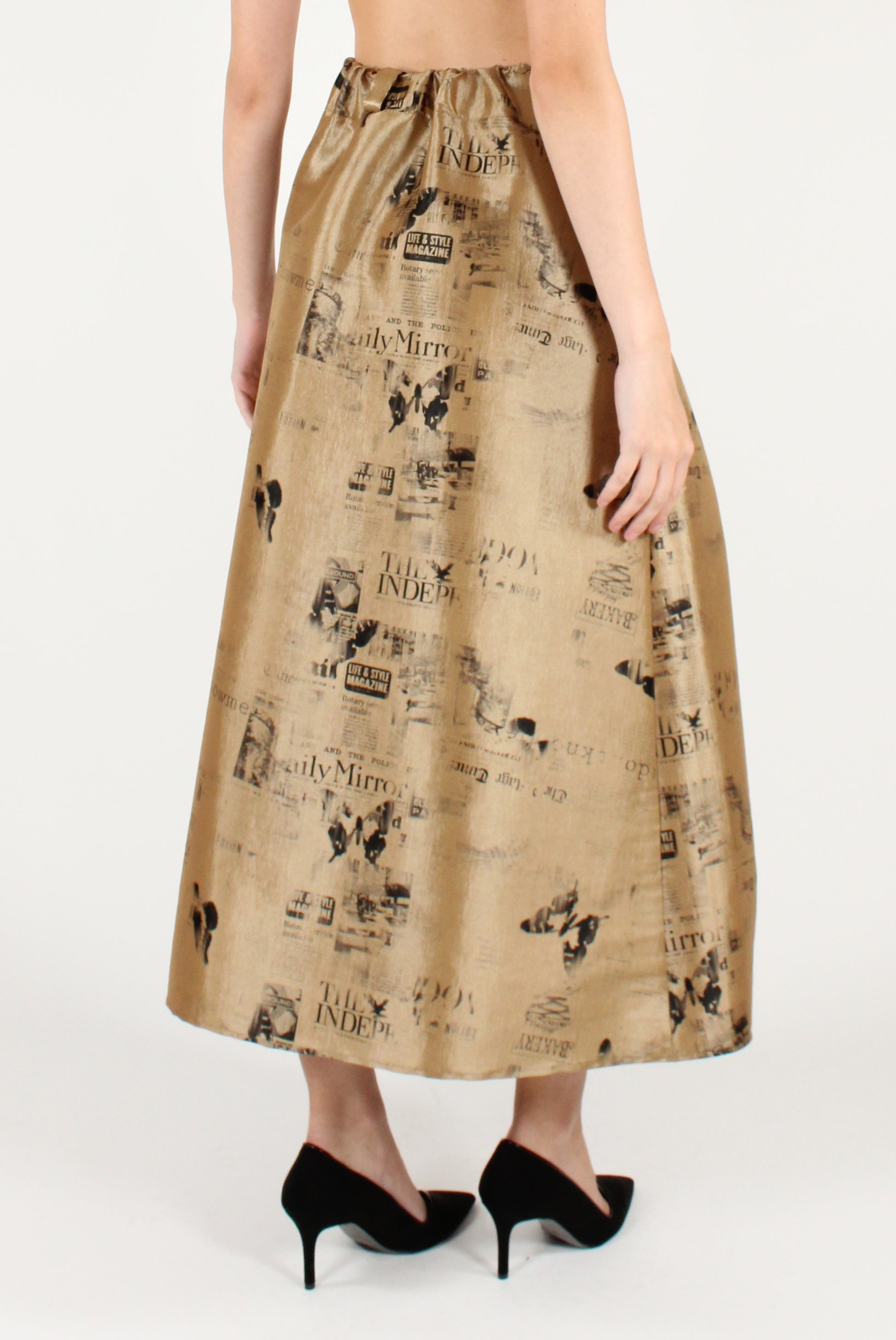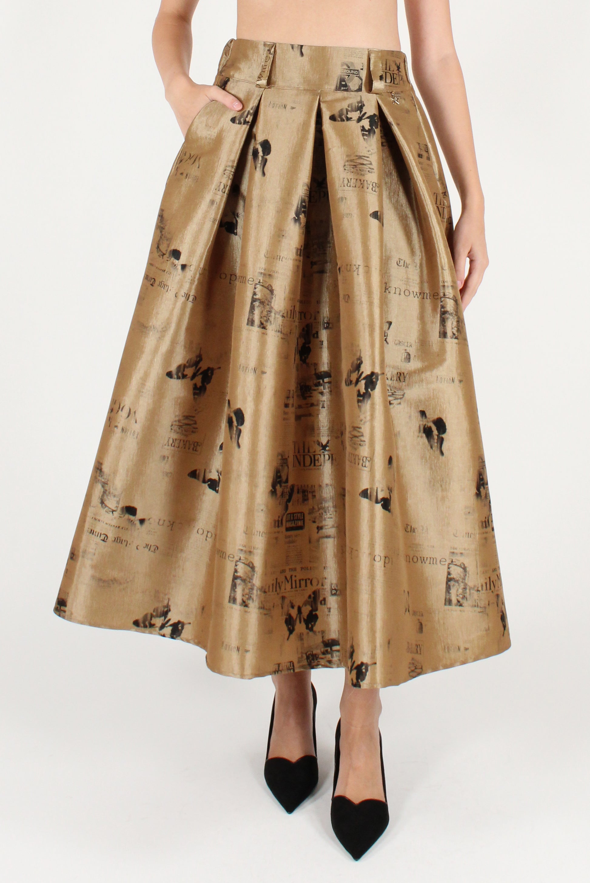 Gonna a ruota stampa fantasia giornali. Con tasche laterali ed elastico in vita solo sul retro, con passanti.