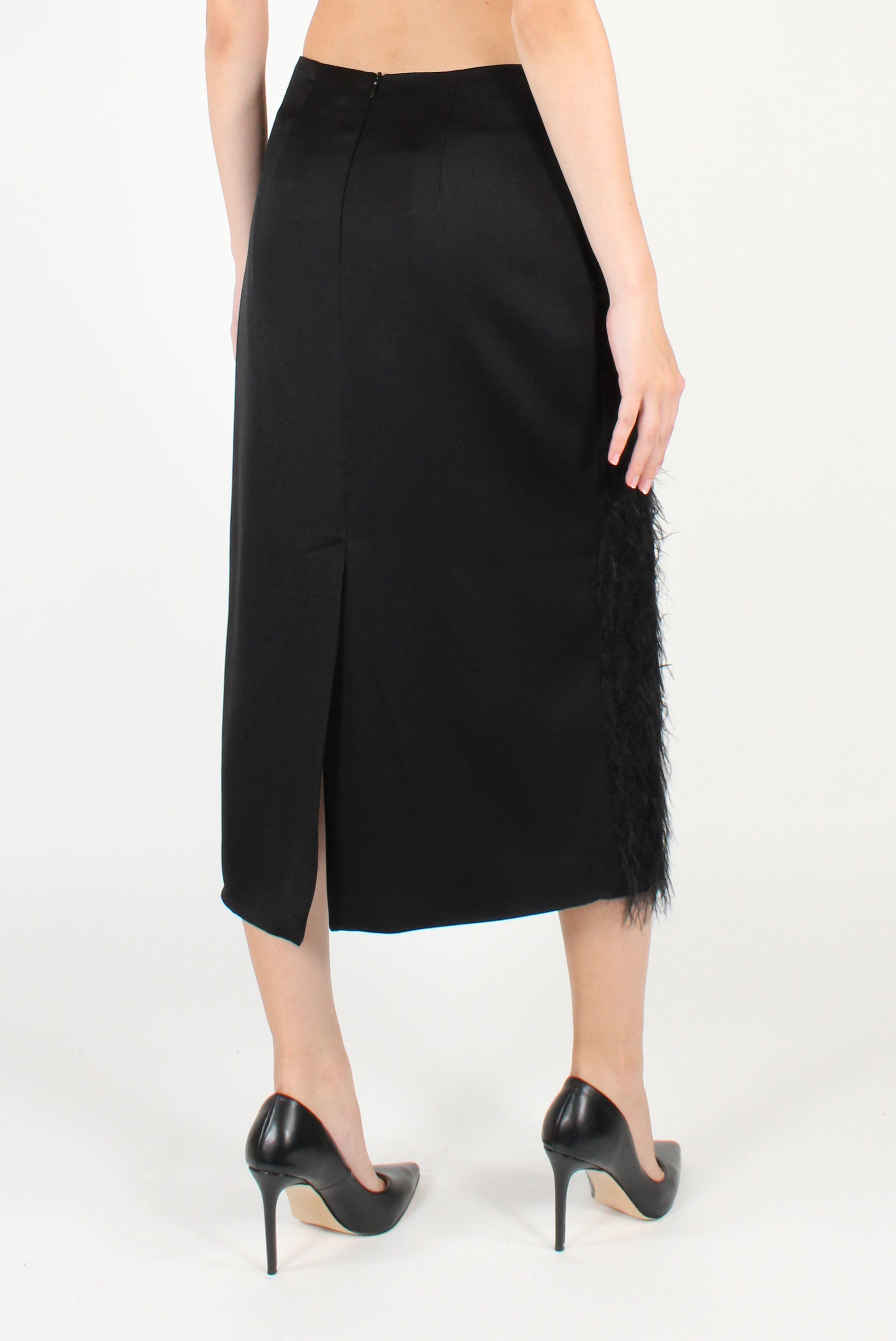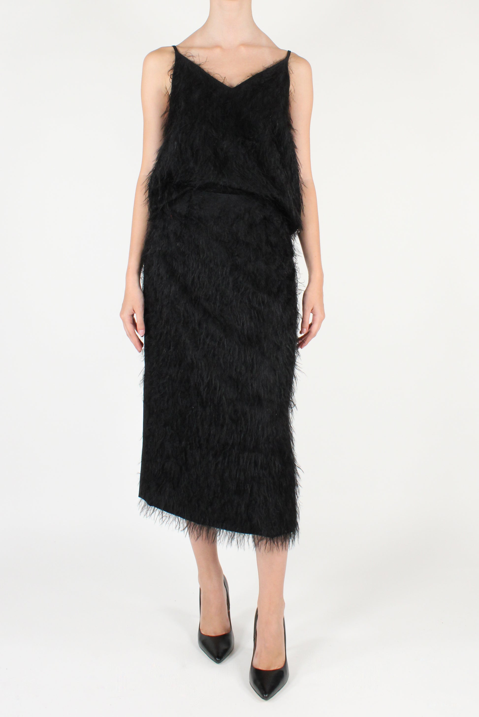Gonna longuette fluffy solo sul davanti. A tubino, con spacco sul retro e chiusura a zip. Top coordinato disponibile.