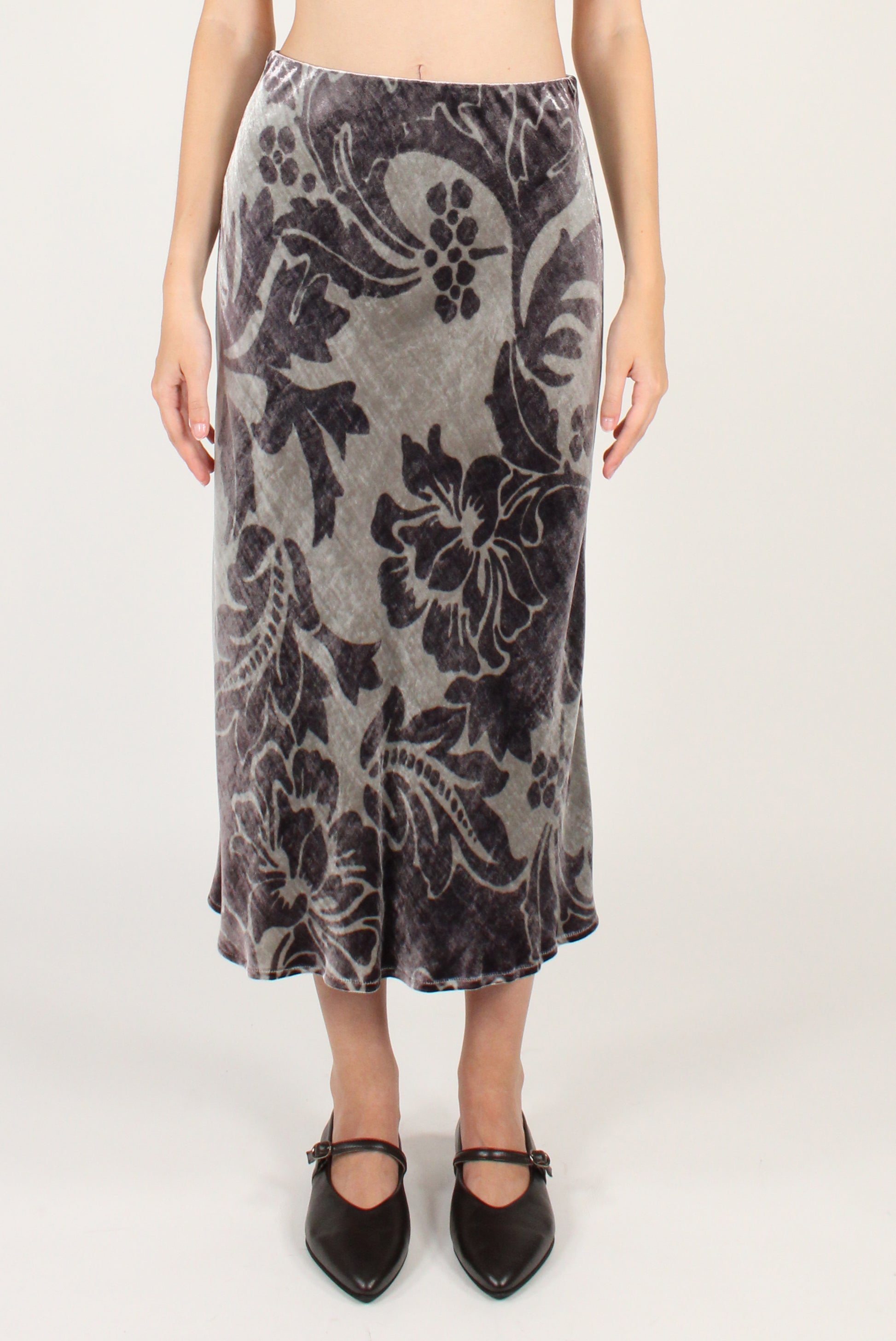 Gonna lunga svasata in velluto stampato a decorazione floreale in viscosa misto seta. Con elastico interno in vita. Top smanicato coordinato disponibile.