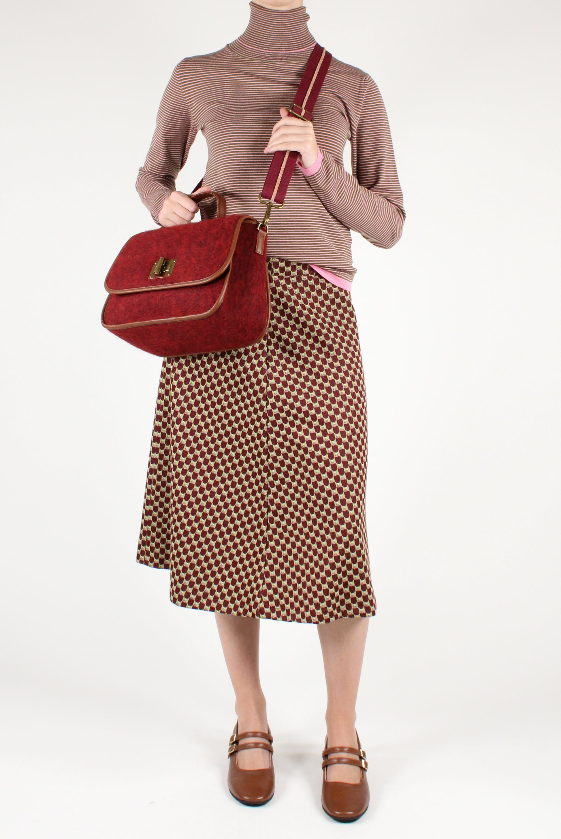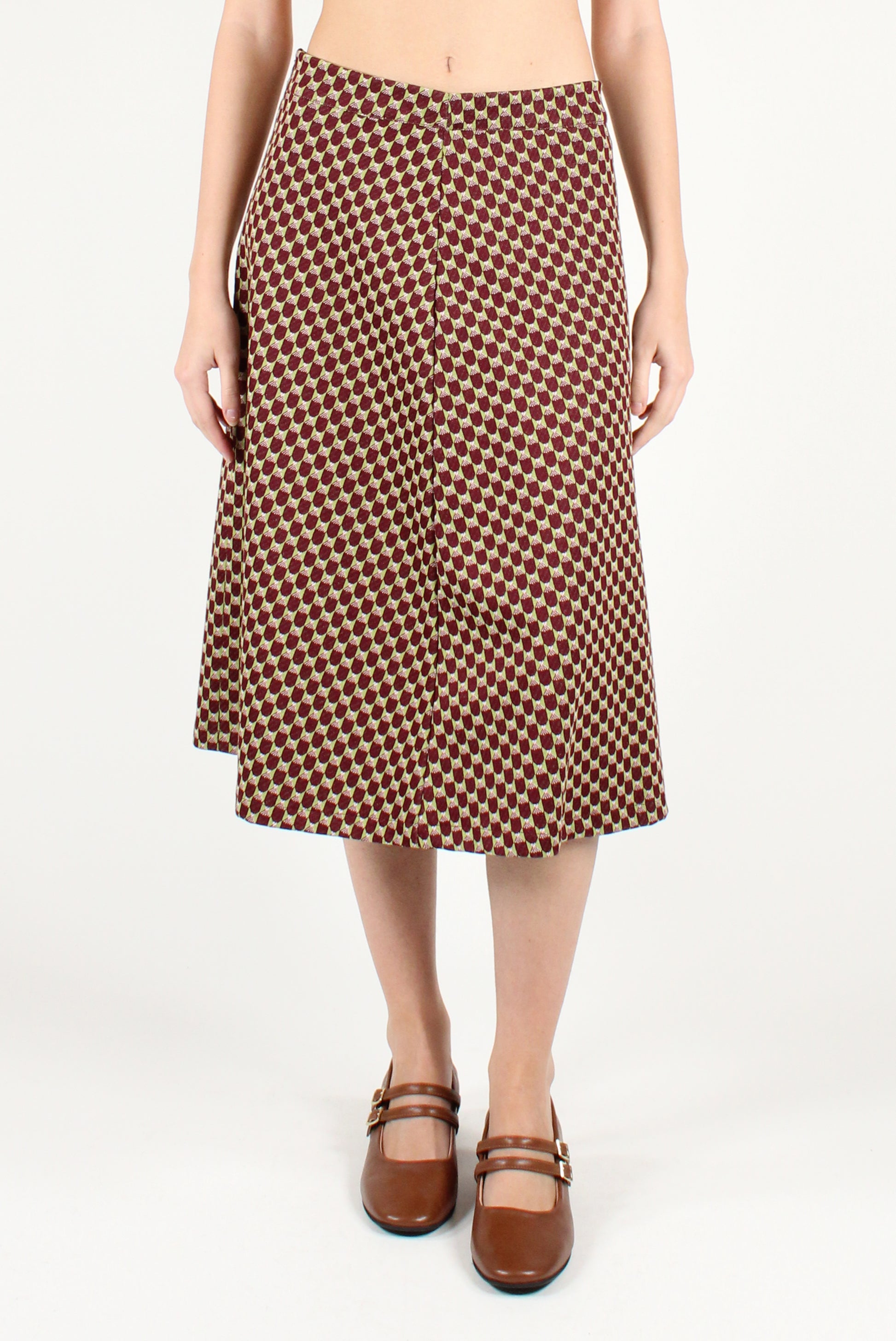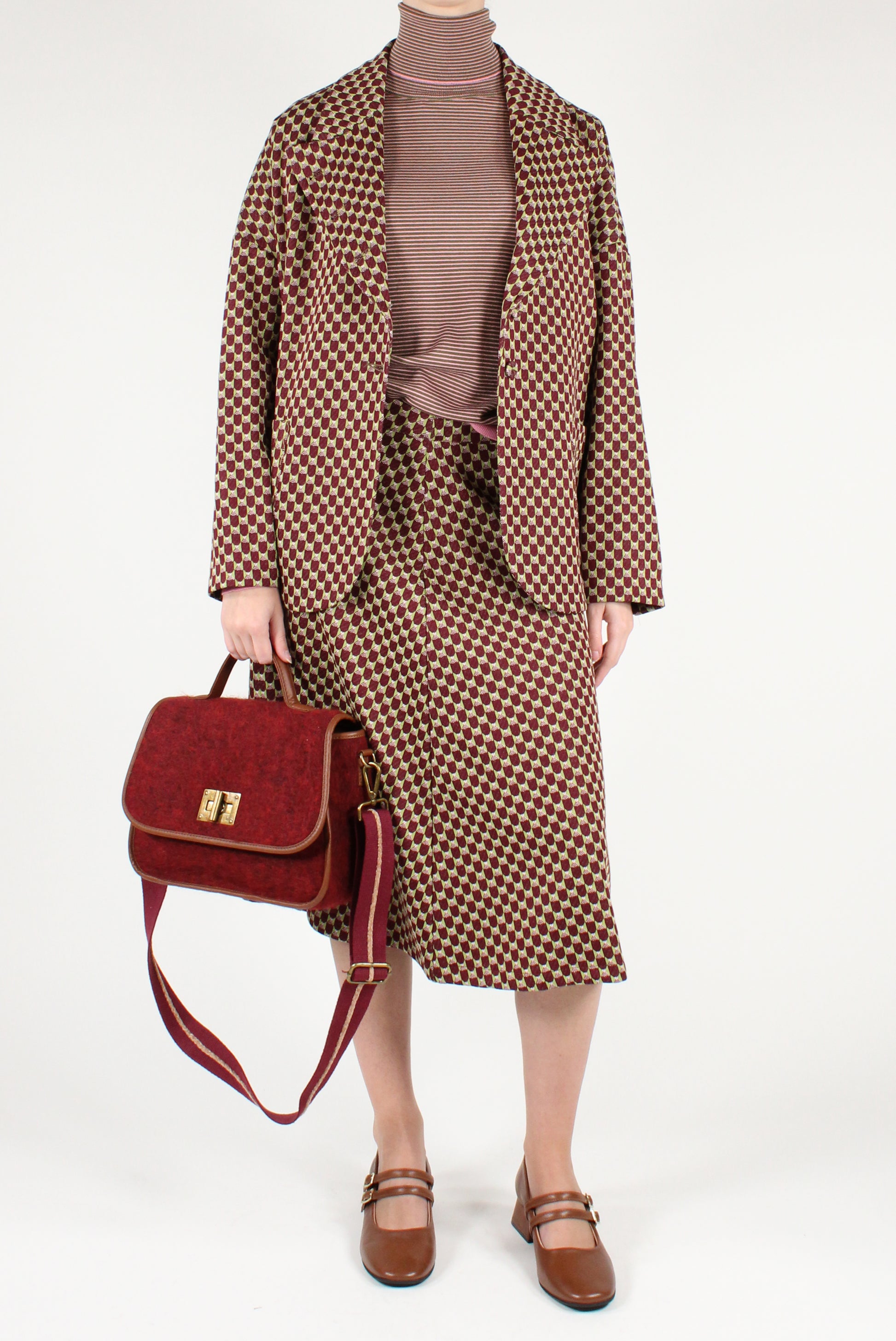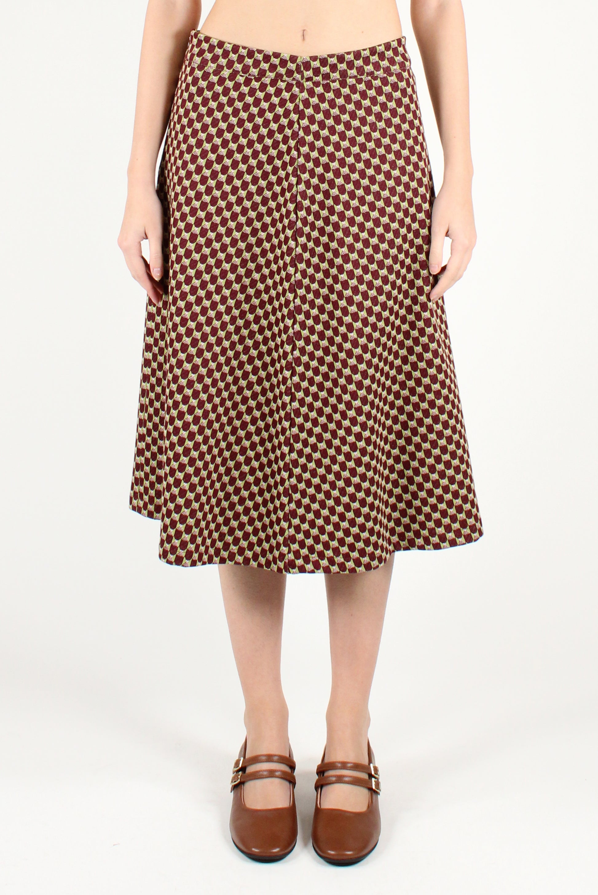 Gonna midi svasata a fantasia geometrica. Chiusura a zip sul retro, leggermente elasticizzata. Giacca coordinata disponibile.