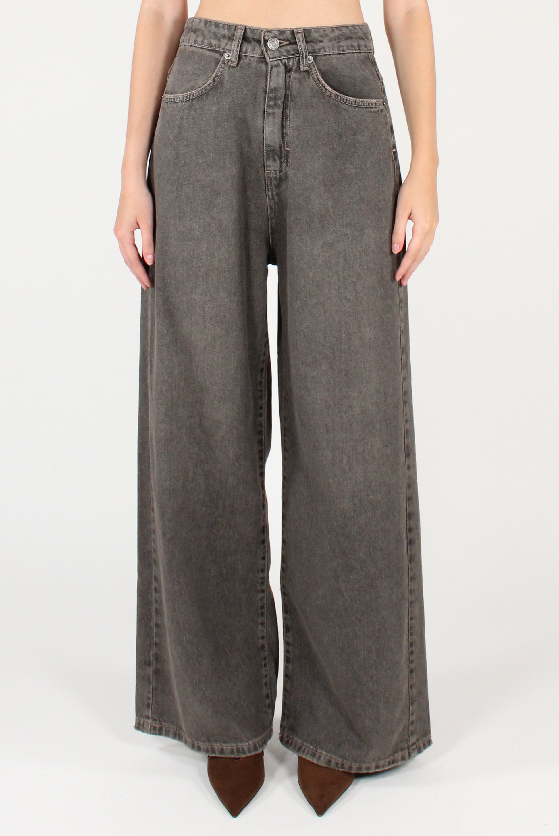 Jeans a palazzo con tasconi sul retro e tasche frontali, lavaggio color tortora. Modello a palazzo, con chiusura a zip e bottone e passanti.