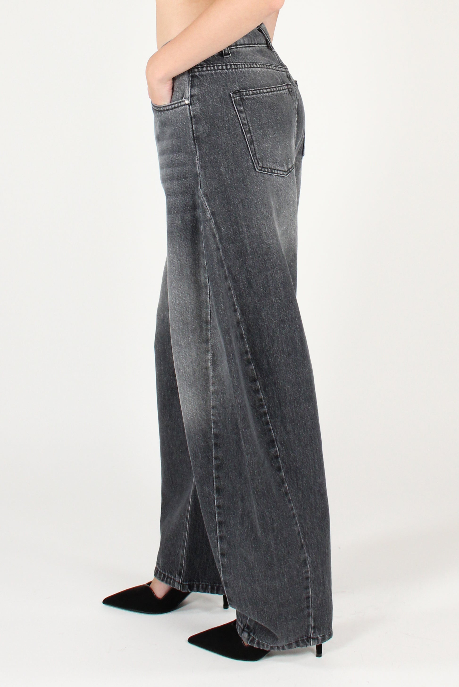 Jeans balloon banana con cuciture laterali a spicchi. Modello cinque tasche con chiusura a zip e bottone.