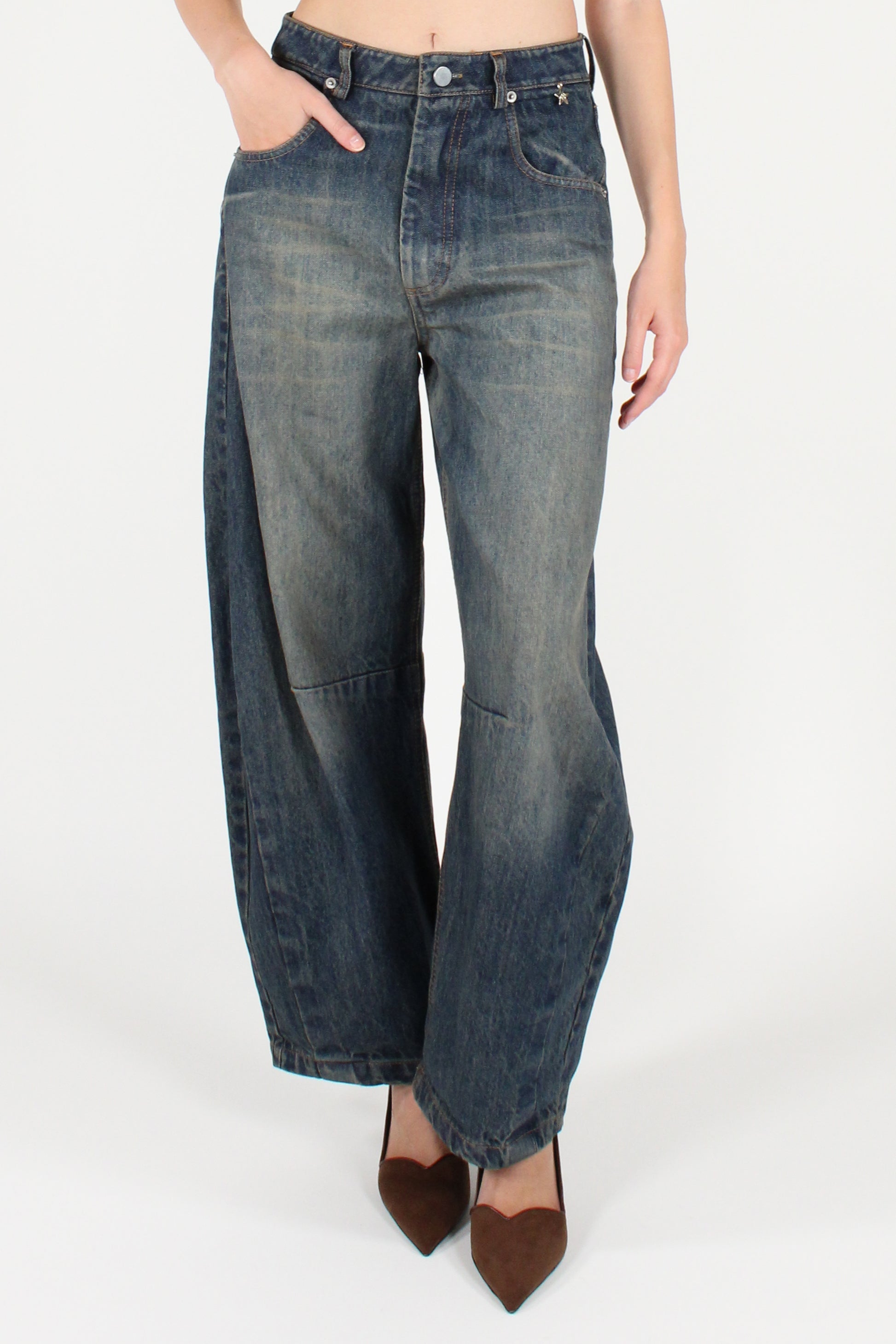 Jeans balloon effetto délavé. Gamba ampia, cinque tasche con chiusura a zip e bottoni, con passanti.