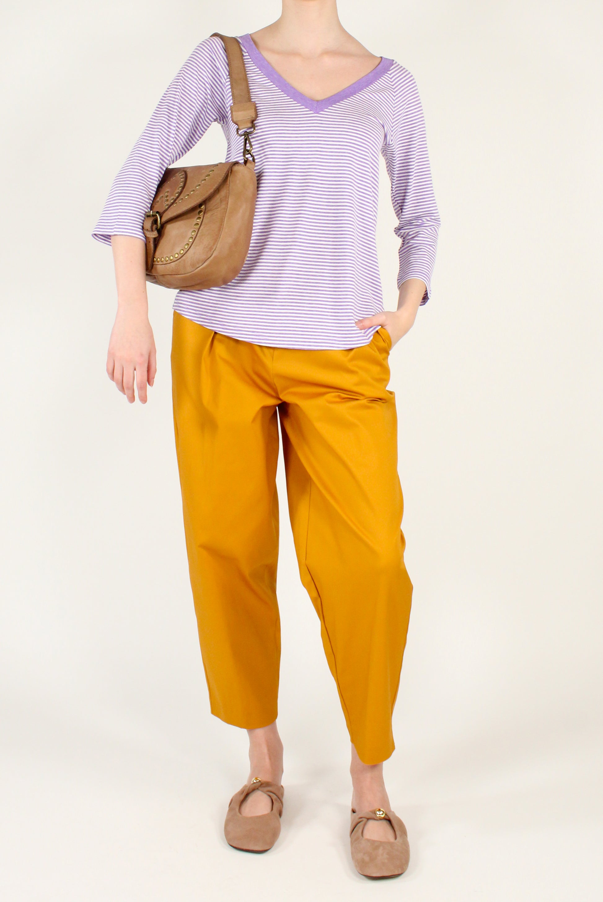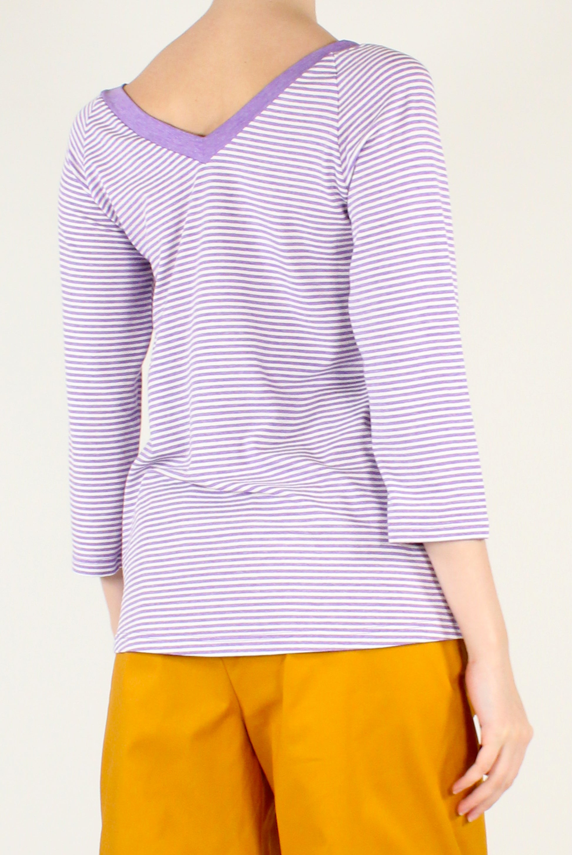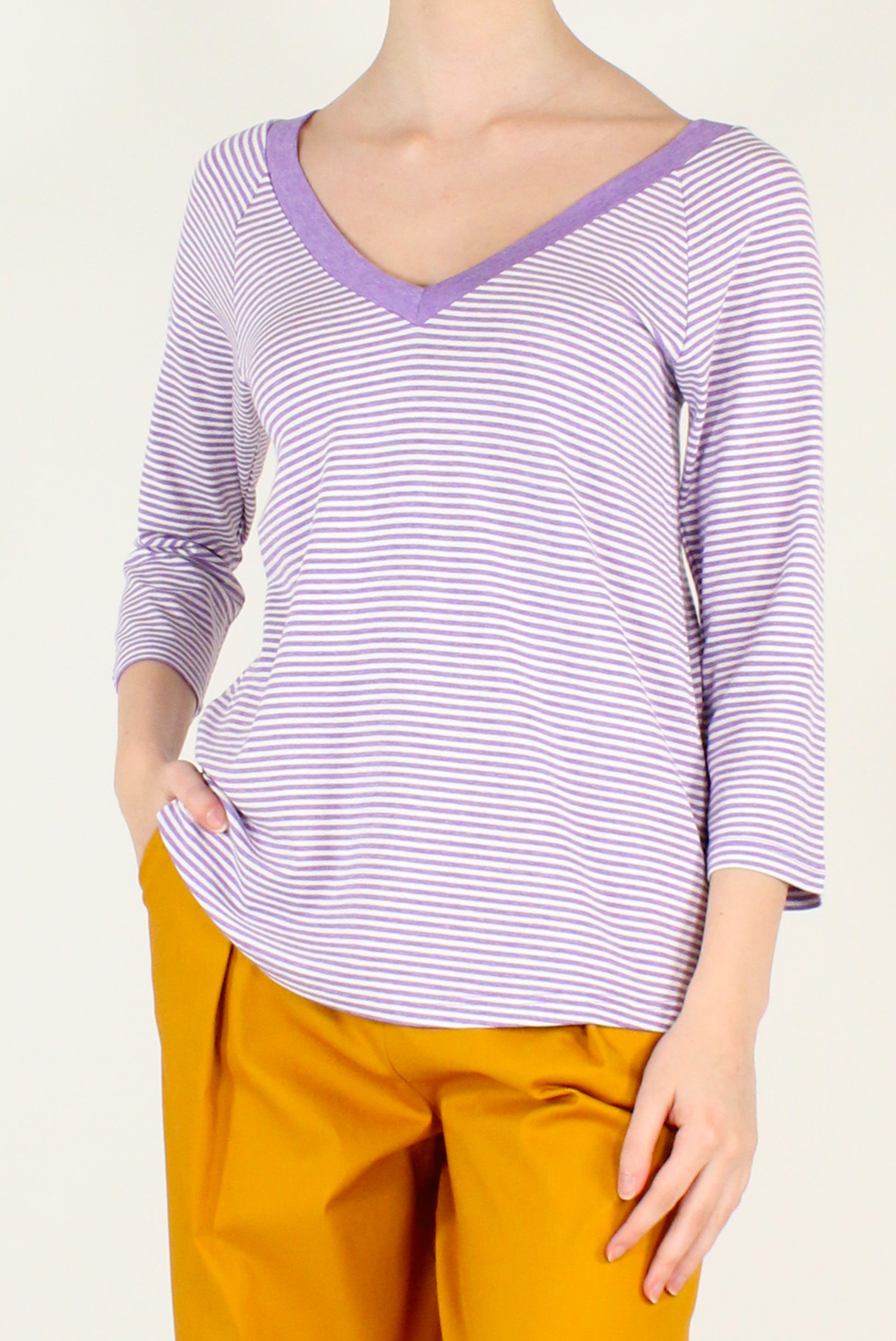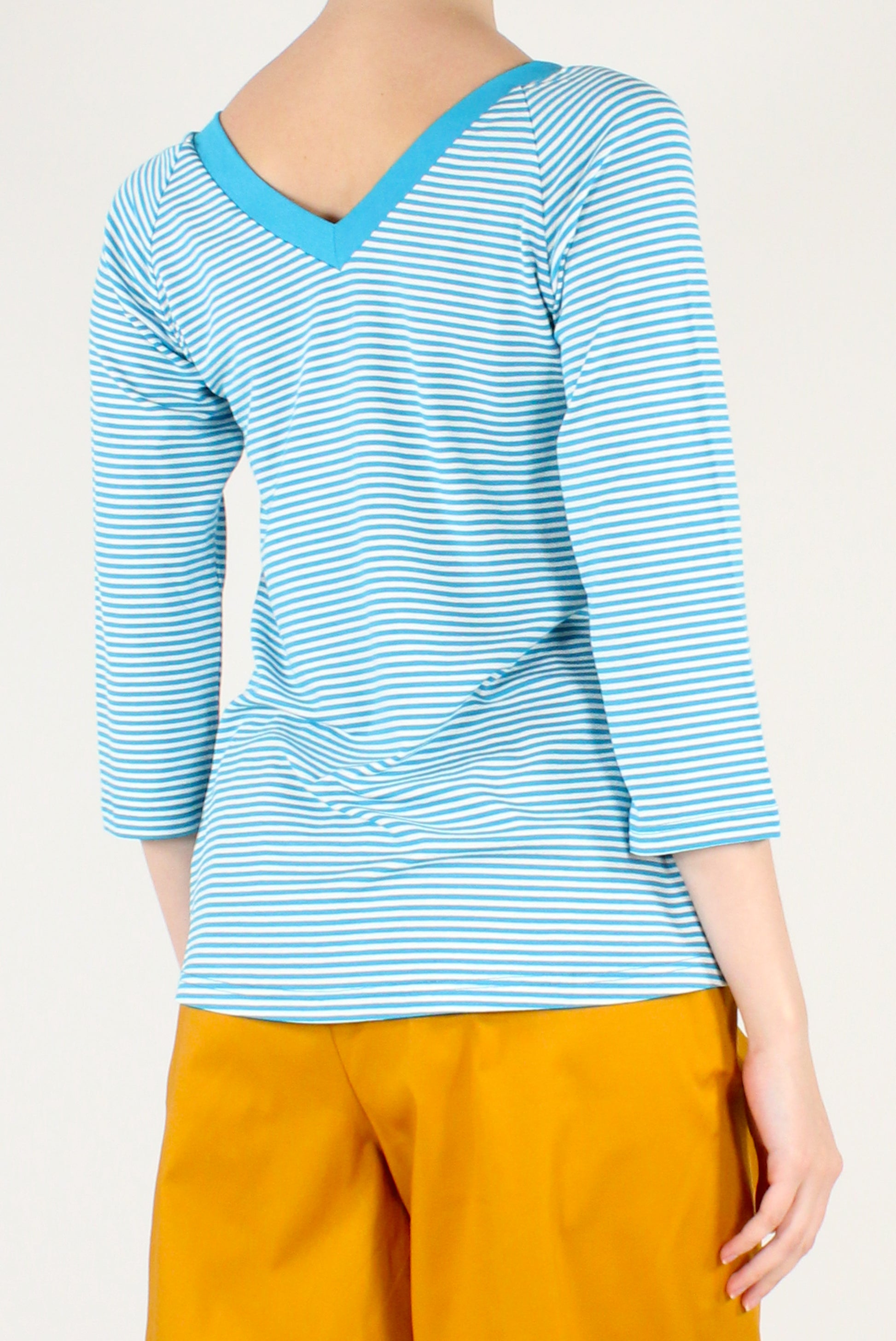 Maglietta da donna a righe con scollo a V sia sul davanti che sul retro. Maniche a 3/4 per una vestibilità versatile e femminile. Perfetta per look casual chic dal gusto contemporaneo.