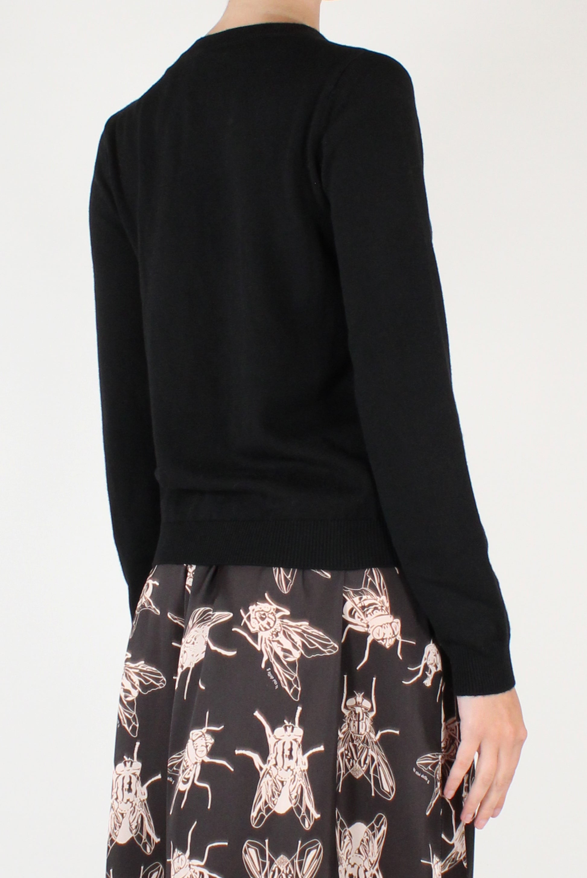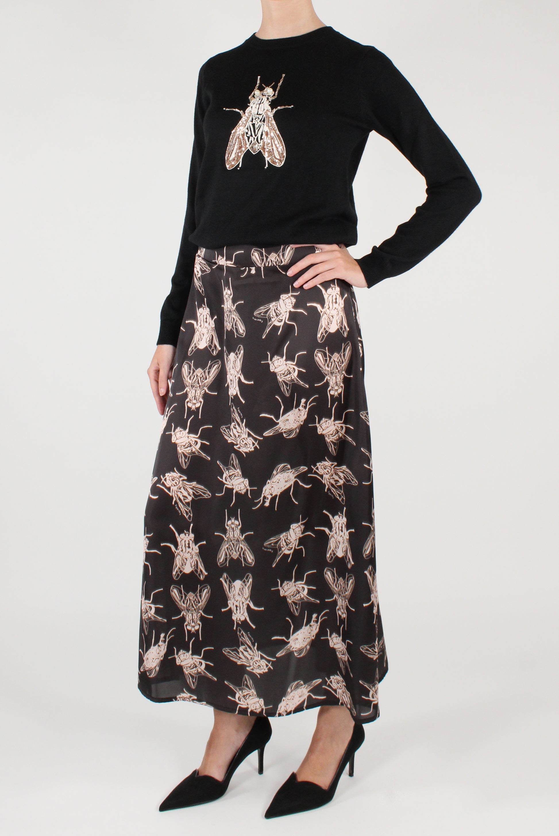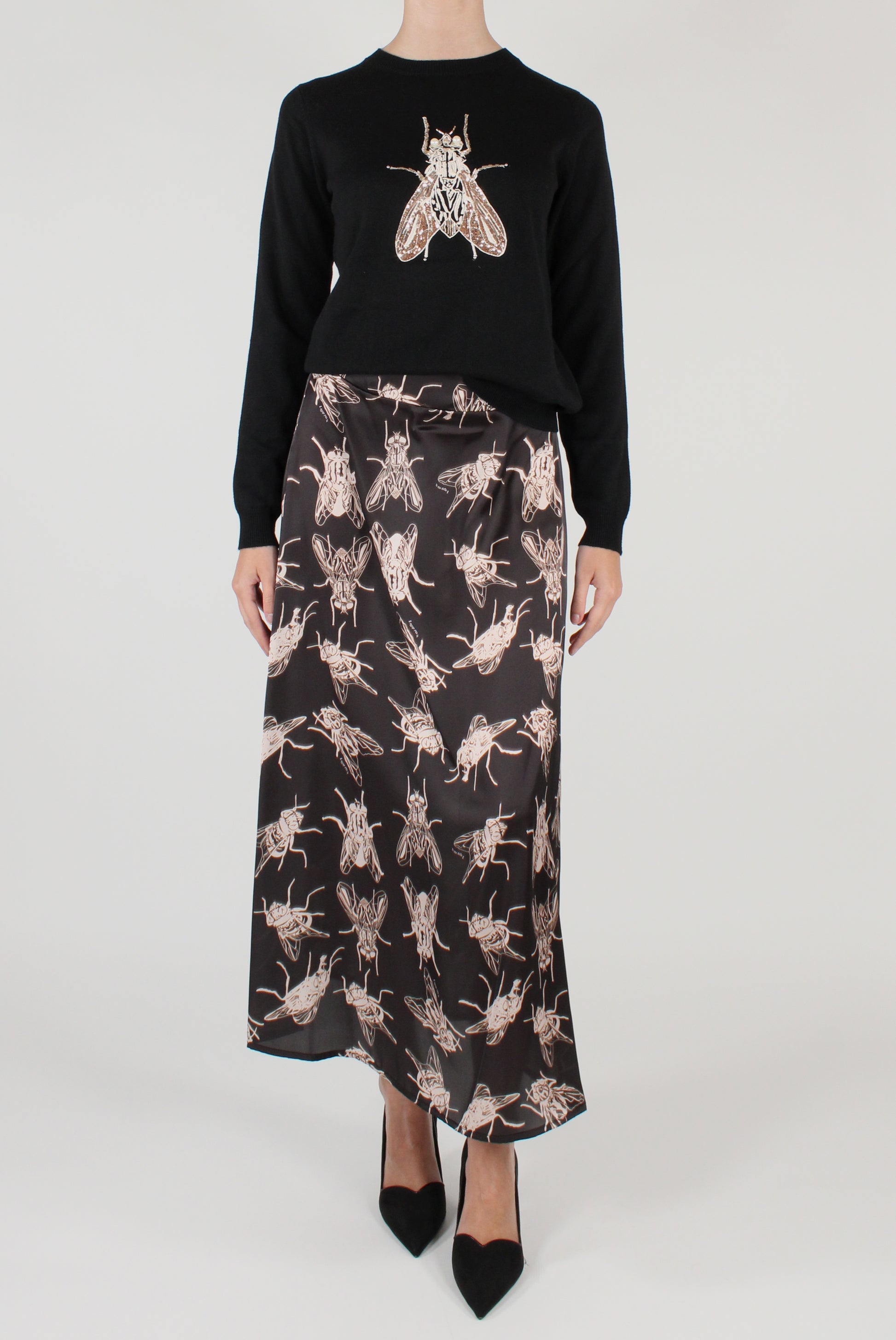 Maglioncino con mosca ricamata a perline e paillettes. Girocollo, a maniche lunghe, vestibilità aderente. Gonna coordinata disponibile.