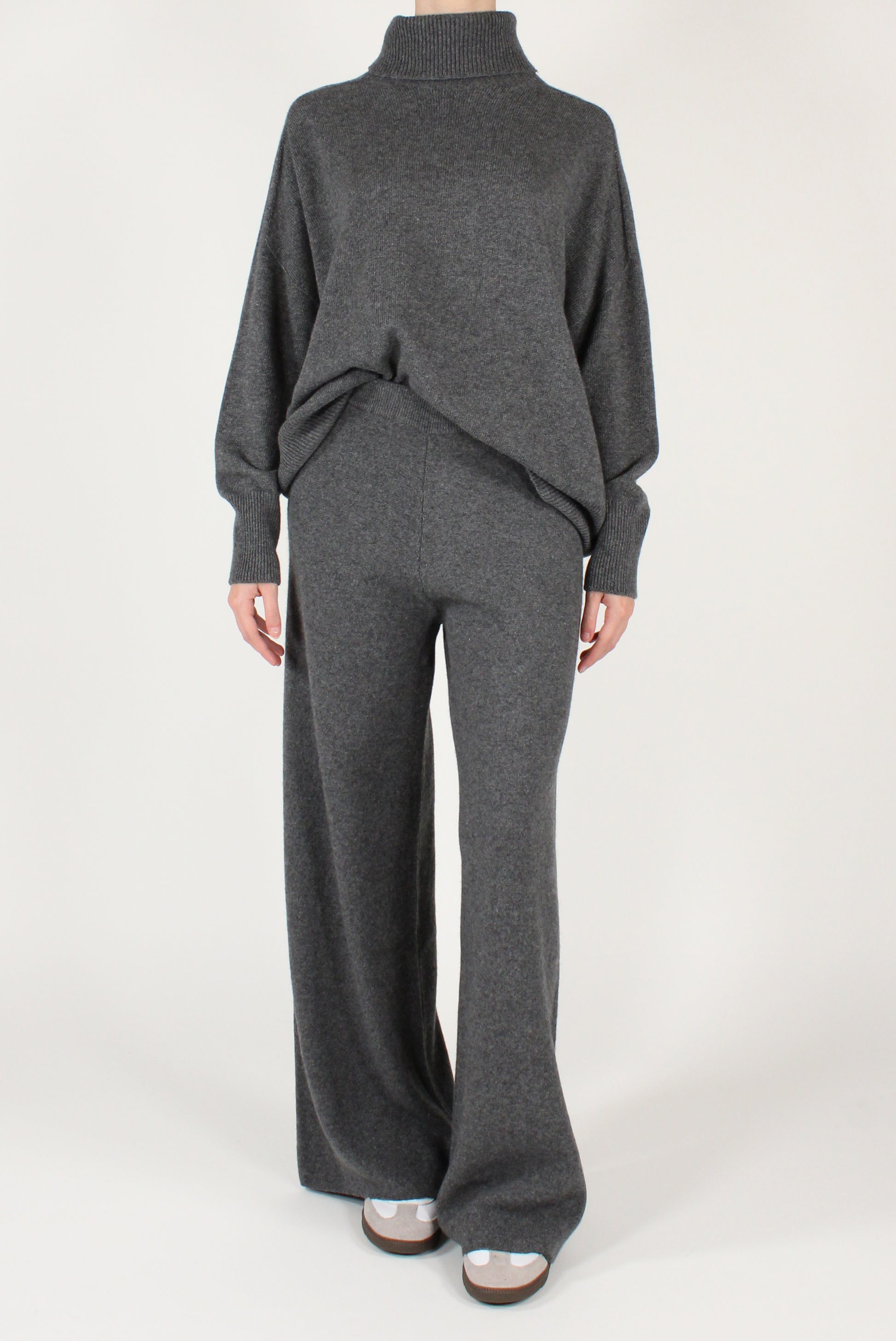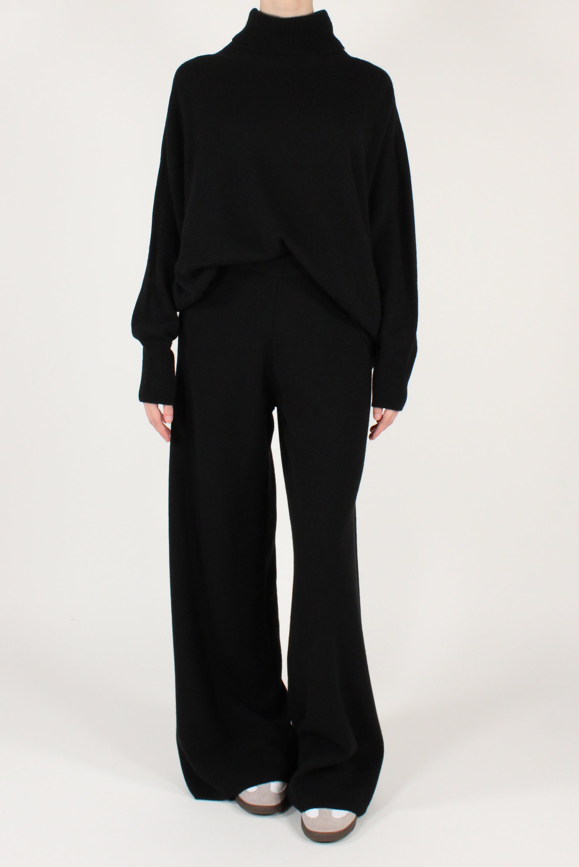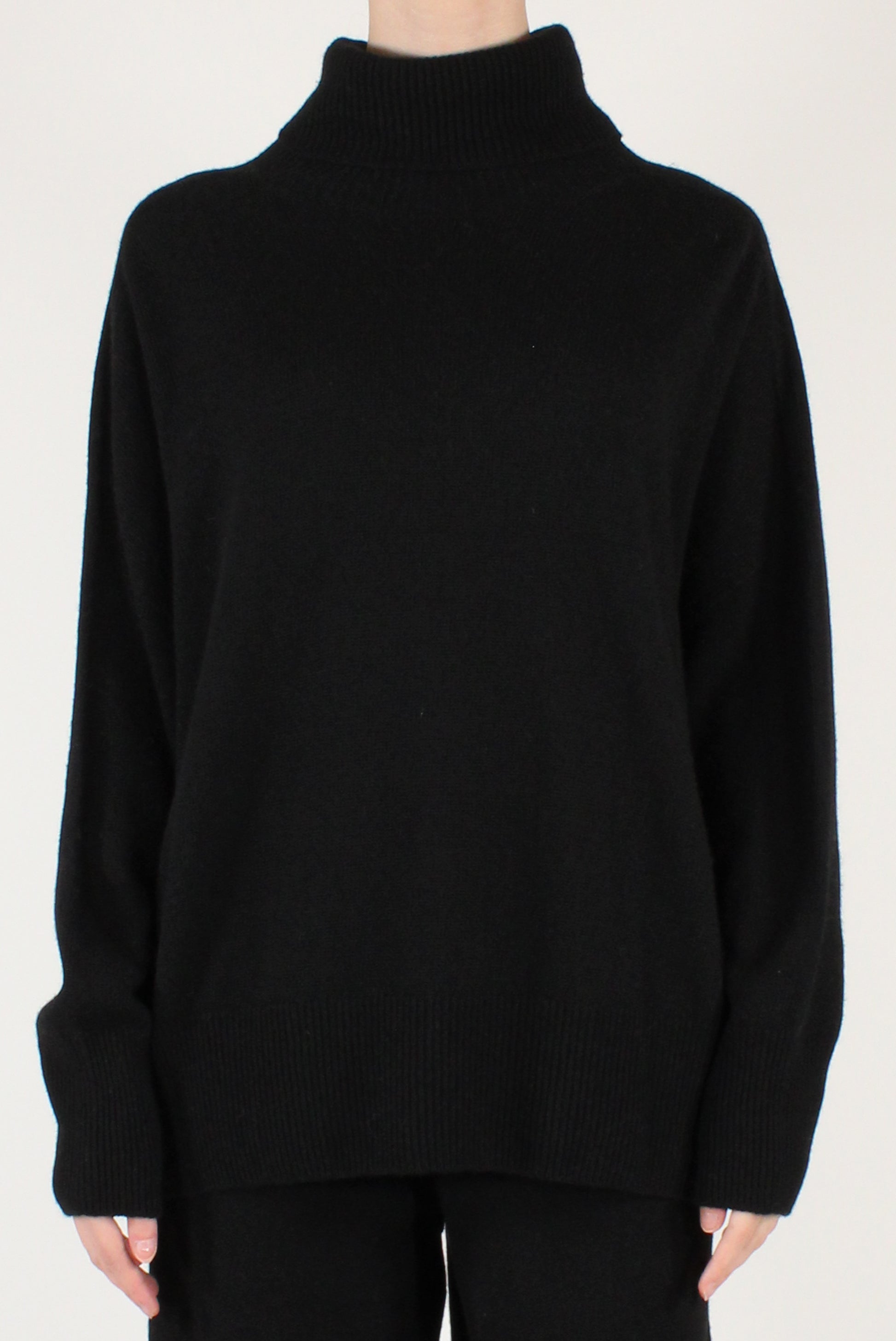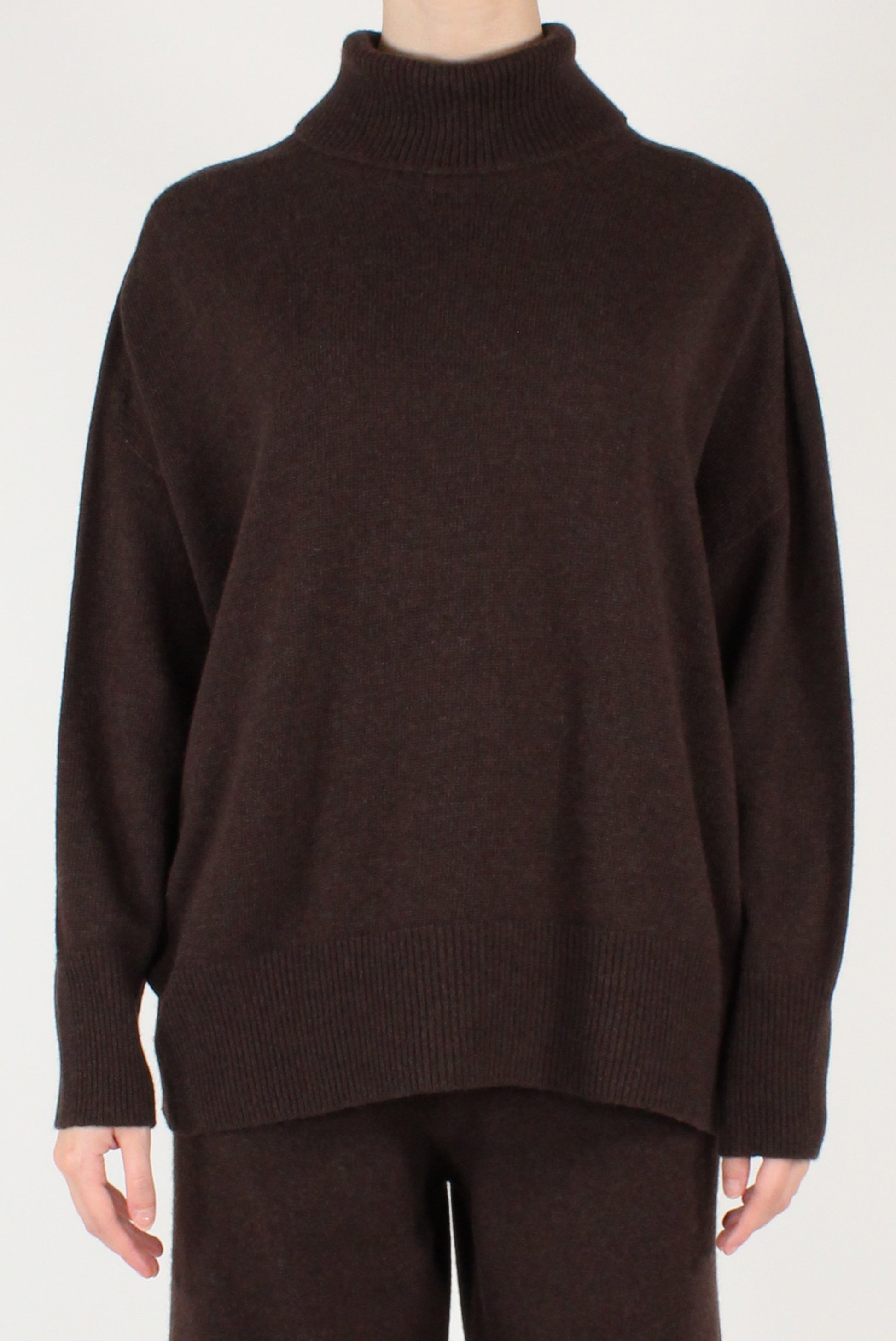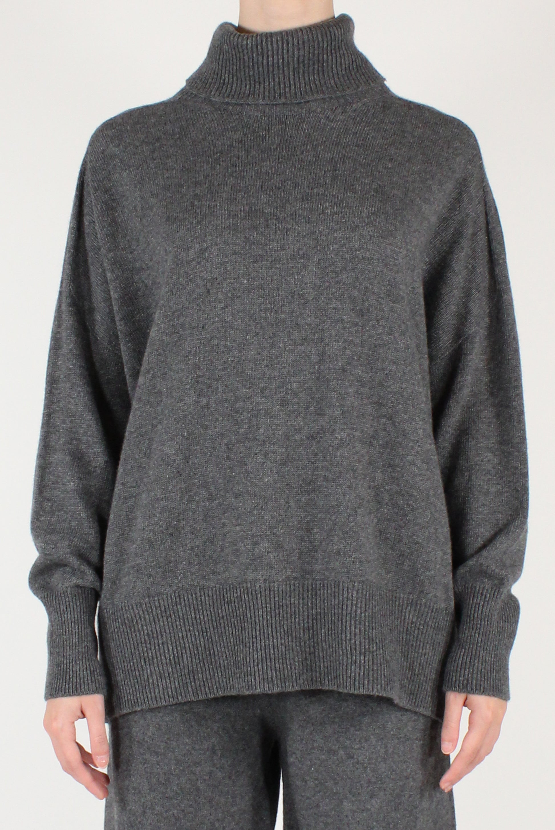 Maglione dolcevita a spalle scese in misto lana. A maniche lunghe, vestibilità over. Dettaglio profili a costine.
