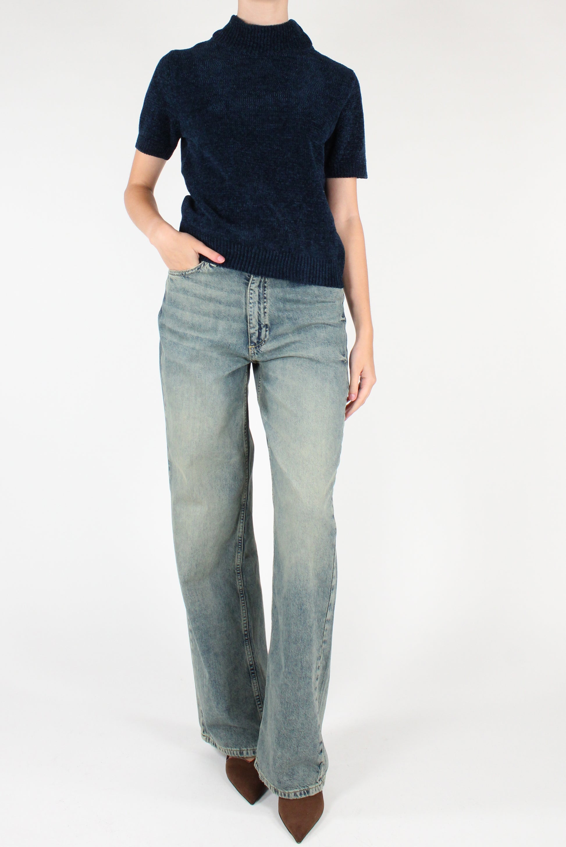 Maglione in ciniglia a collo alto a maniche corte, dettaglio costine ai profili.