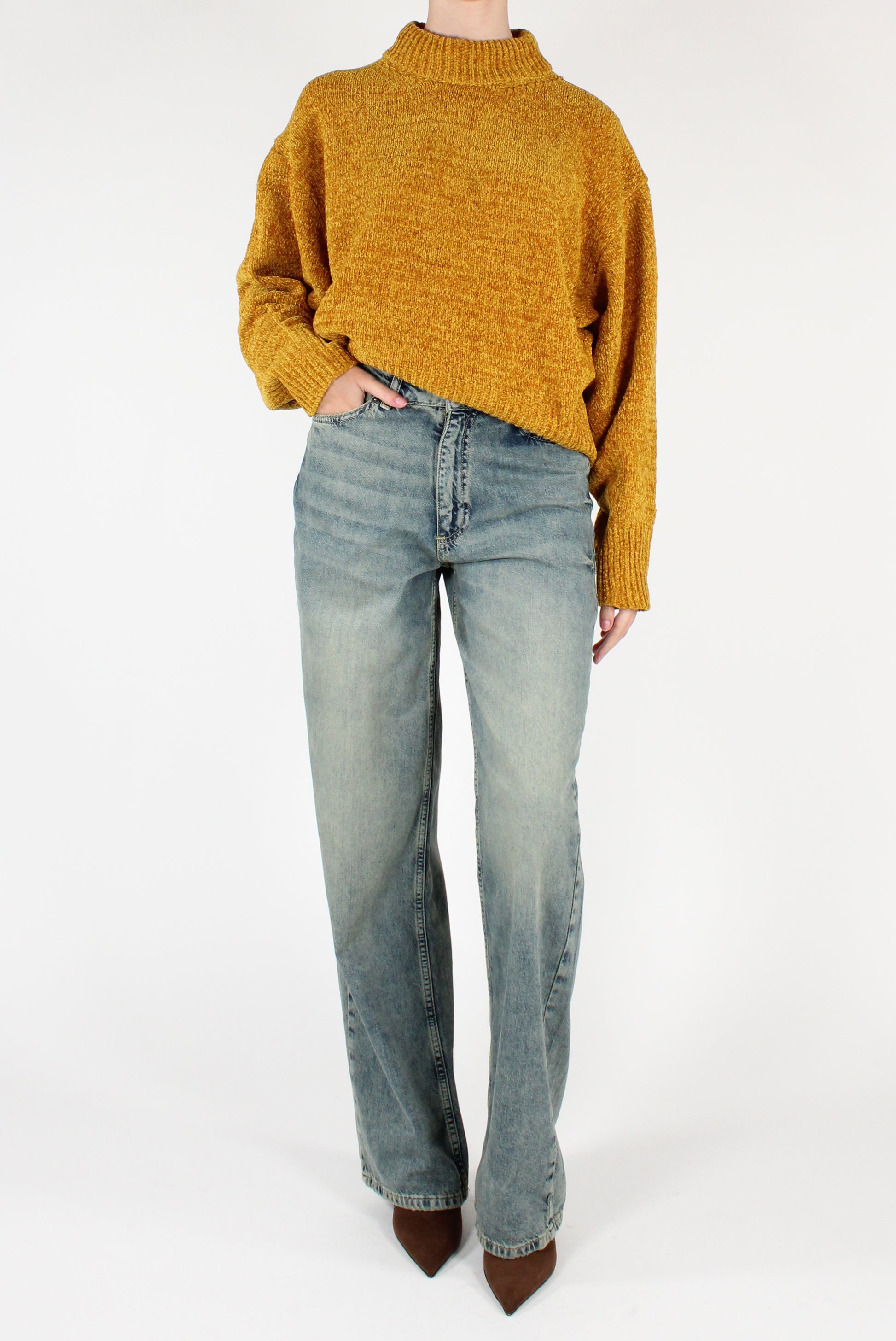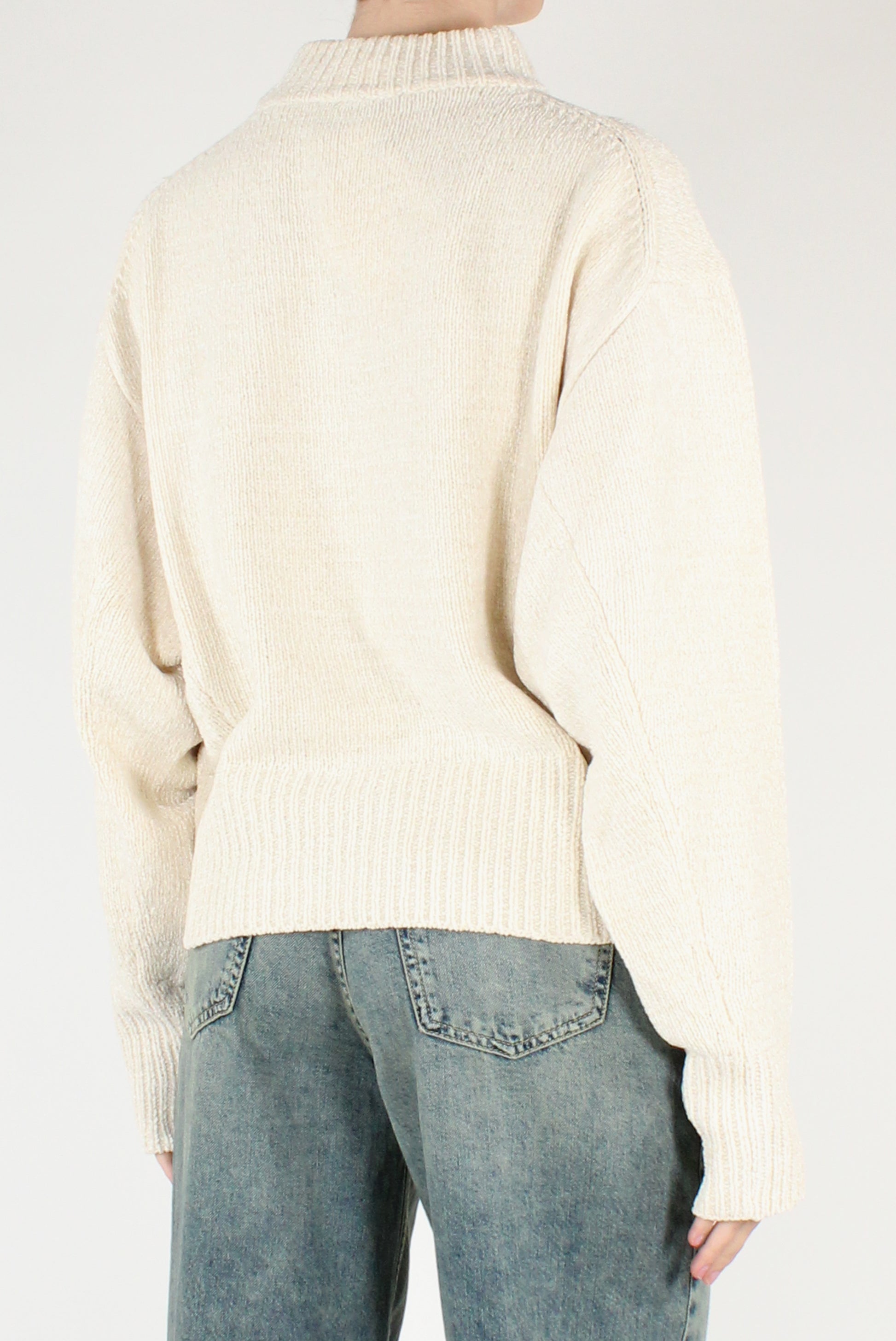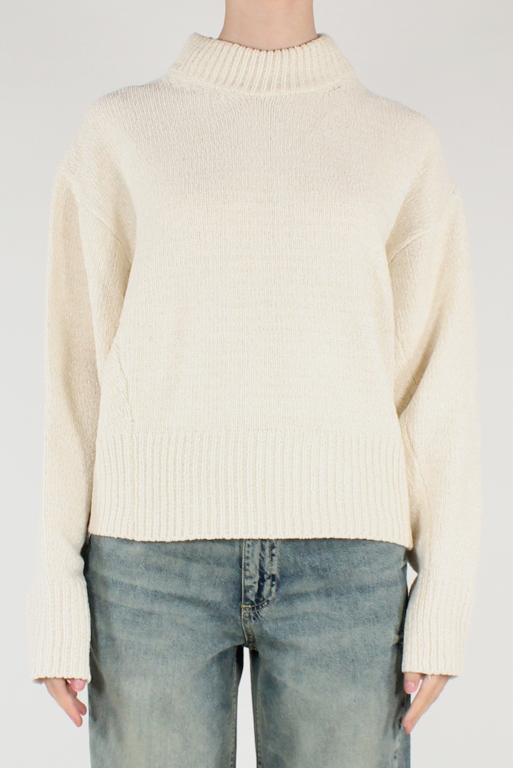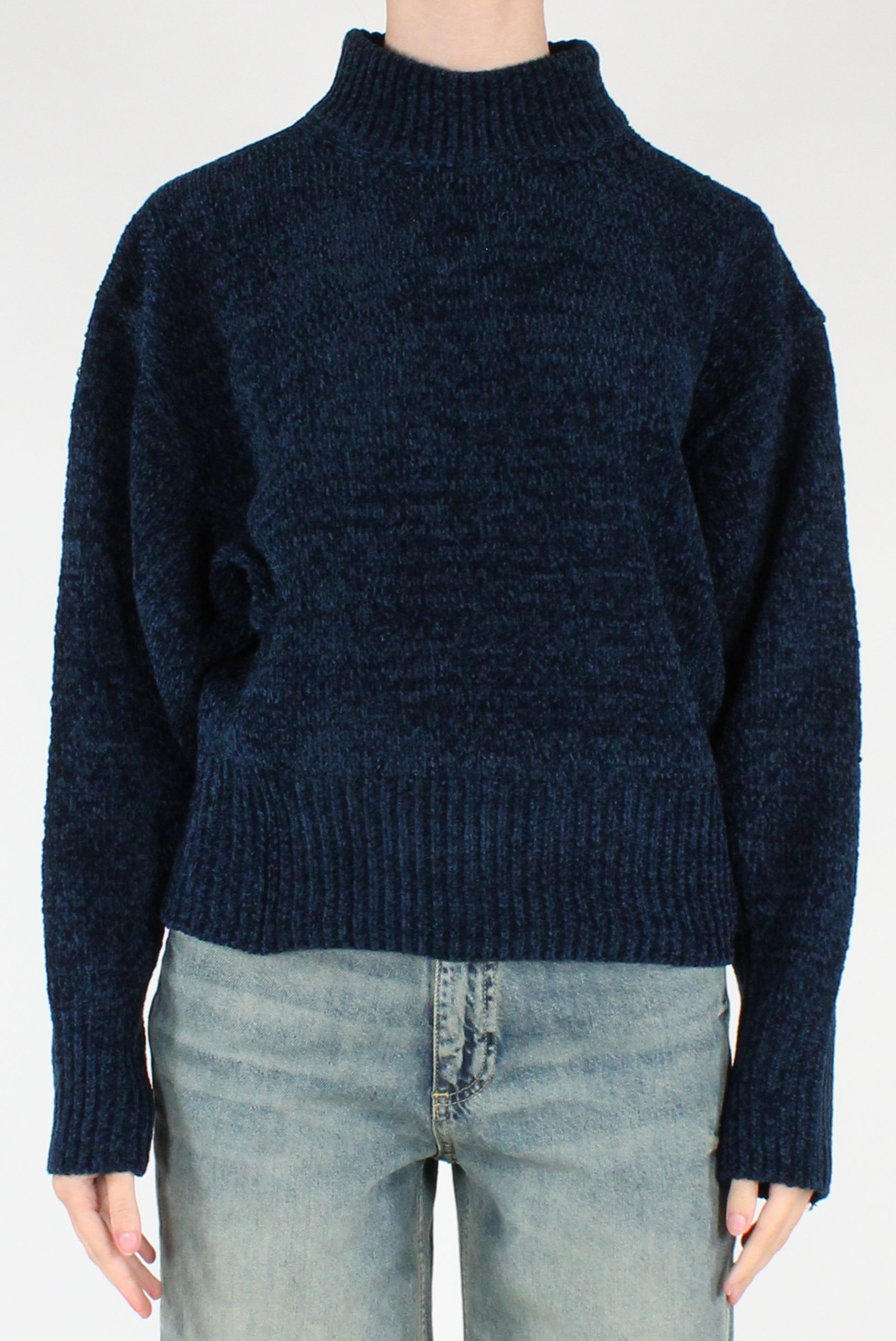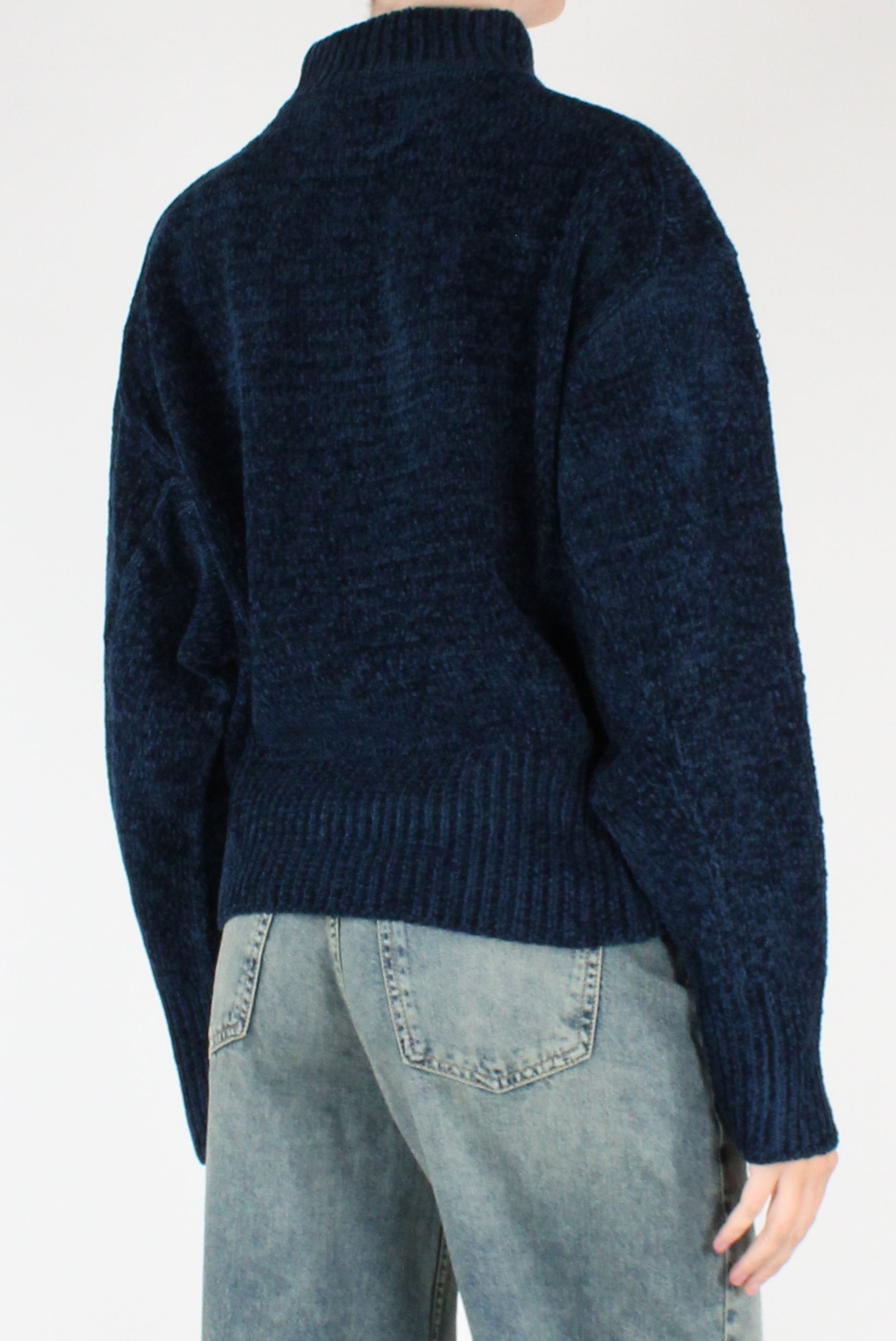 Maglione over in ciniglia. A collo alto, maniche lunghe, con spalle scese.