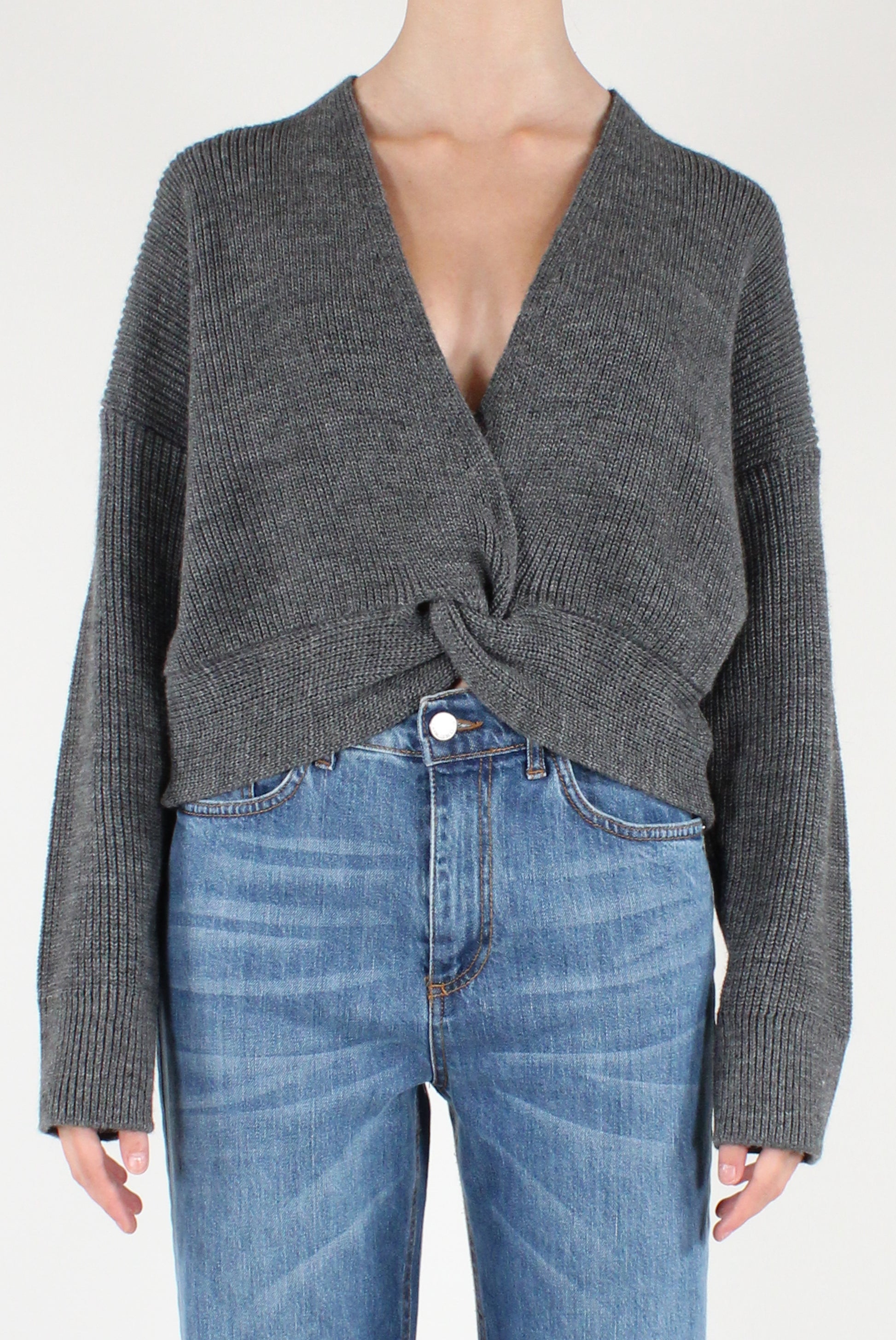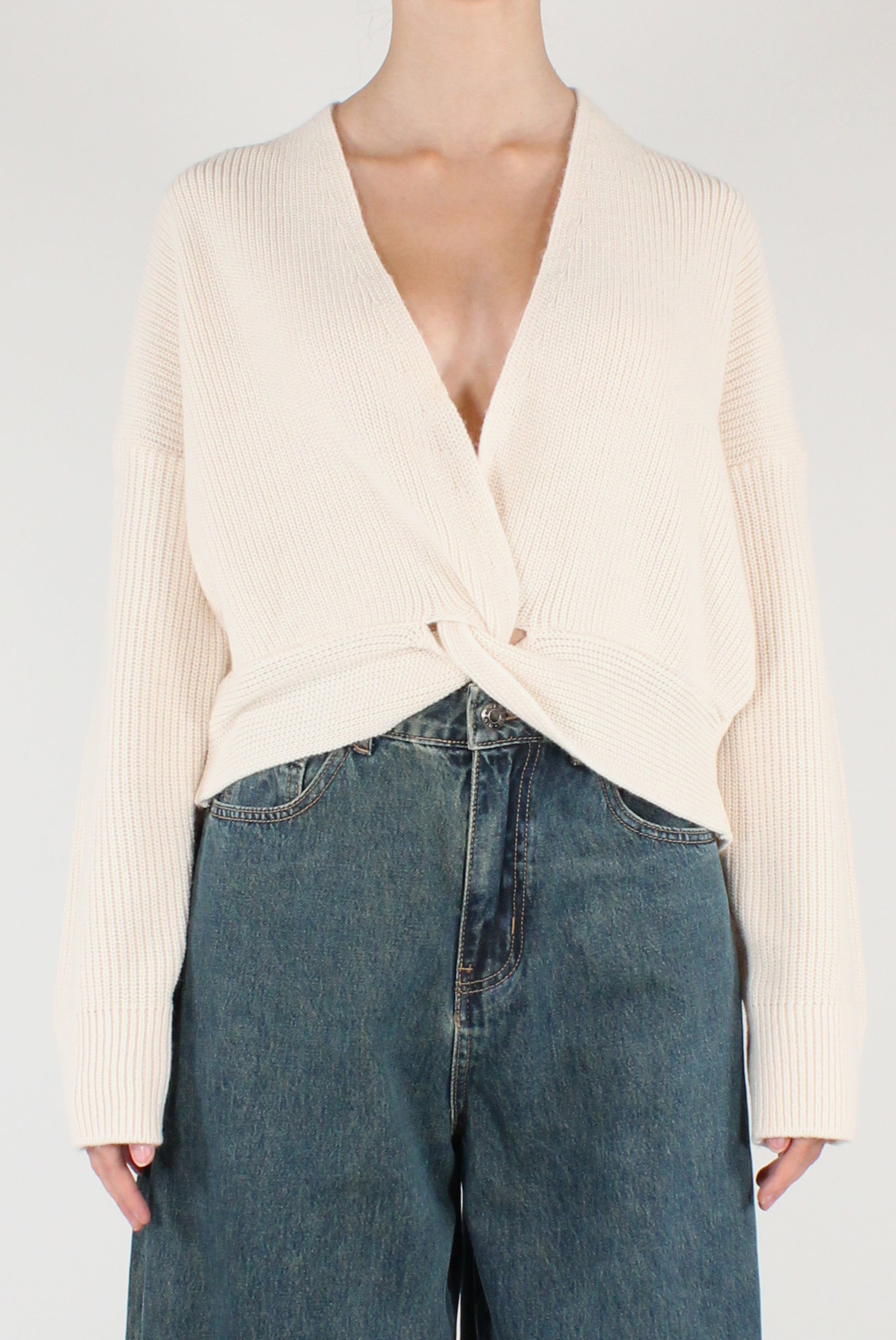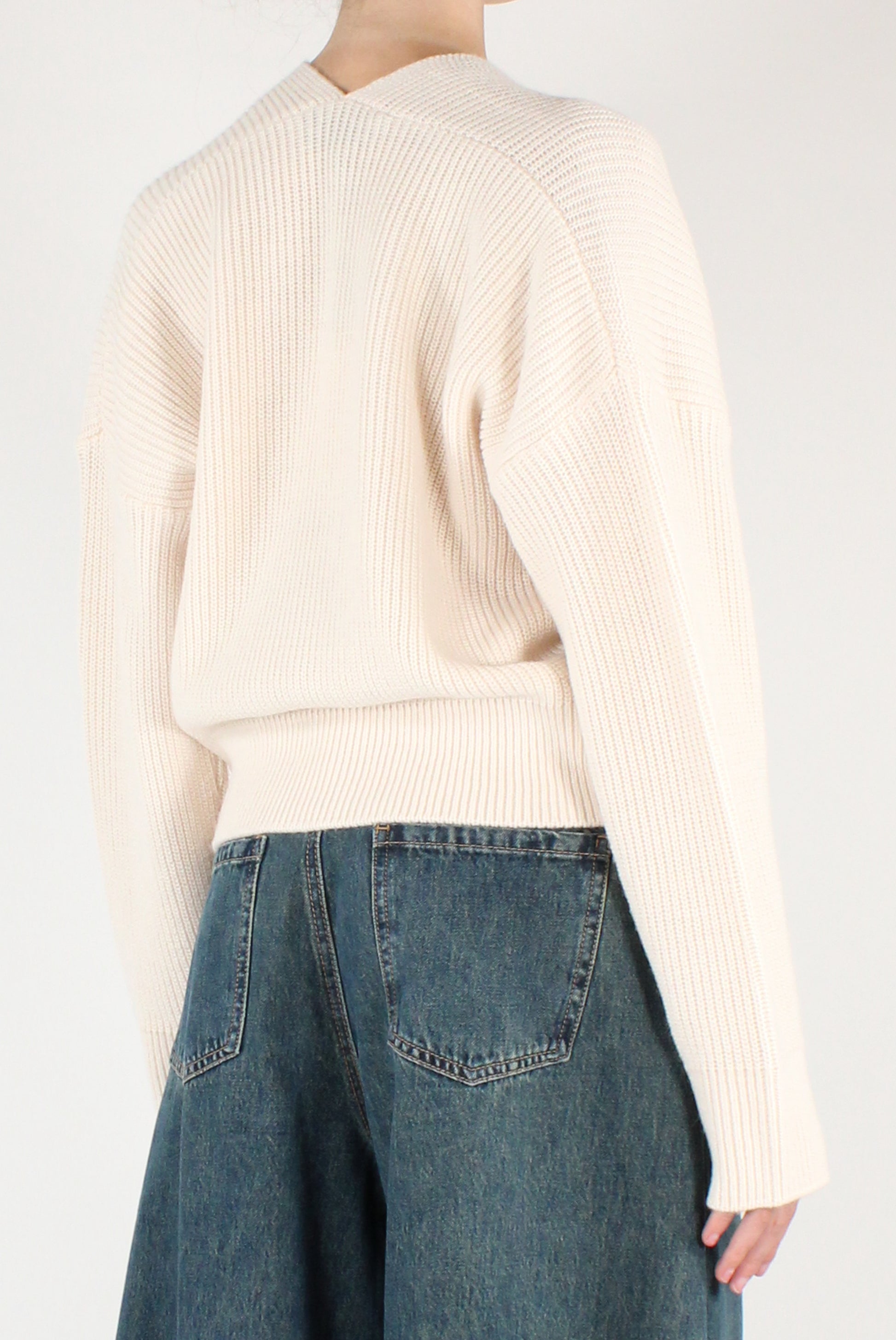 Maglione a scollo profondo incrociato in maglia a punto pannocchia. A maniche lunghe, taglio a scatoletta.