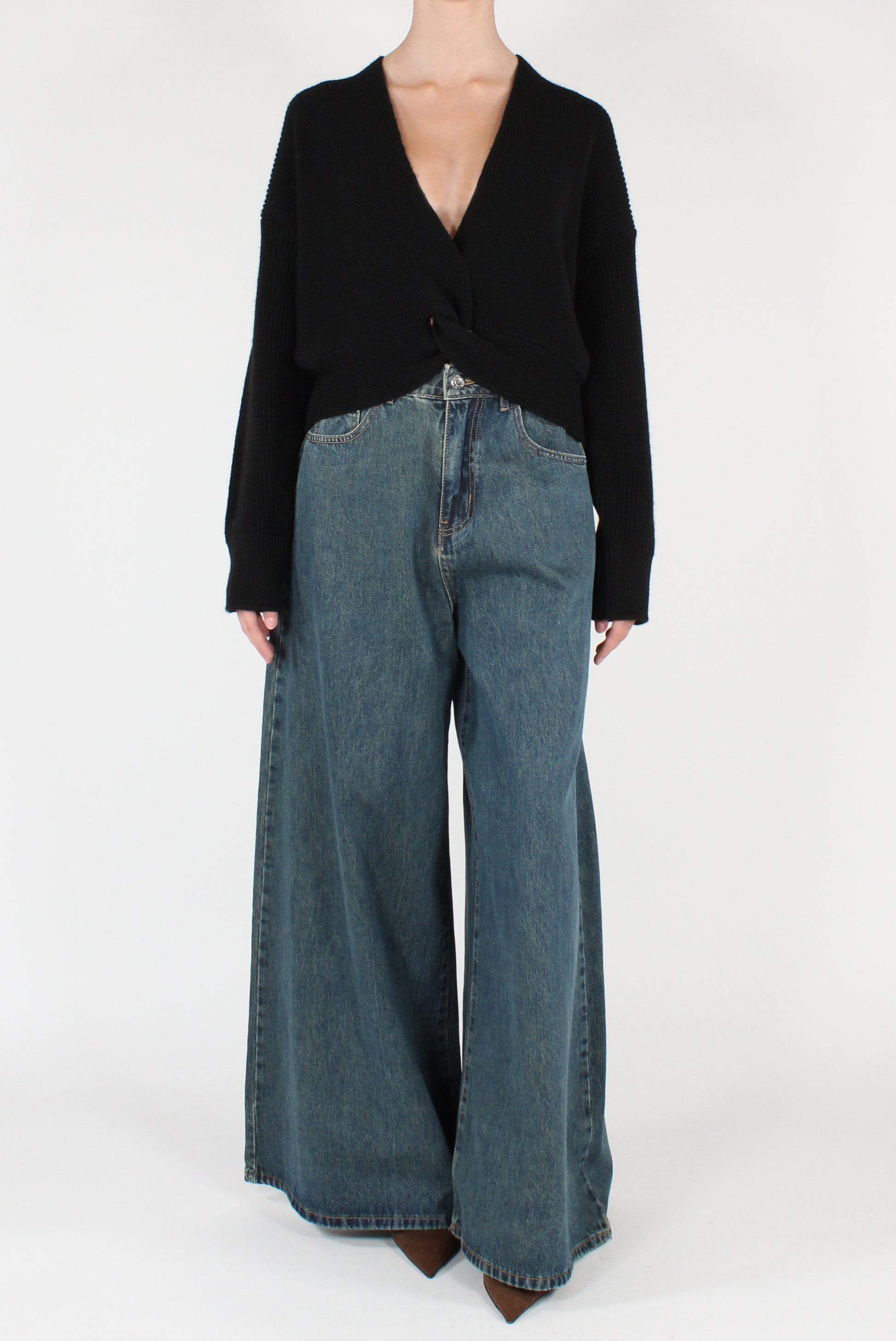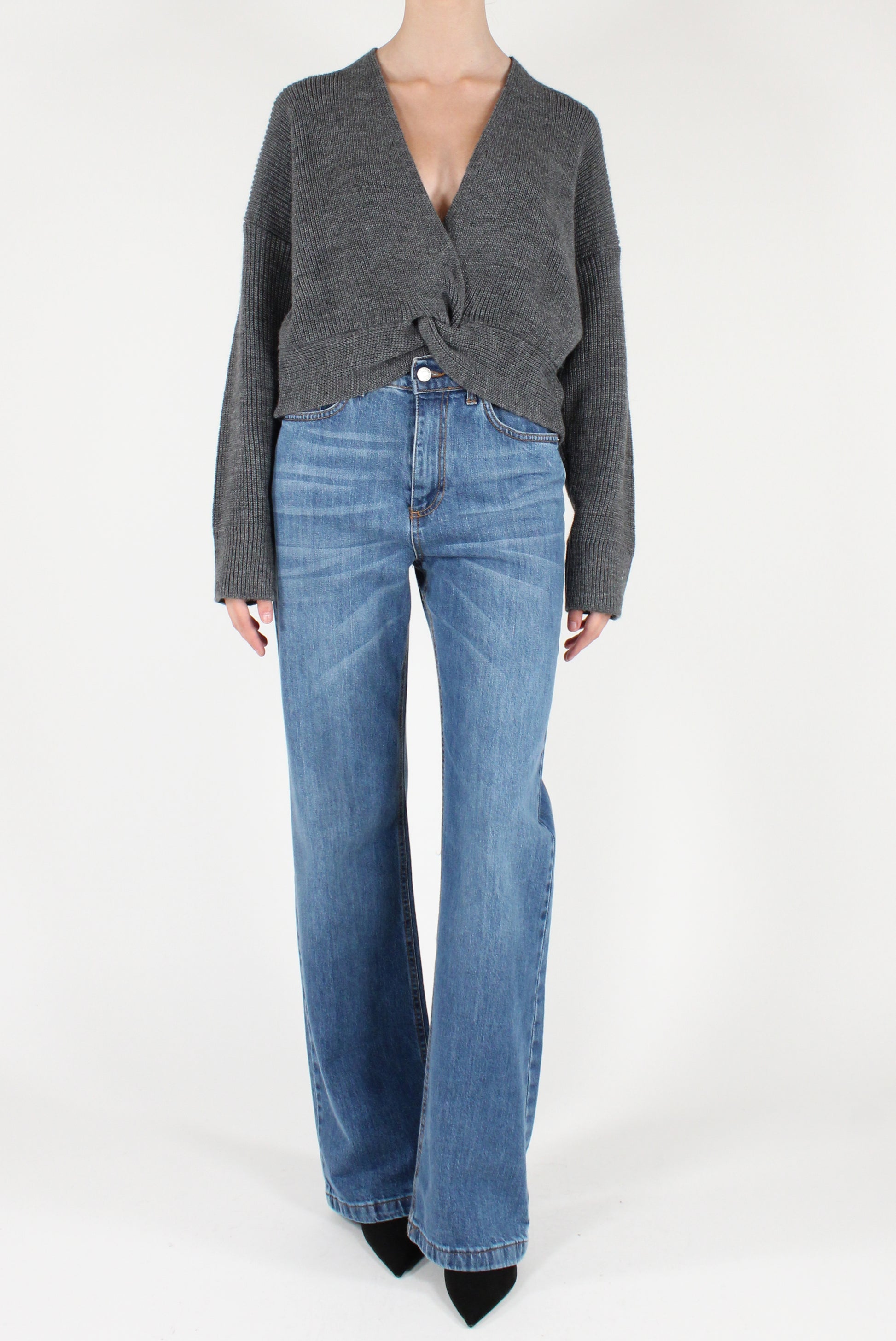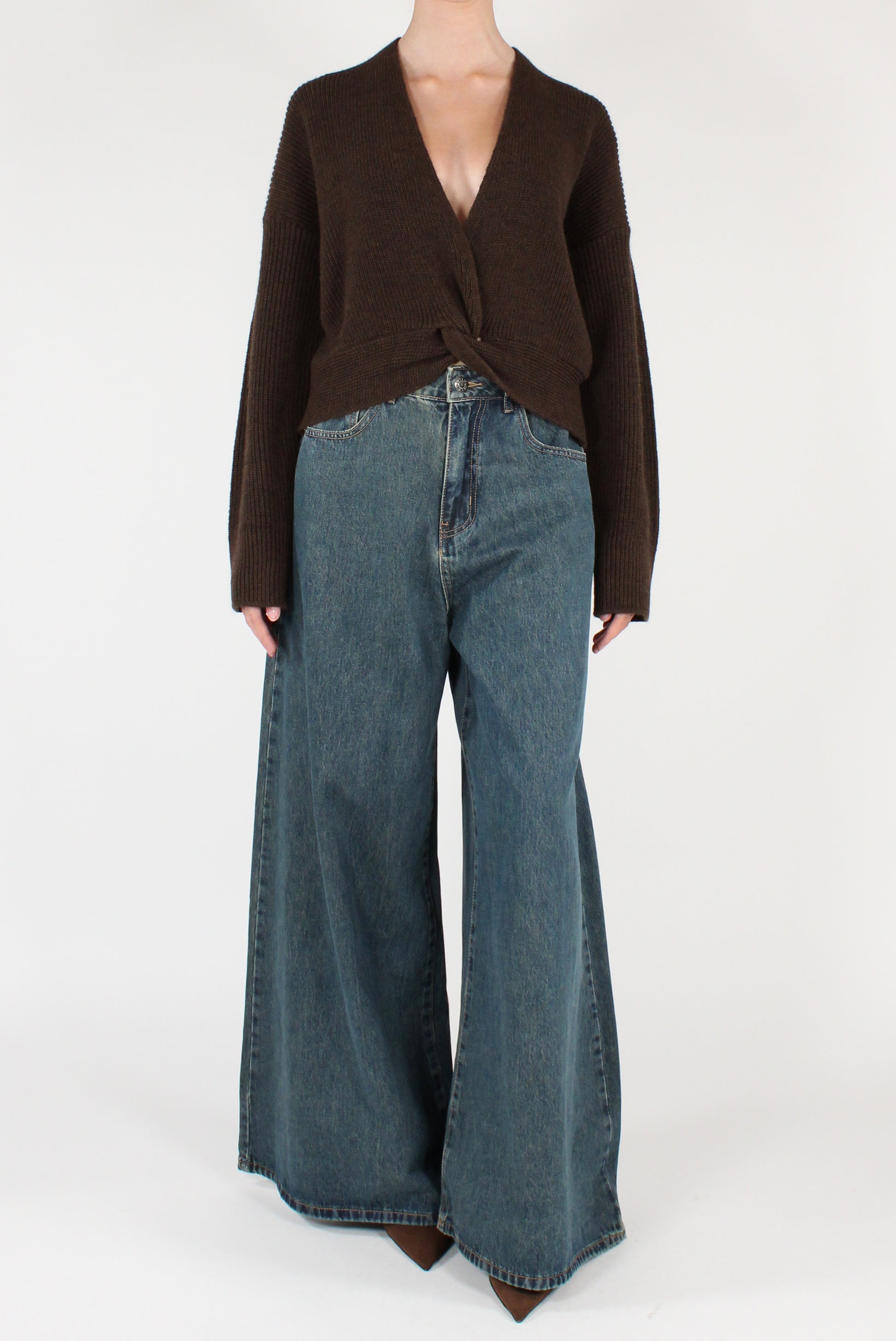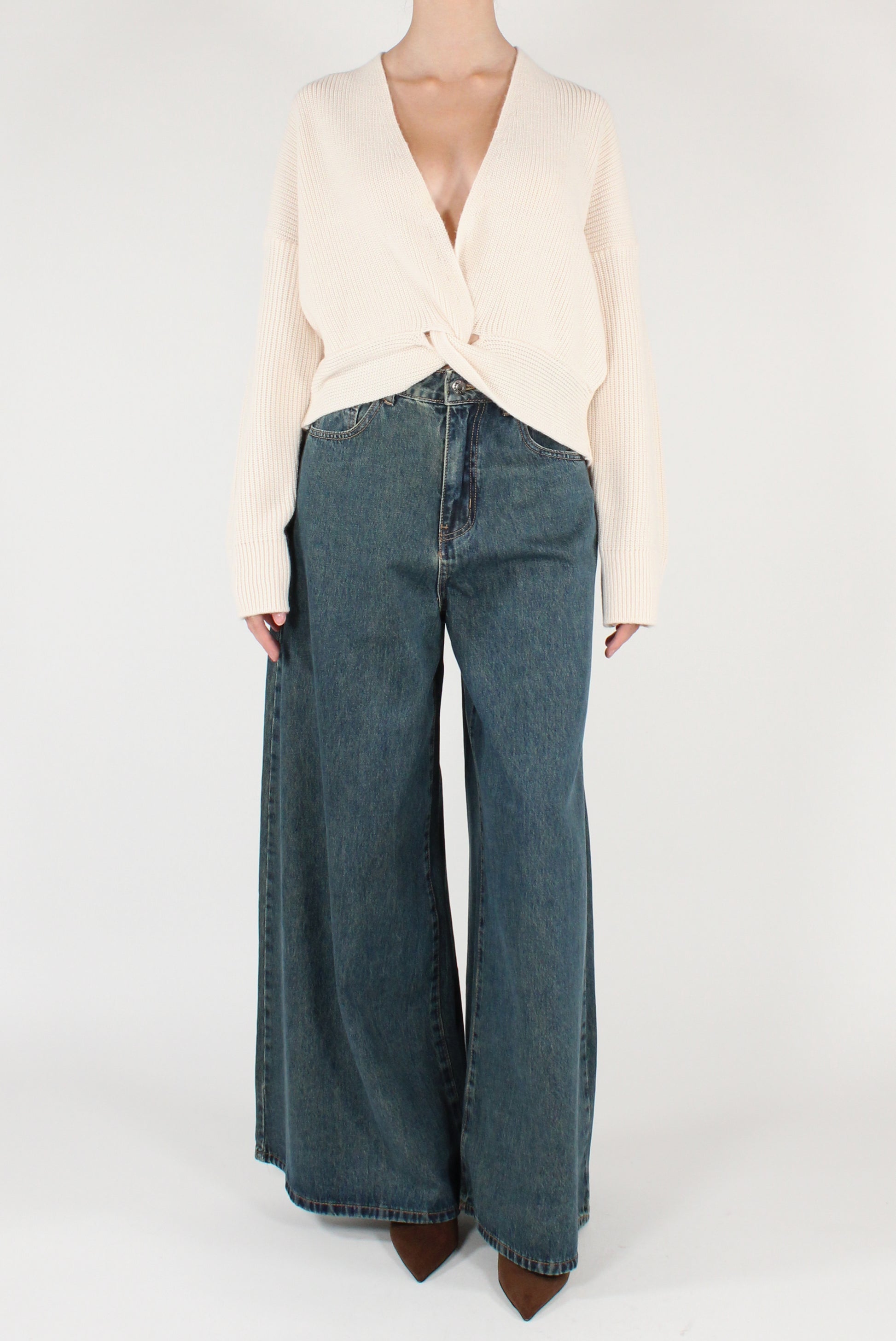 Maglione a scollo profondo incrociato in maglia a punto pannocchia. A maniche lunghe, taglio a scatoletta.