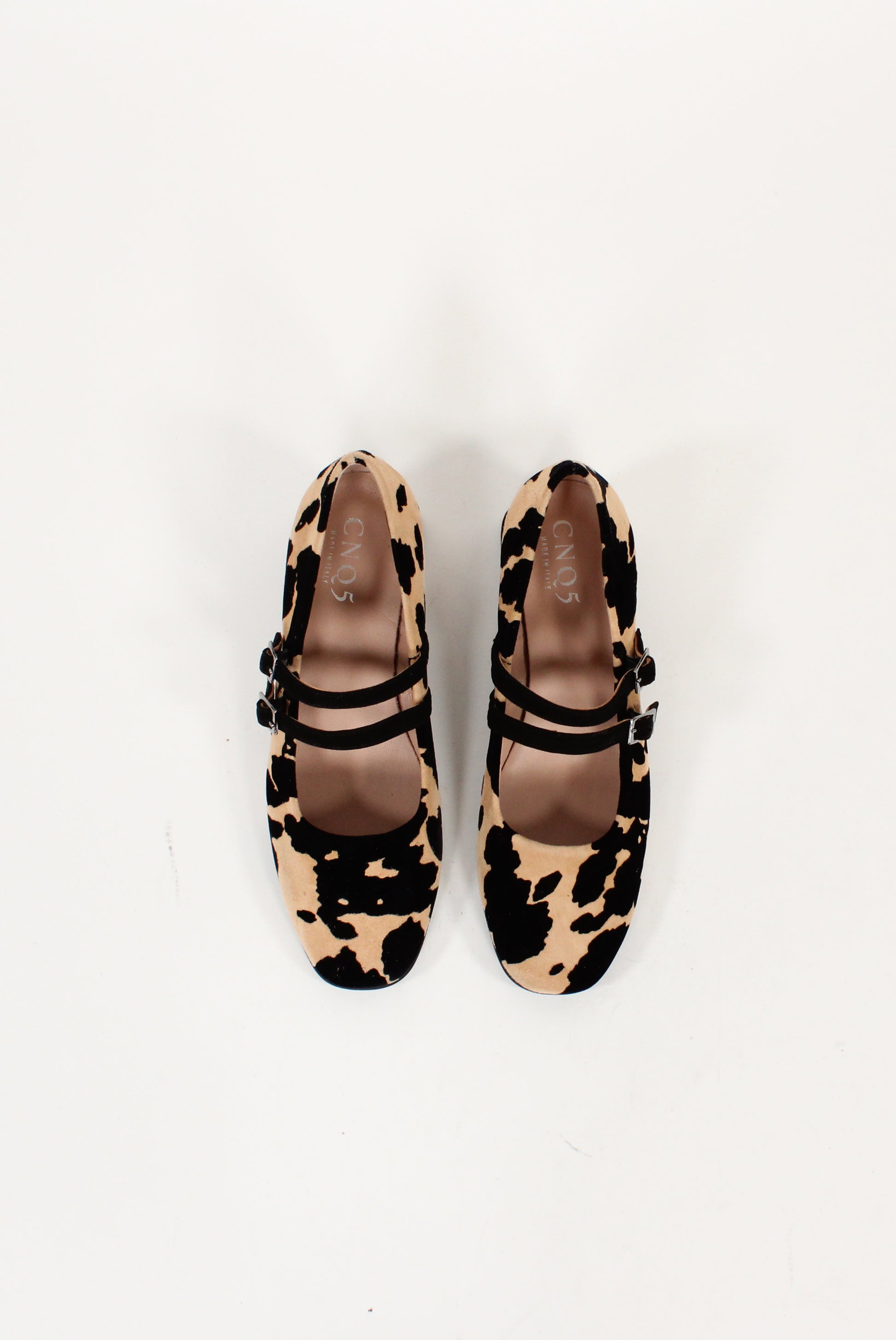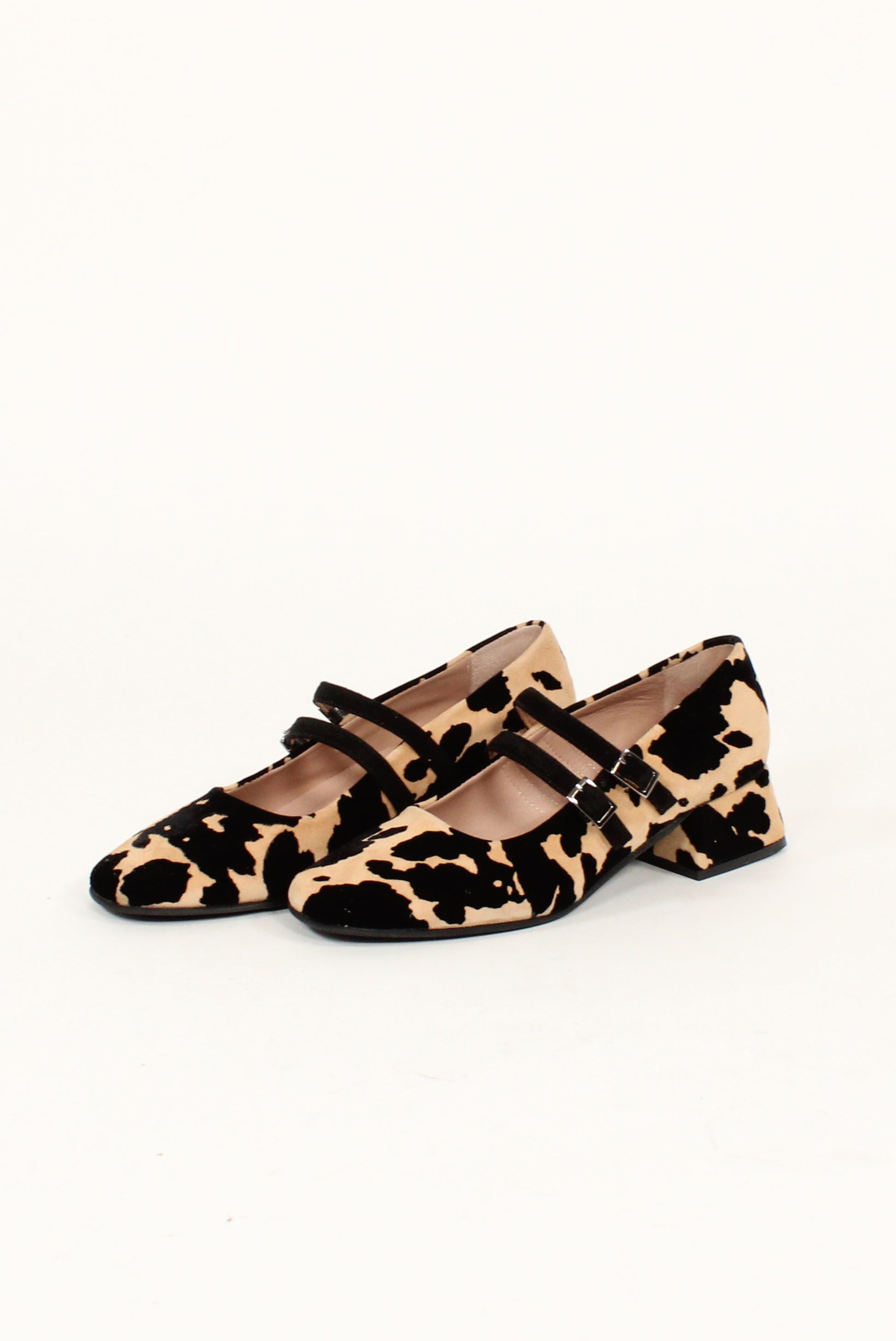 Mary jane con doppio cinturino regolabile in pelle muccata scamosciata. Punta tonda, tacco largo squadrato. Altezza tacco: 4 cm. Suola in gomma.