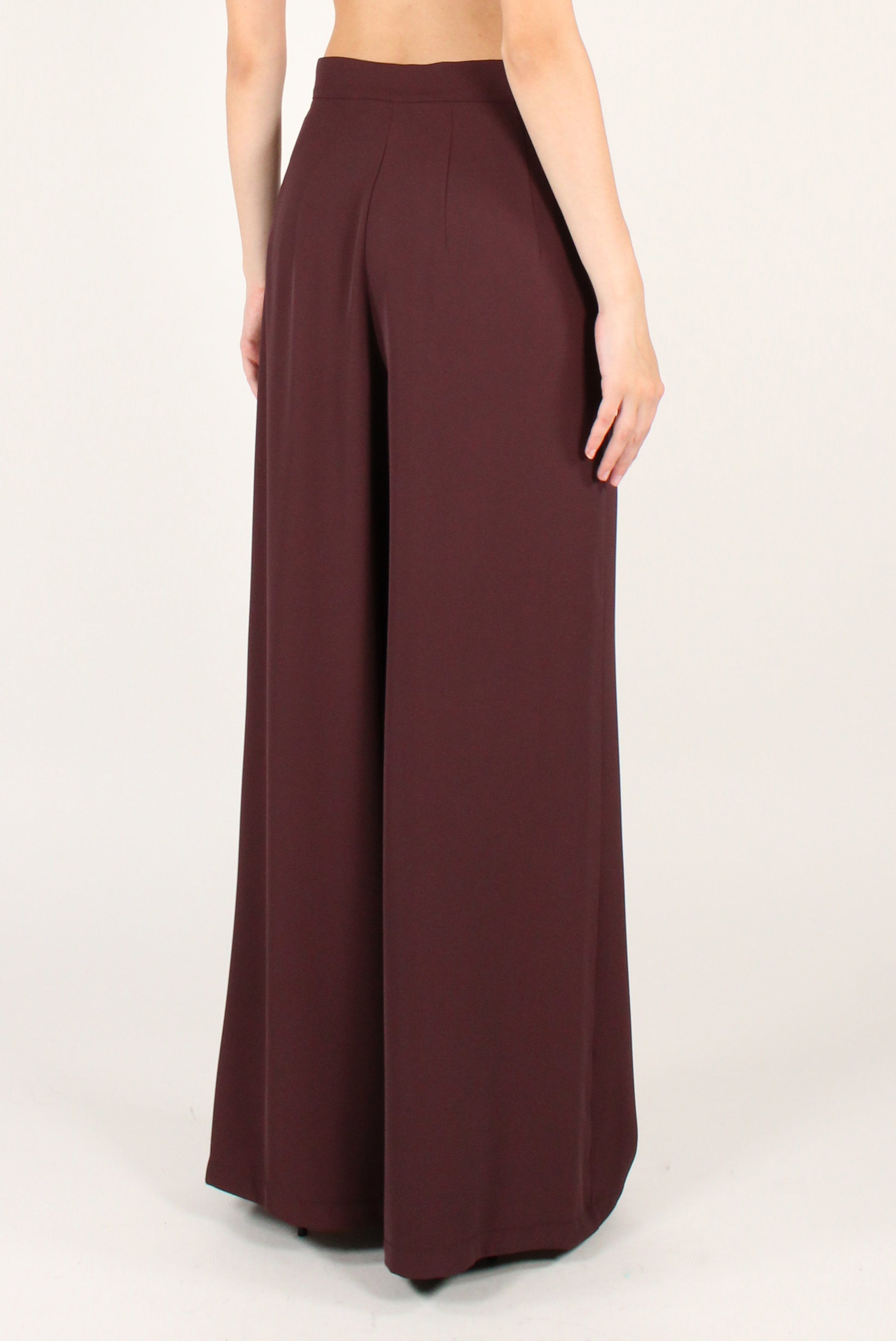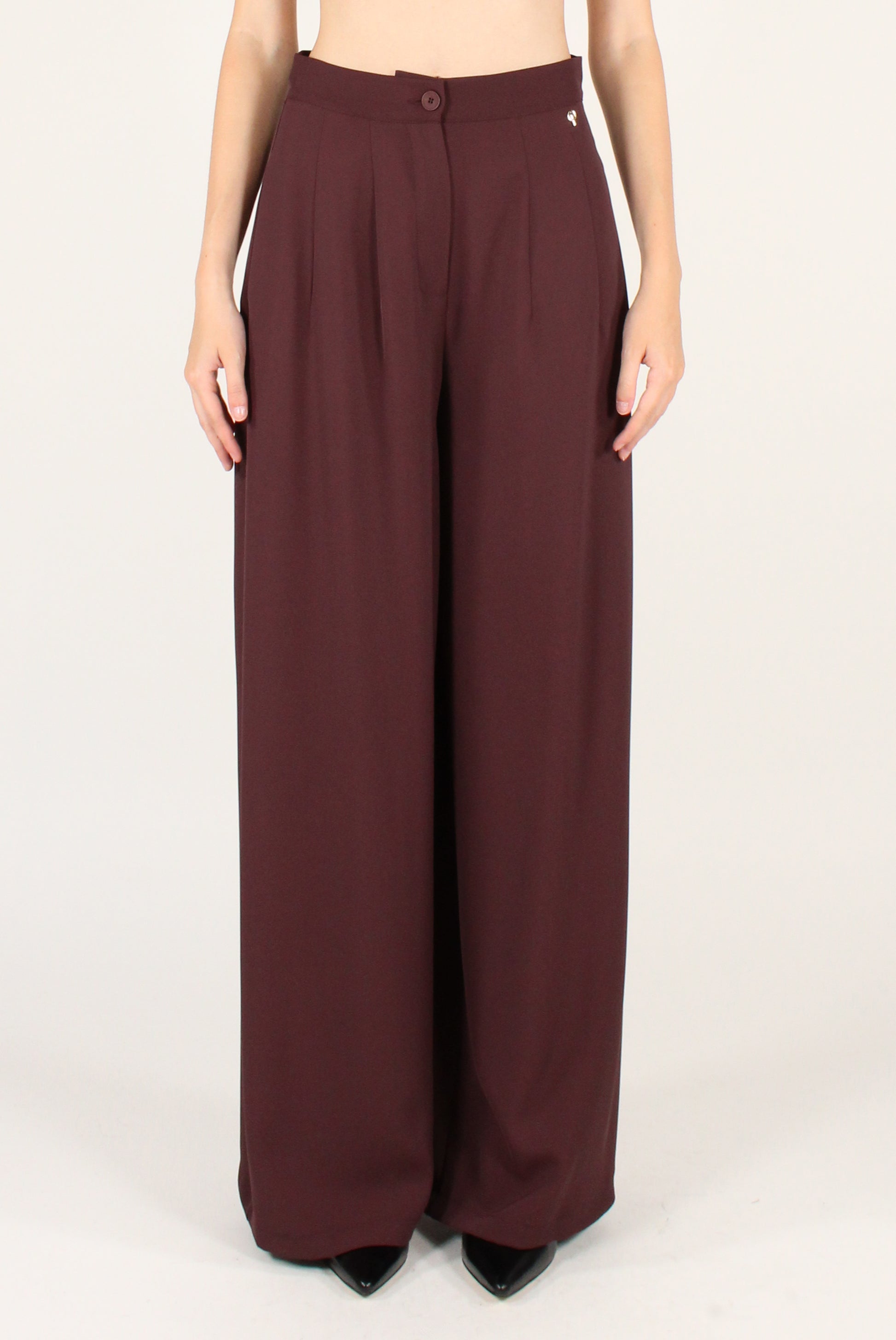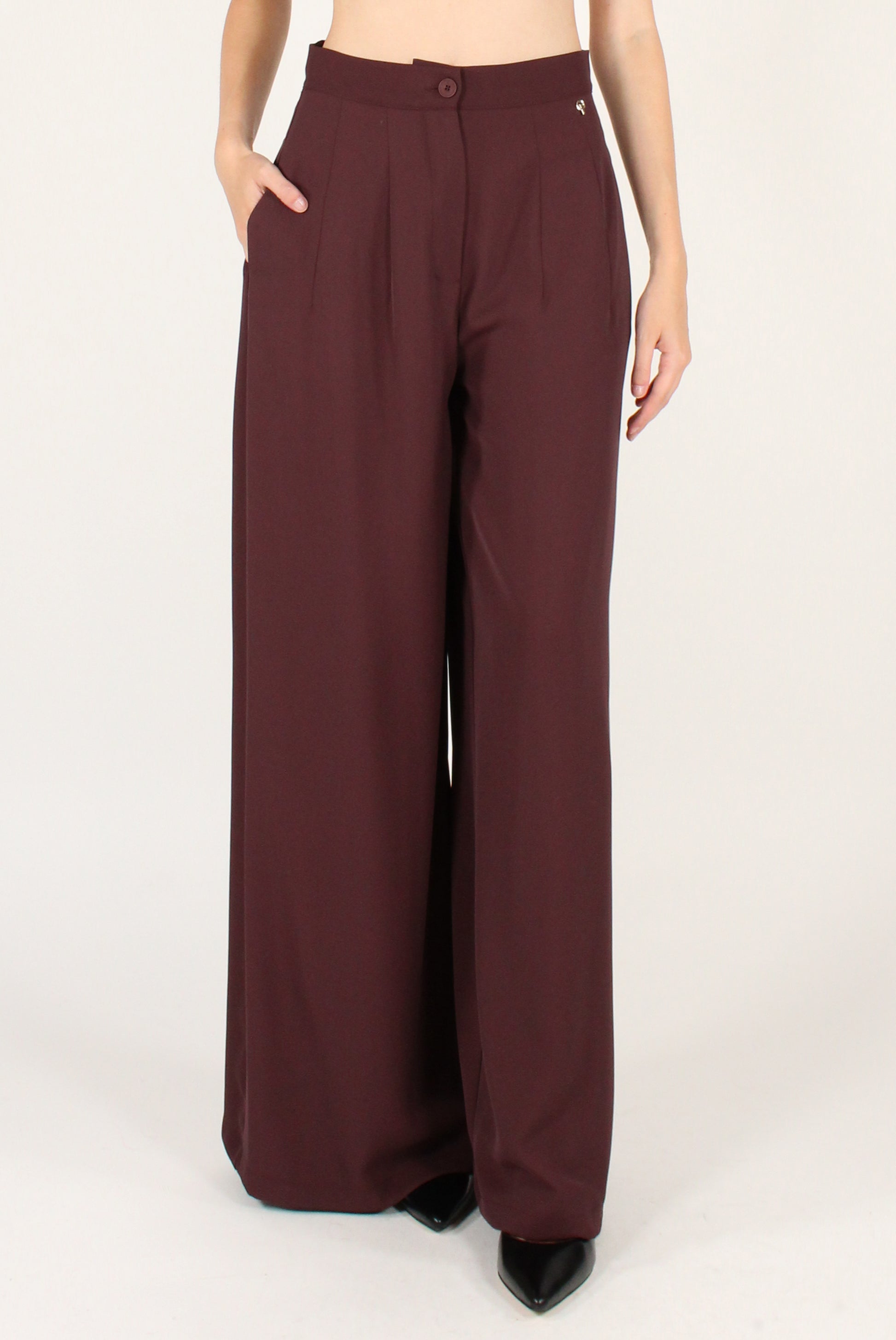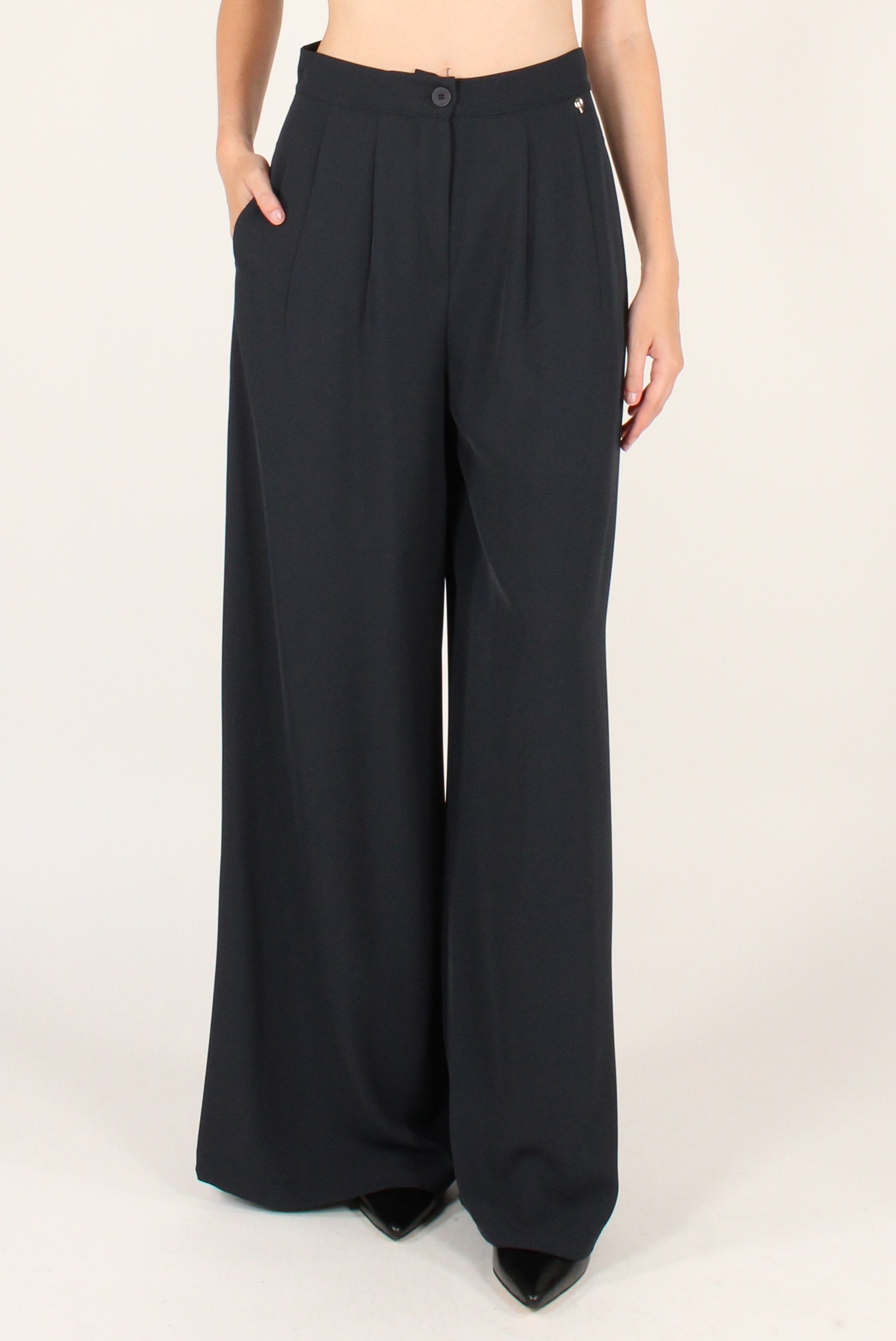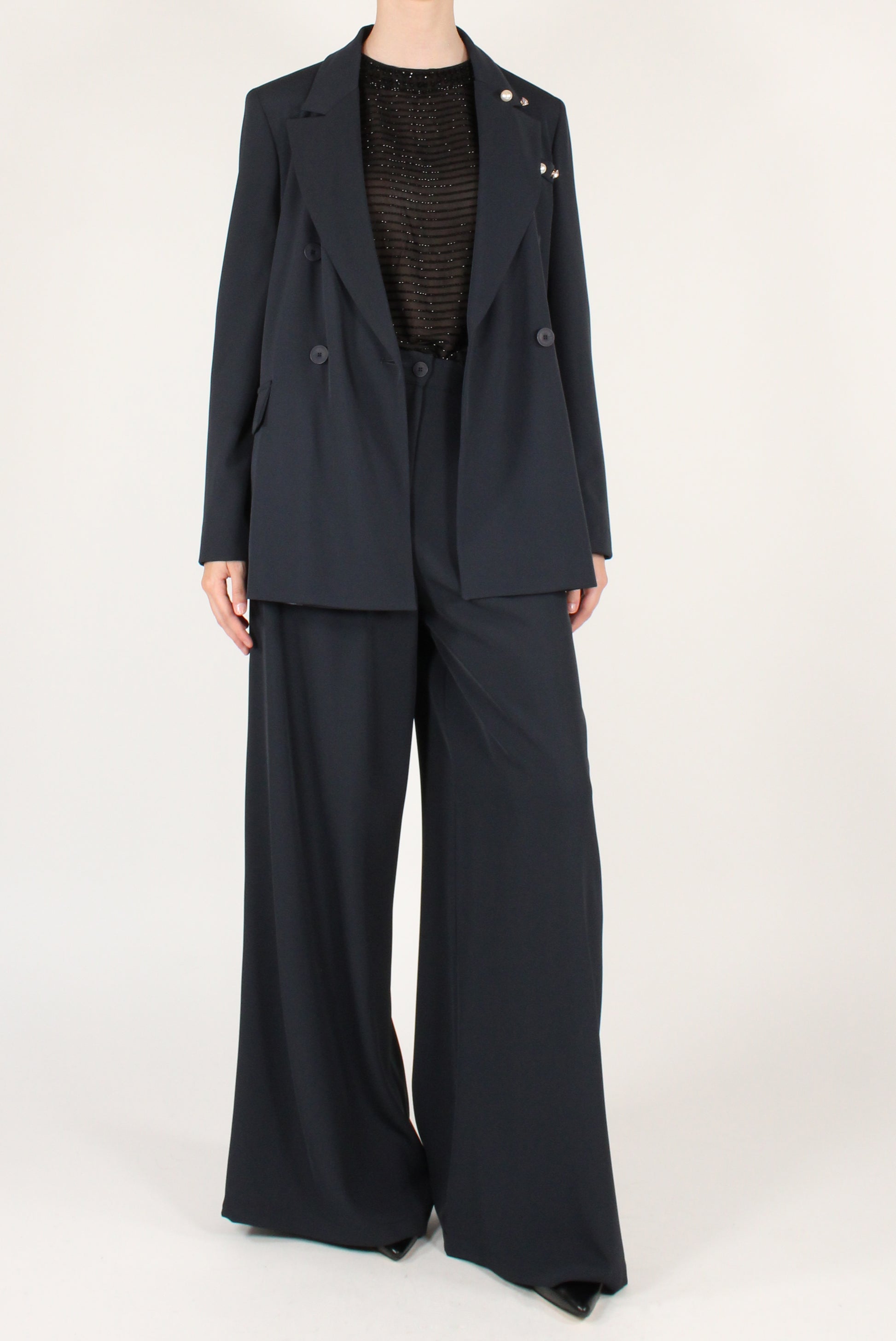 Pantaloni a palazzo con pinces, leggermente elasticizzati. Con tasche laterali e chiusura a zip e bottone. Blazer doppiopetto coordinato disponibile.