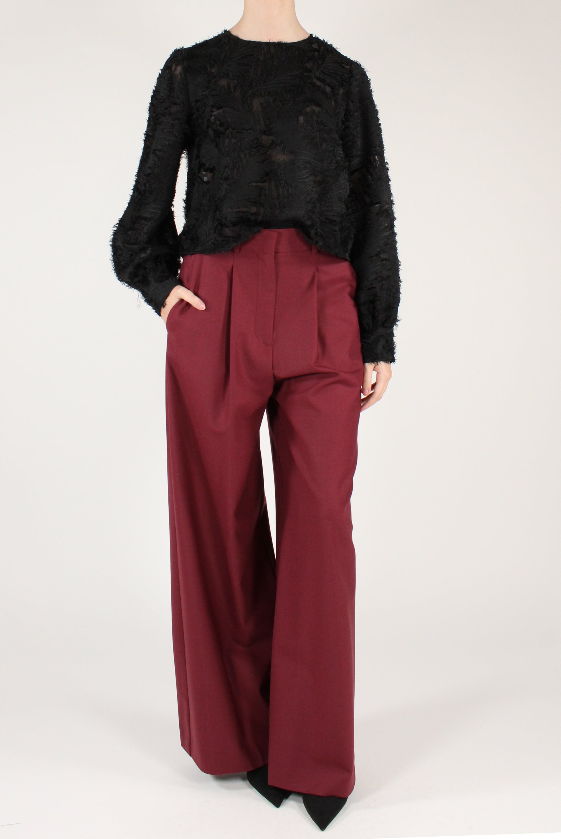 Pantaloni a palazzo con pinces in misto lana. Con tasche laterali, chiusura a zip, clip e bottone interno, con passanti. Dettaglio taschino a filetto sul retro. Leggermente elasticizzati.