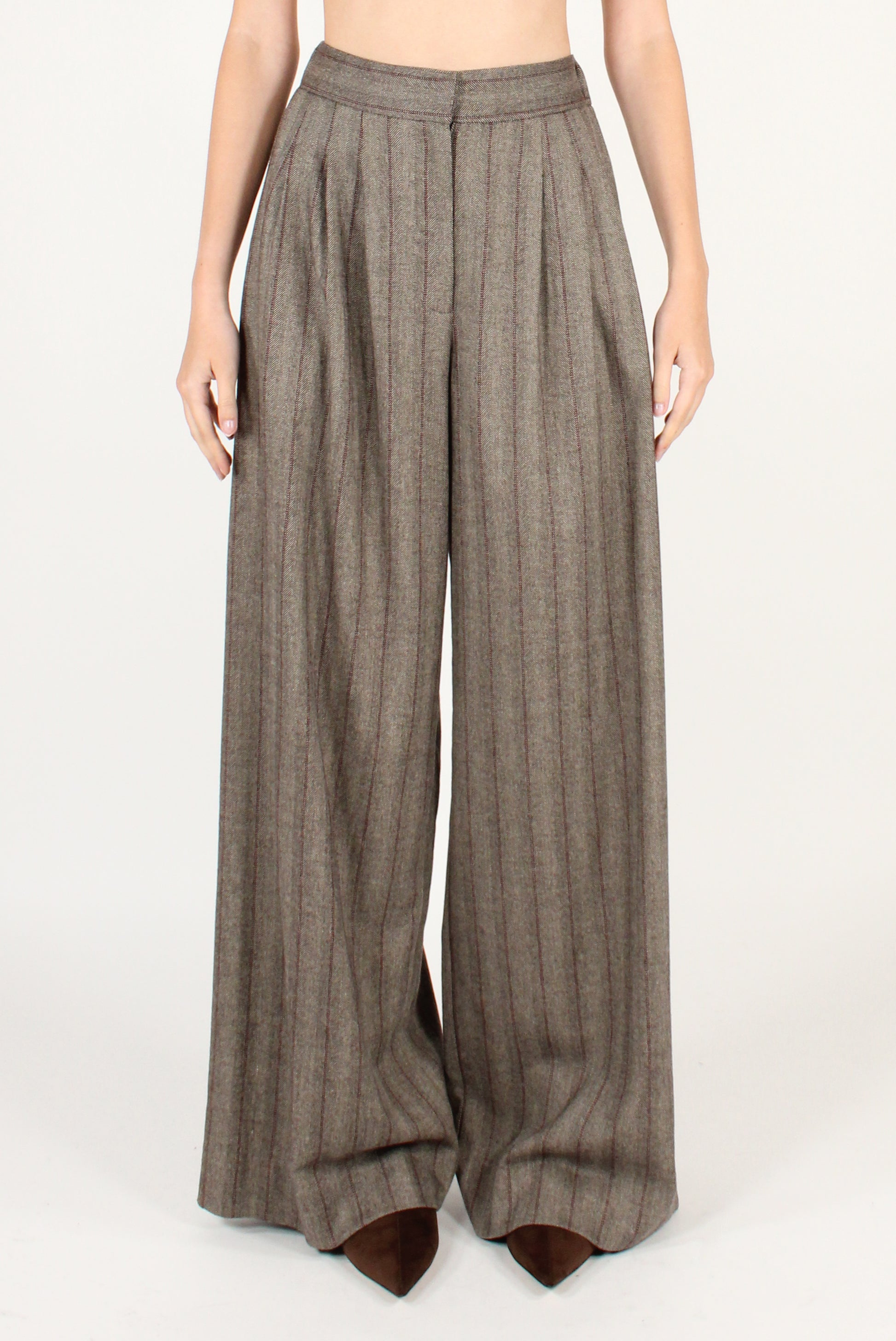 Pantaloni a palazzo gessati con pinces in misto lana. Vestibilità ampia, con tasche laterali, chiusura a zip e gancetto, dettaglio elastico sul retro e finte tasche a filetto. Blazer over coordinato disponibile.