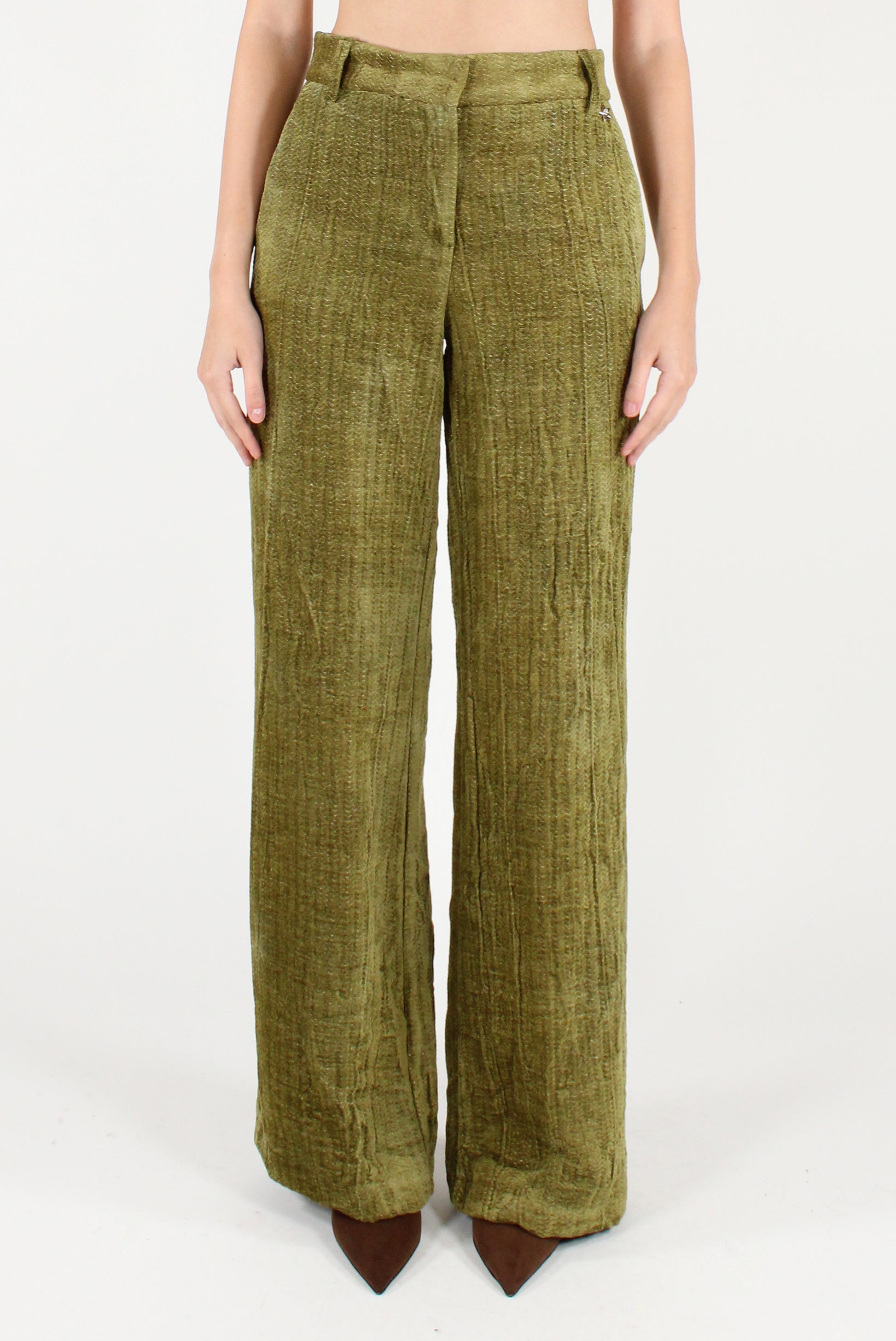 Pantaloni a palazzo in velluto spigato effetto stropicciato. Con tasche laterali, chiusura a zip, clip e bottone interno, con passanti e finte tasche a filetto sul retro. Giacca over coordinata disponibile.