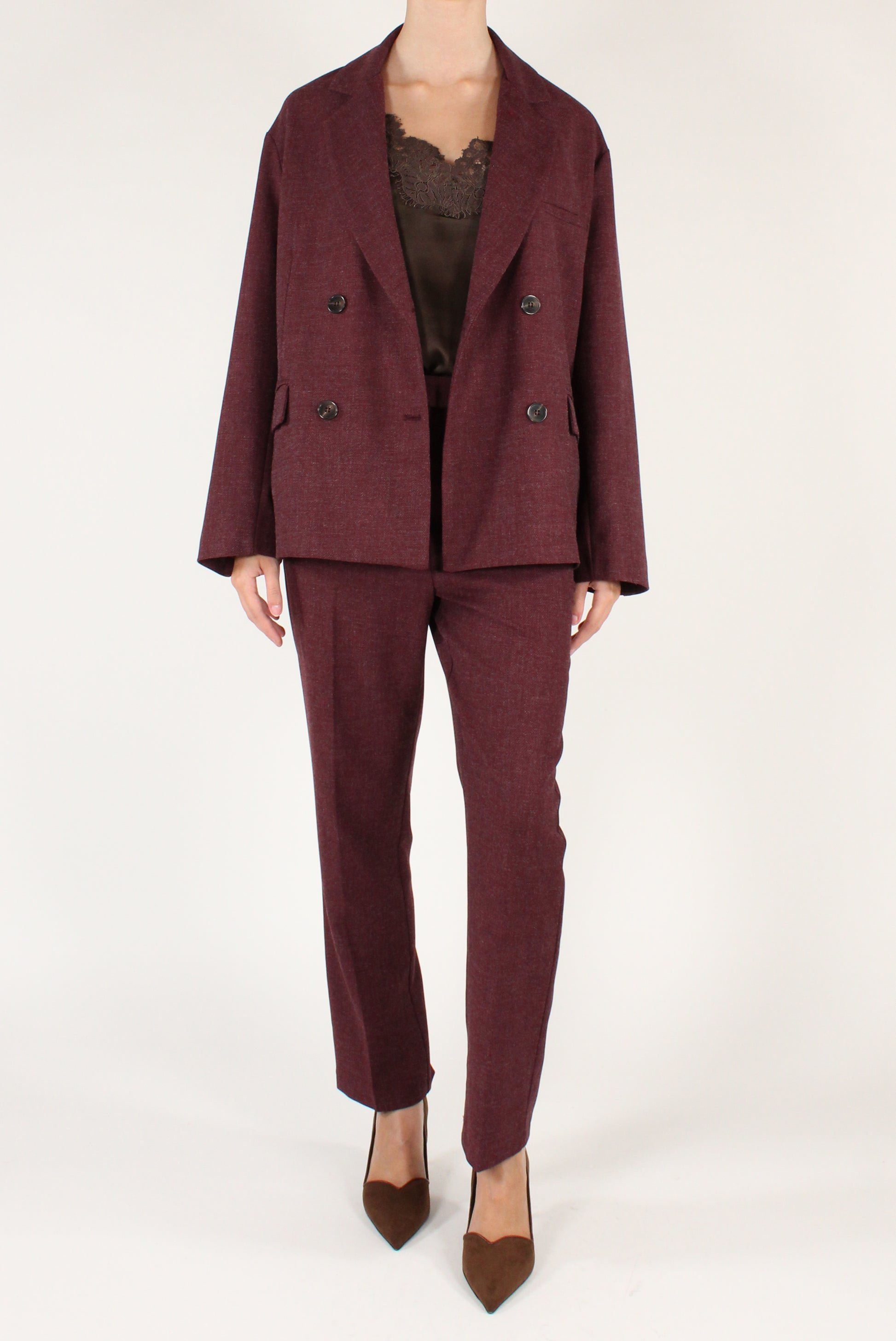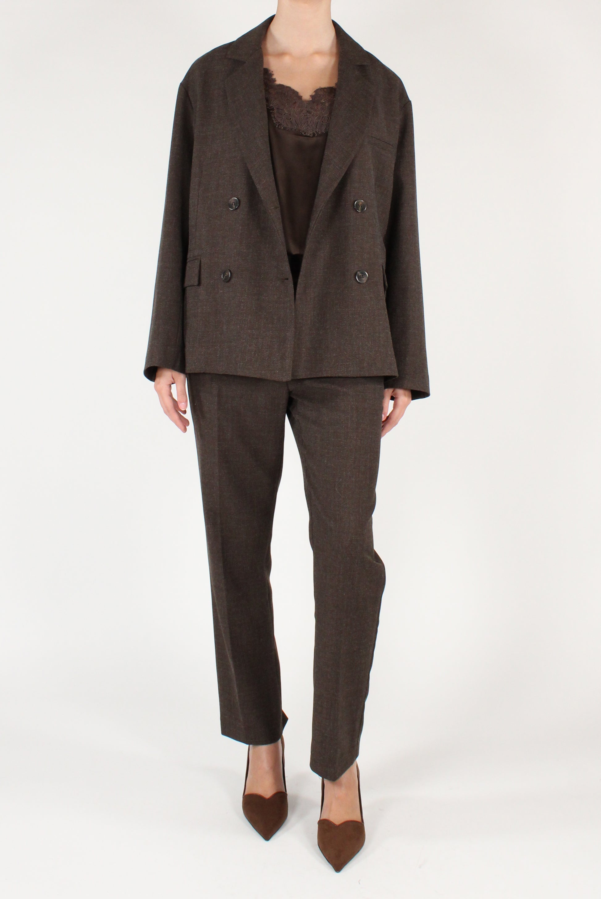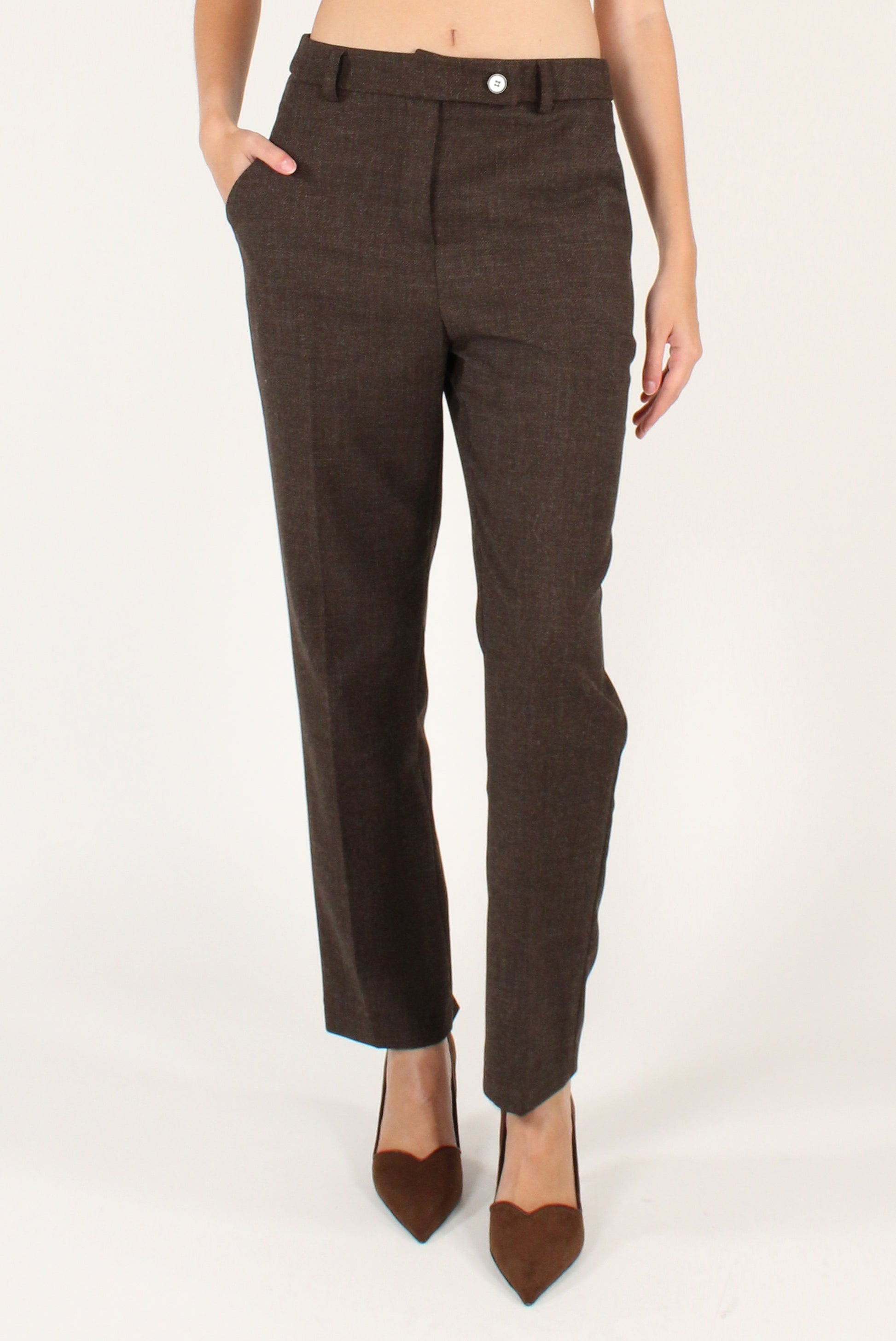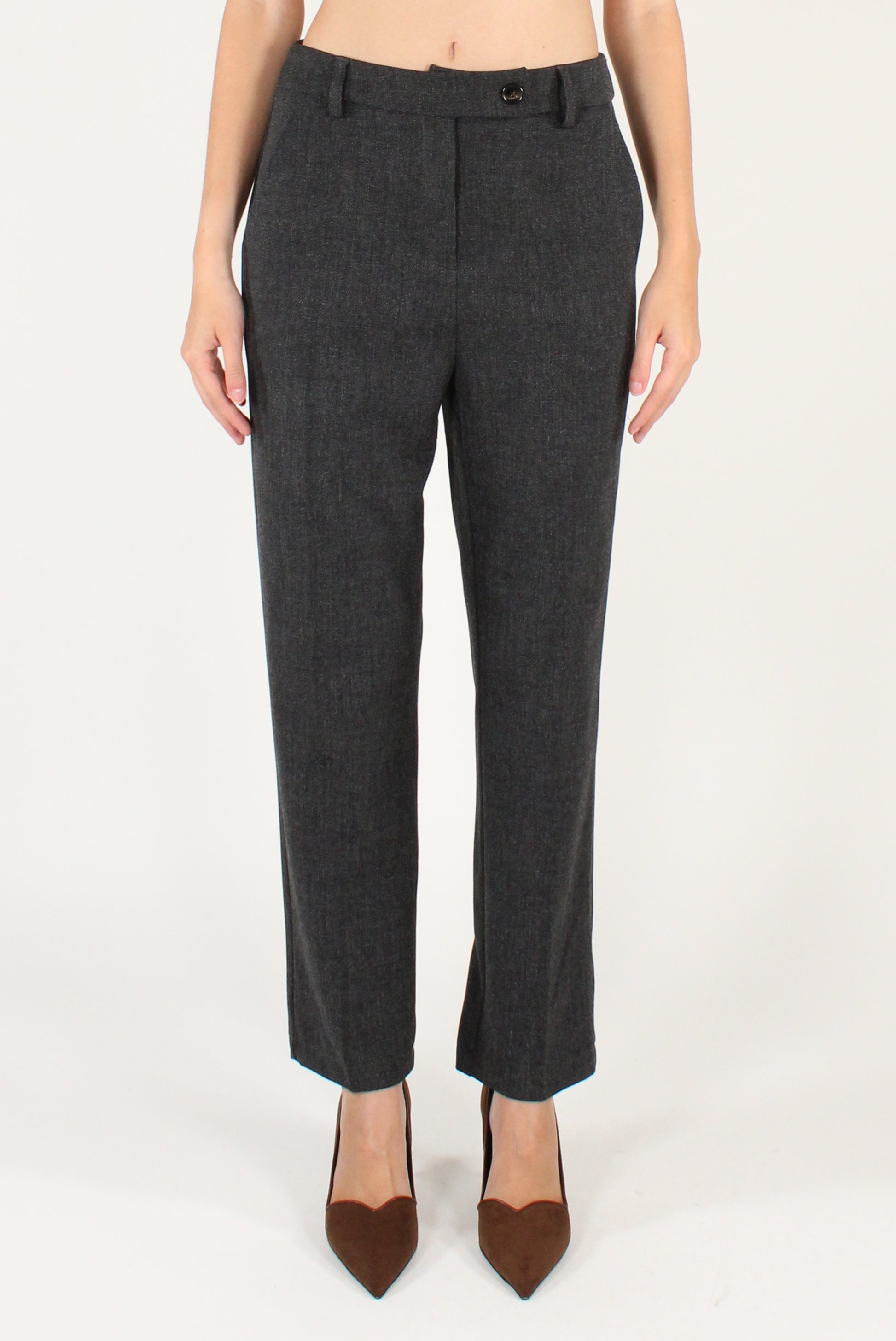 Pantaloni a sigaretta mélange leggermente elasticizzati. Con tasche laterali e finte tasche a filetto sul retro. Chiusura a zip e doppio bottone, uno interno. Giacca doppiopetto coordinata disponibile.