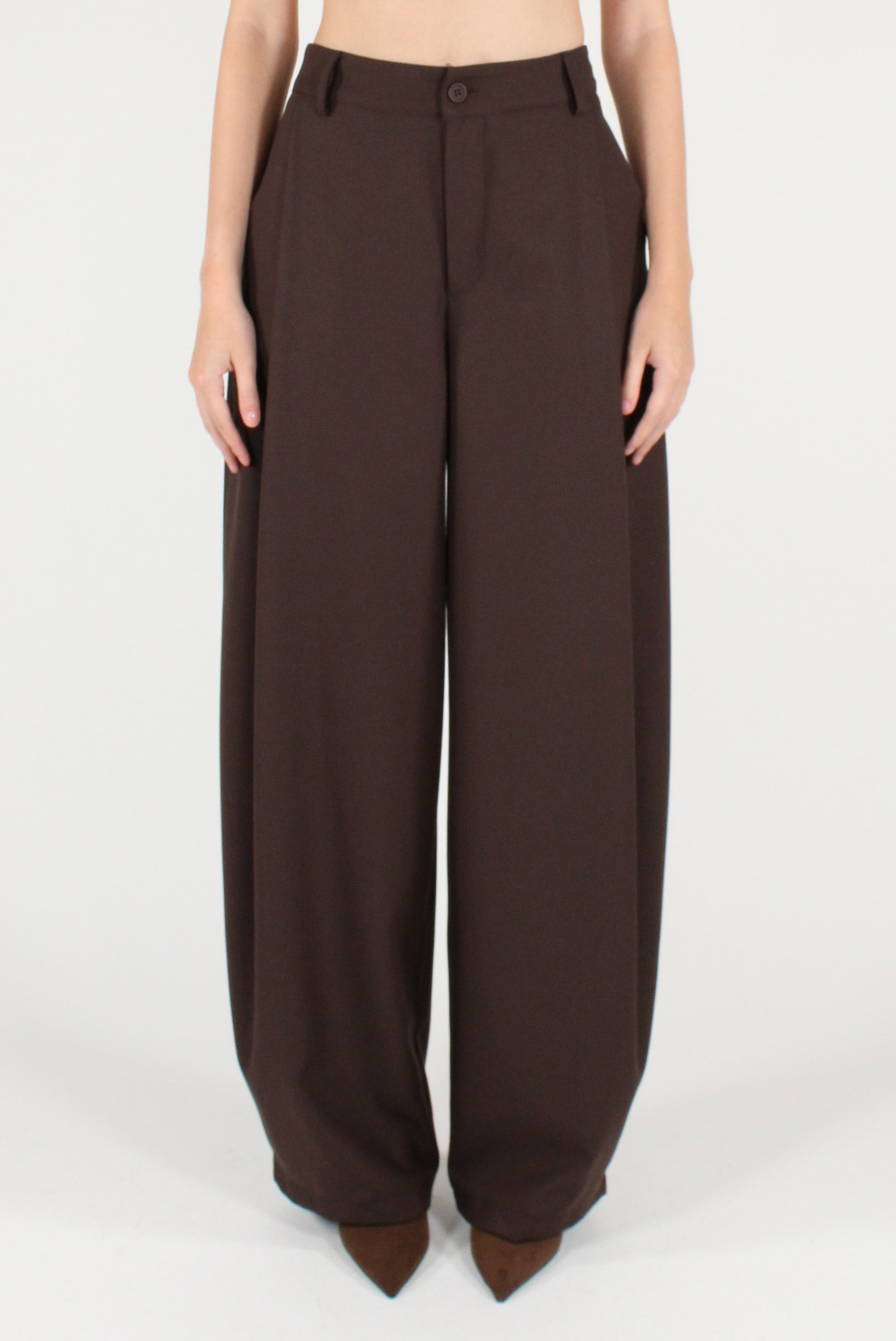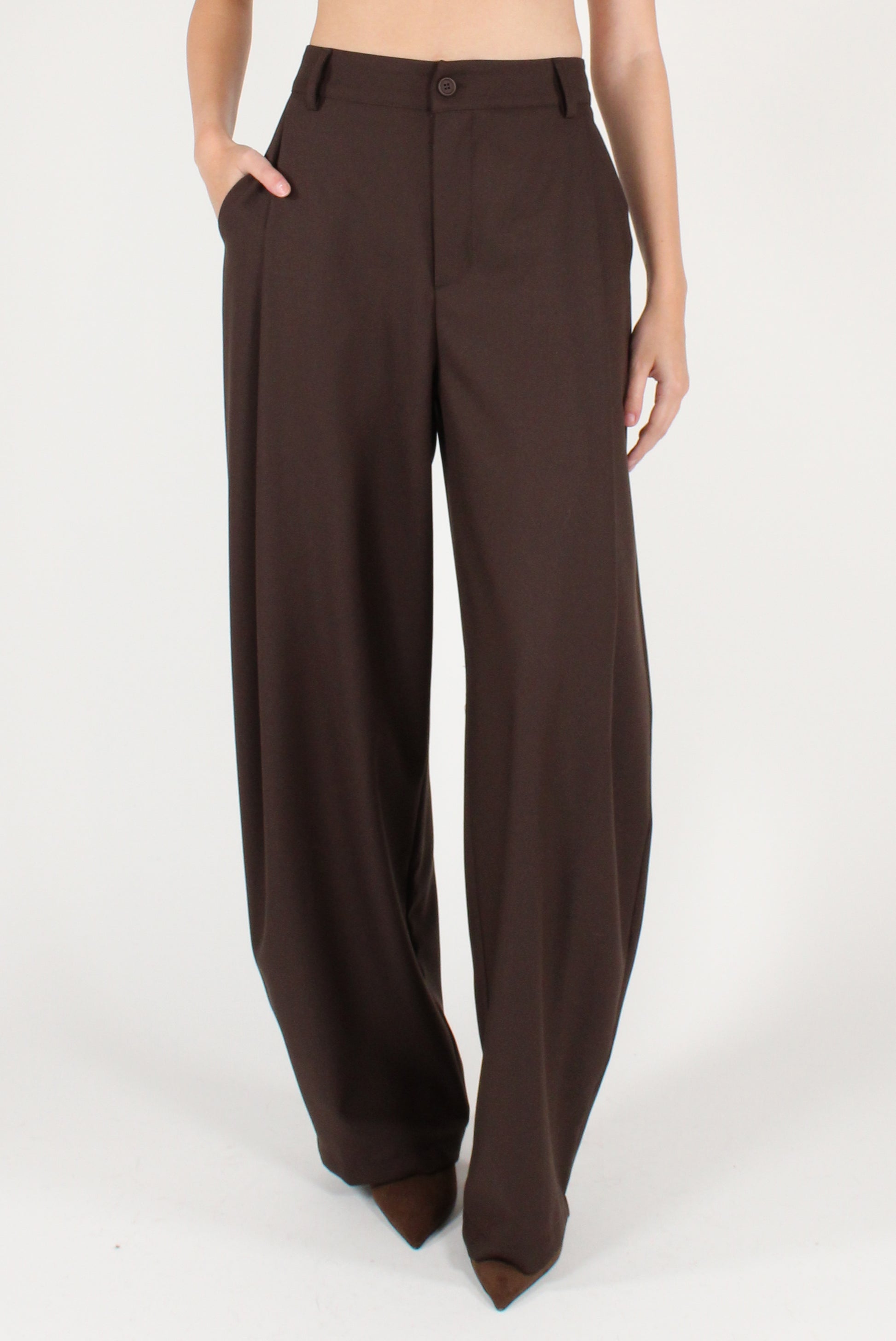 Pantaloni balloon con pinces, tasche laterali e tasche sul retro. Vestibilità ampia, chiusura a zip e bottone, con passanti.