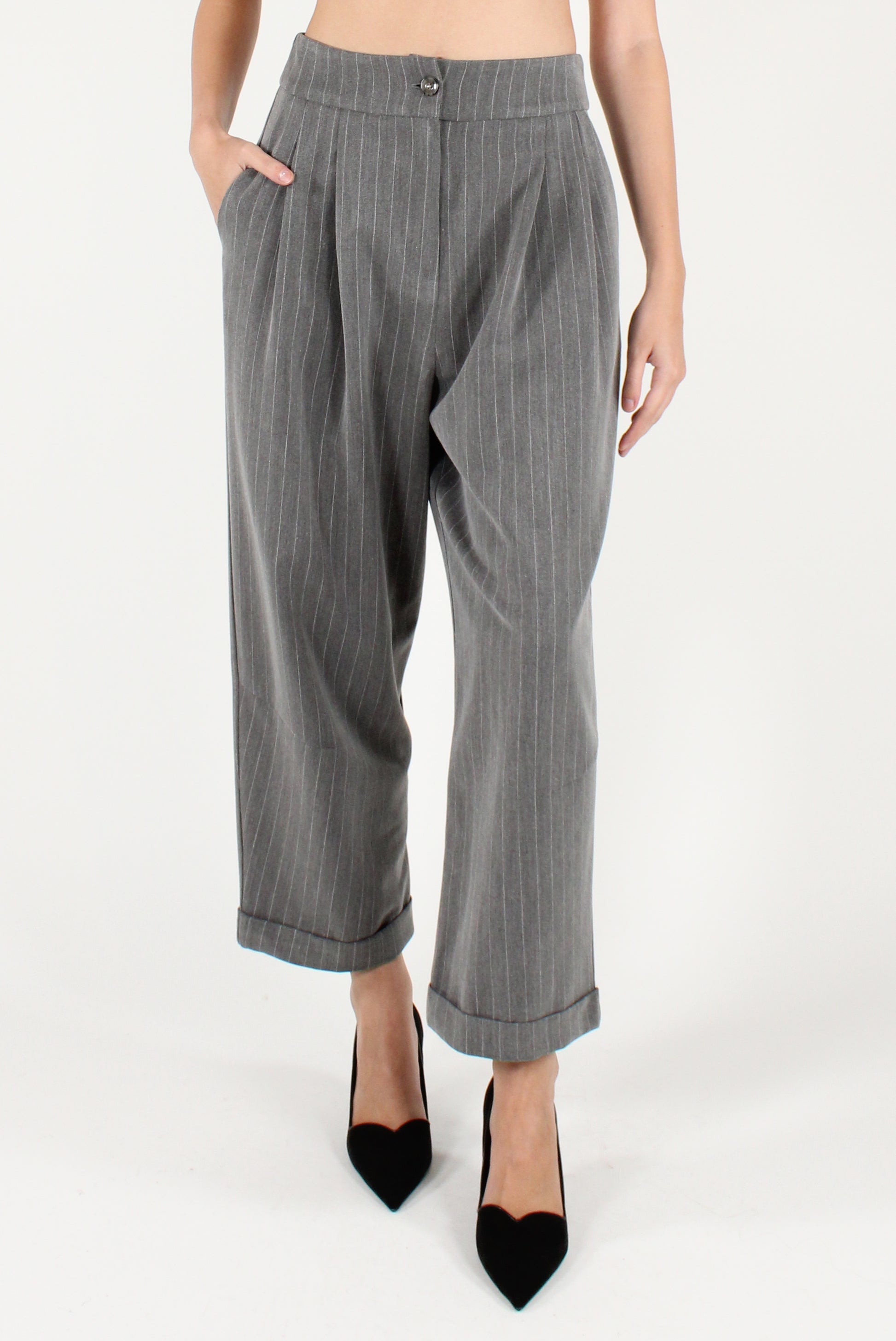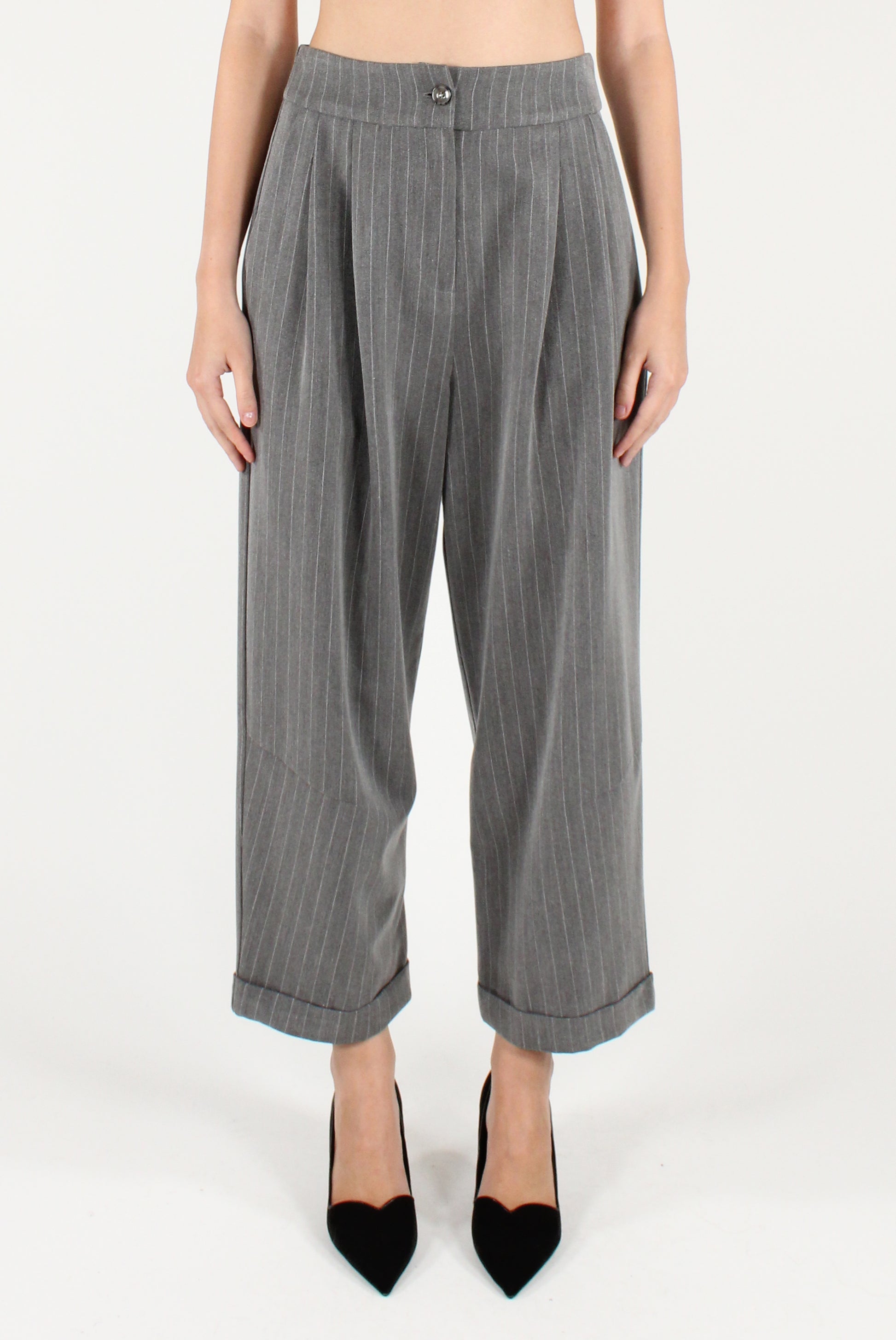 Pantaloni balloon gessati con pinces sul davanti. Leggermente elasticizzati, con tasche laterali, chiusura a zip e bottone. Dettaglio risvolto e cuciture a vista.