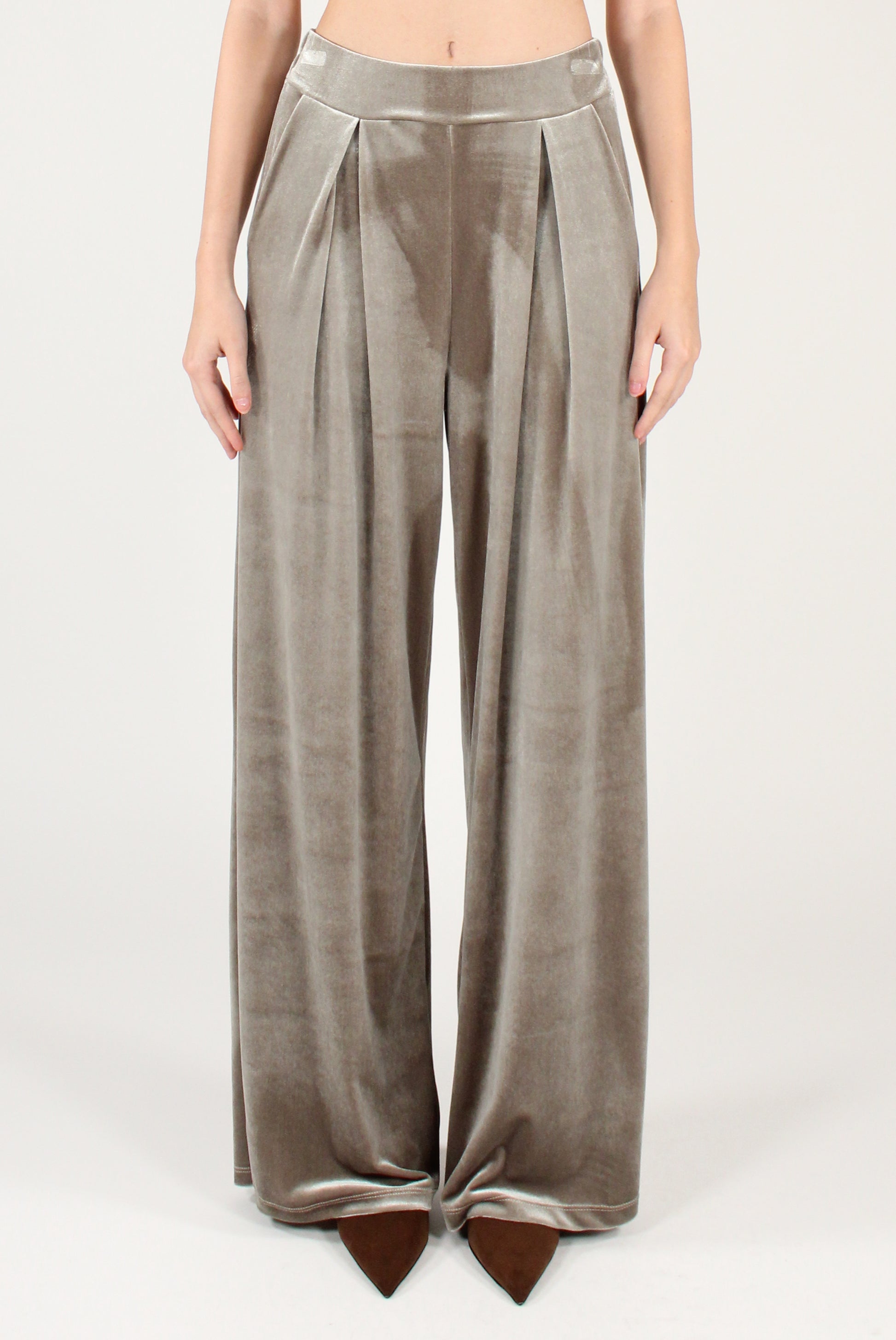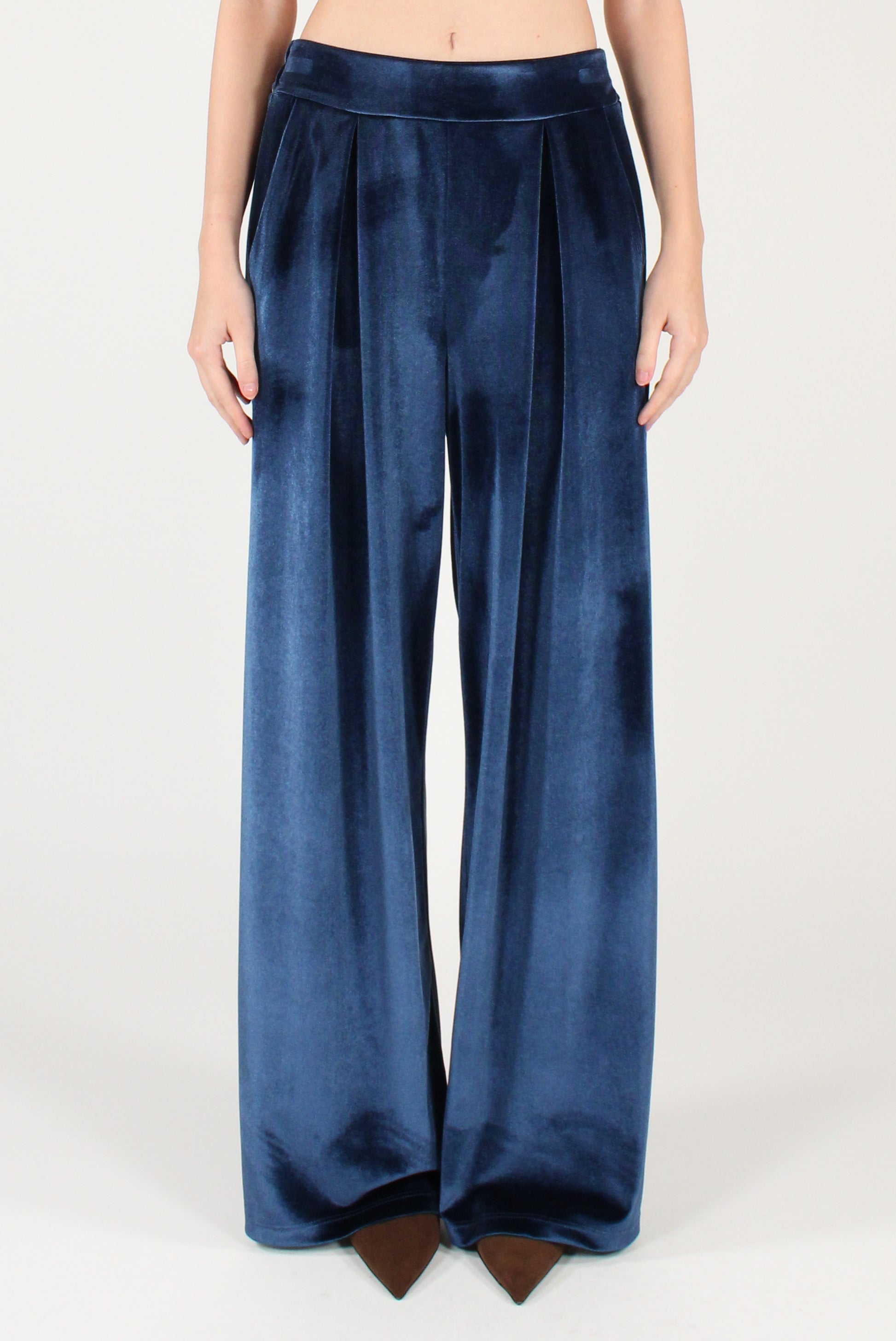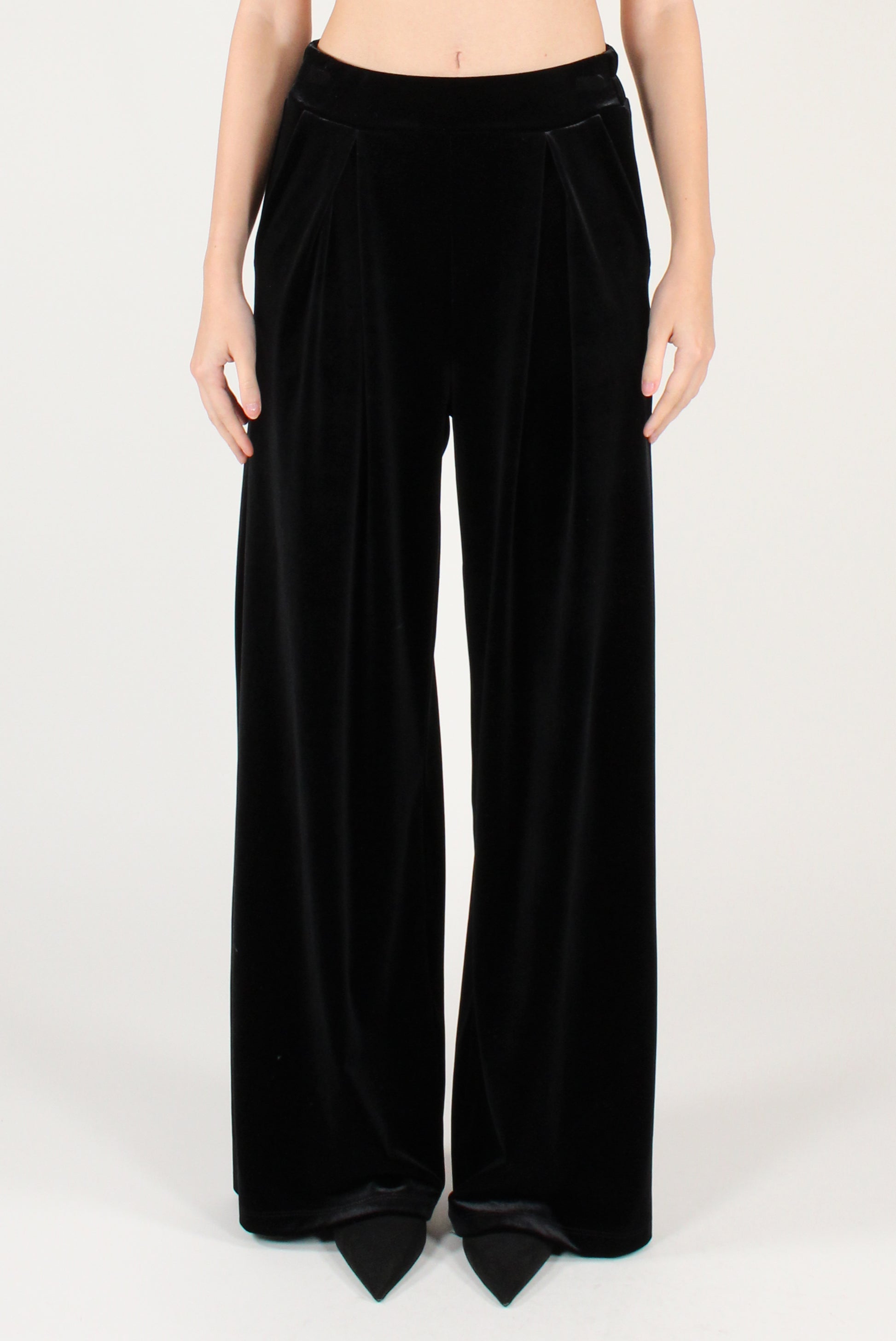 Pantaloni con pinces in velluto liscio elasticizzato. A palazzo, con tasche laterali ed elastico in vita solo sul retro. Top e giacca coordinati disponibili.